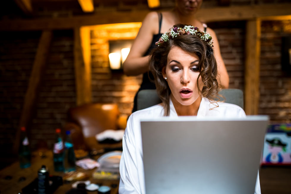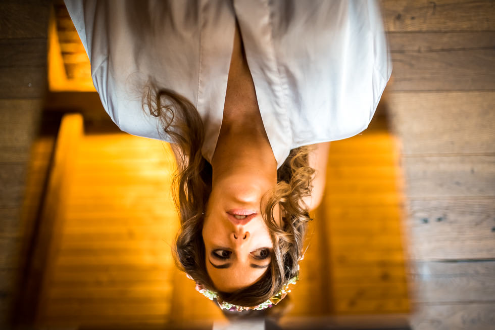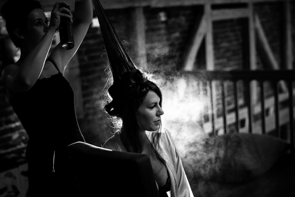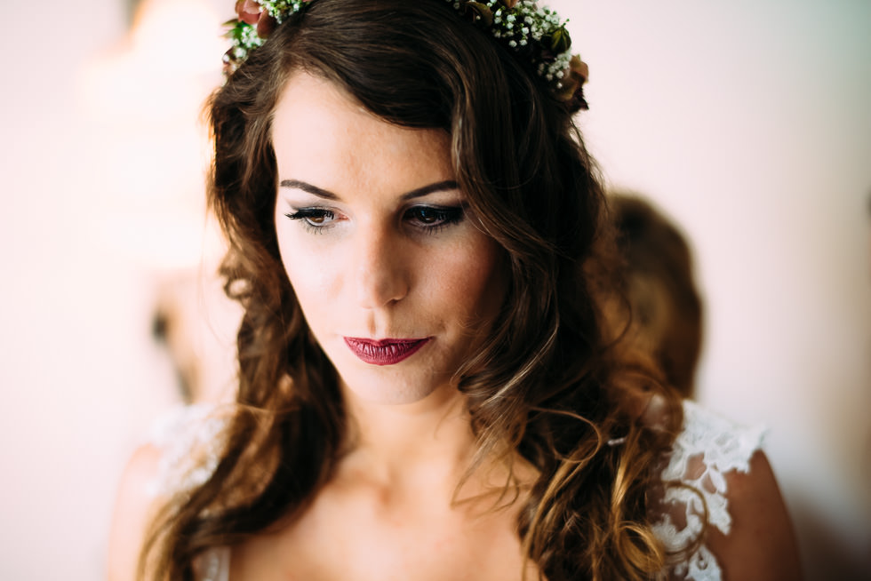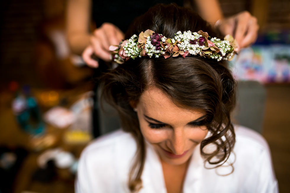 Die gesamte Hochzeit fand im Hofgut Dagobertshausen statt. Ebenso wie das getting ready. Das Brautstyling wurde auf der oberen Galerie der Scheune durchgeführt. Eigentlich ein sehr schöner Platz dafür. Da man die ganze Zeit einen Blick auf das Dekorieren der Tische werfen konnte. Der Bräutigam, der ja die Braut in der Zeit nicht sehen durfte, befand sich in einem der Gästezimmer. Die Braut selbst ist ebenso Stylistin und oft damit beschäftigt Bräute zu stylen.