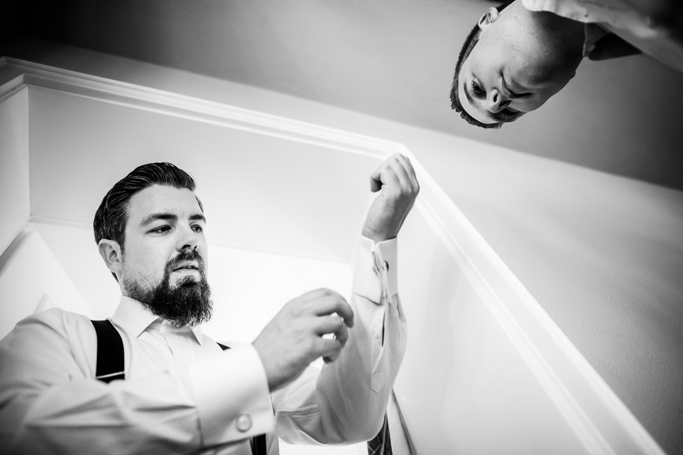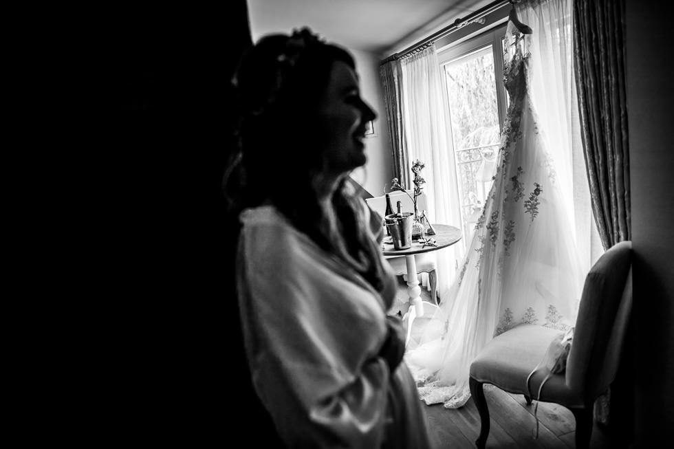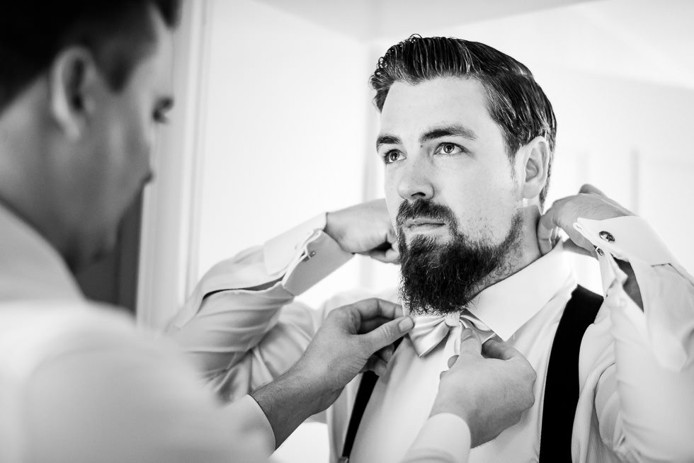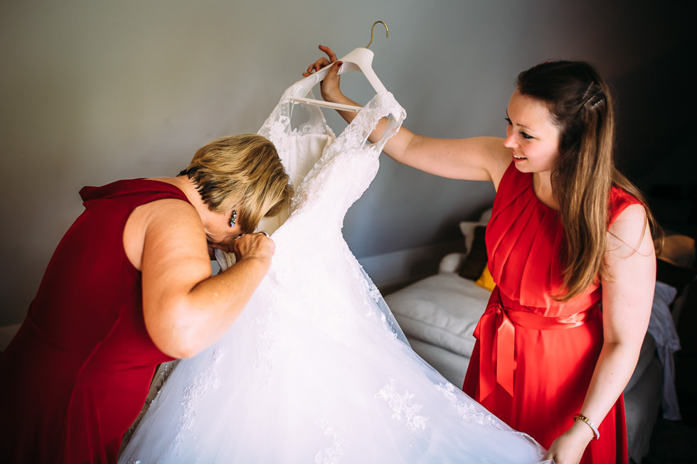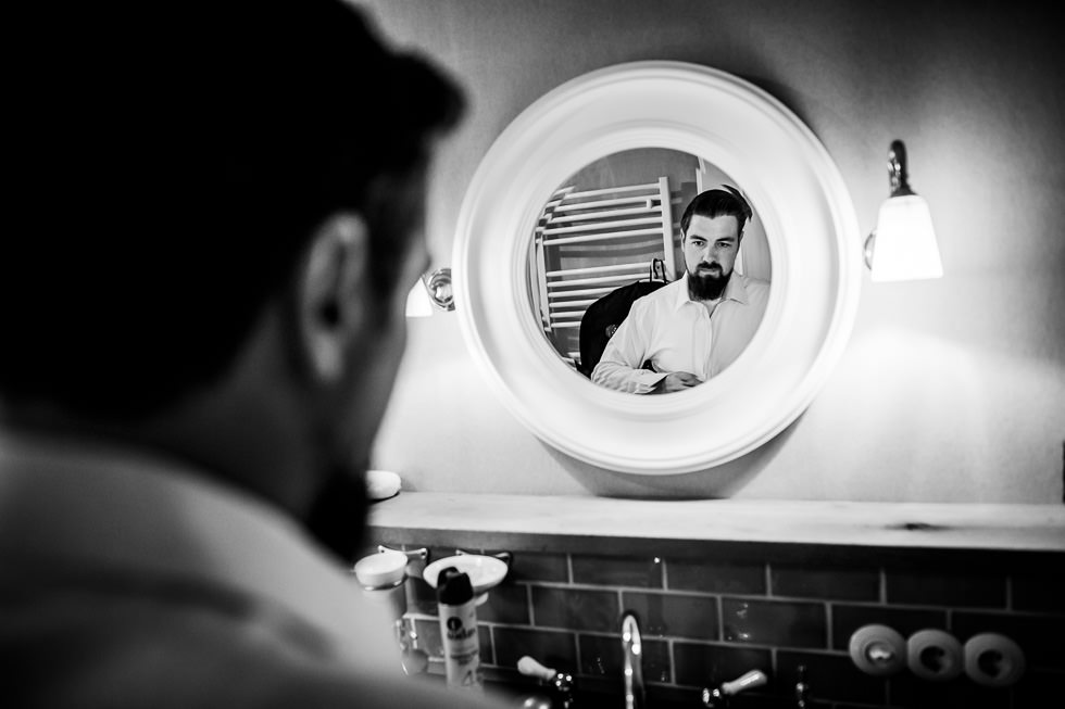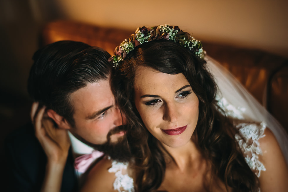 Die gesamte Hochzeit fand im Hofgut Dagobertshausen statt. Ebenso wie das getting ready. Das Brautstyling wurde auf der oberen Galerie der Scheune durchgeführt. Eigentlich ein sehr schöner Platz dafür. Da man die ganze Zeit einen Blick auf das Dekorieren der Tische werfen konnte. Der Bräutigam, der ja die Braut in der Zeit nicht sehen durfte, befand sich in einem der Gästezimmer. Die Braut selbst ist ebenso Stylistin und oft damit beschäftigt Bräute zu stylen.
