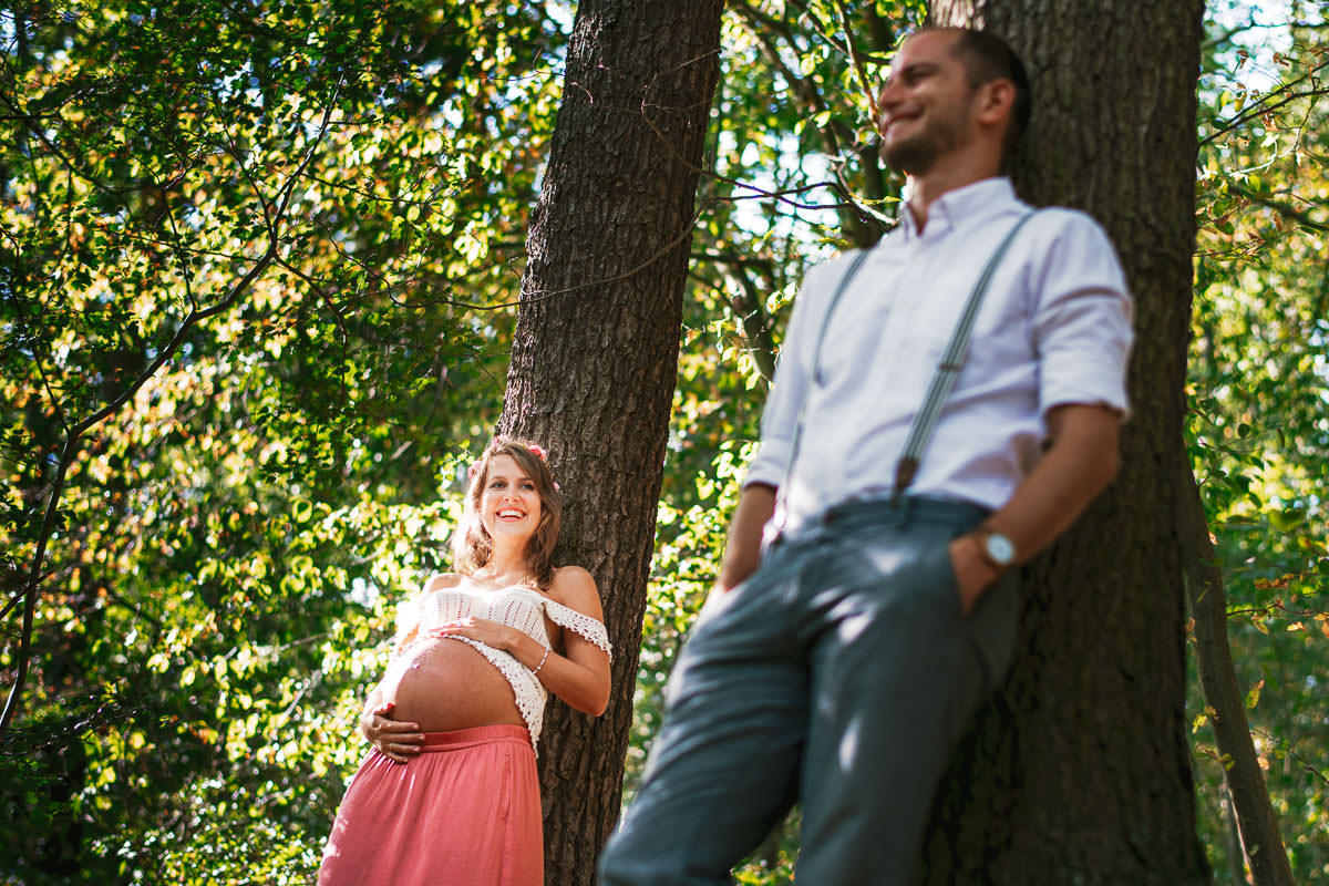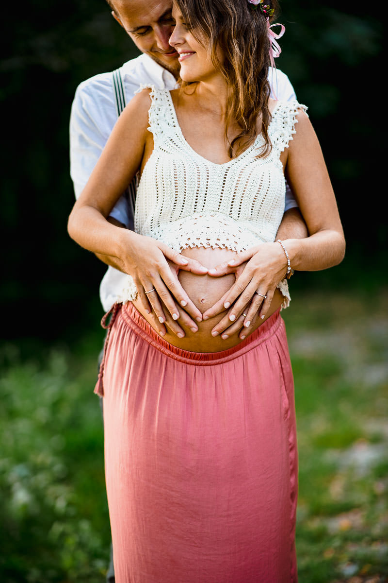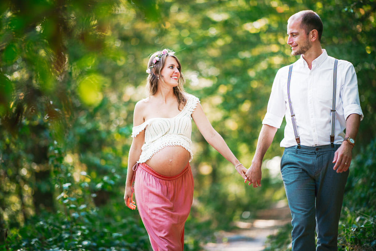 Ein Paarshooting in der Schwangerschaft sollte so ca. 4-8 Wochen vor dem Geburtstermin stattfinden. Dann hat euer Babybauch schon eine sehr schöne Form und ihr seid körperlich fit. Denn ganz klar, draußen in der Natur Bilder zu machen, ist etwas anstrengender als im Studio. Da ihr euch einfach mehr bewegen müsst. Aber keine Angst, wir legen Pausen ein, wenn ihr es benötigt. Um euren Bauch gut sehen zu können, solltet ihr etwas bauchfreies tragen. Alternativ bieten sich auch eng anliegende Tops oder Kleider an. Grundsätzlich sollte es so sein, daß man die Kontur eures Bauches gut sieht. Weite Kleider sind zwar bequemer, aber man sieht darin nicht gut die Form. Die Zwei haben das perfekt gemacht bei diesem Babybauch Shooting in Mannheim. Von der Uhrzeit ist am besten der Nachmittag geeignet, da das Licht um diese Tageszeit am schönsten ist. Die Location für die Bilder sprechen wir gemeinsam ab. Für das Schwangerschaftsshooting das ihr hier seht,  sind wir einfach ins Grüne an einen Waldrand gefahren. Ihr seht man braucht keine ausgefallene Location für schöne Schwangerschaftsbilder in Mannheim und Umgebung.
