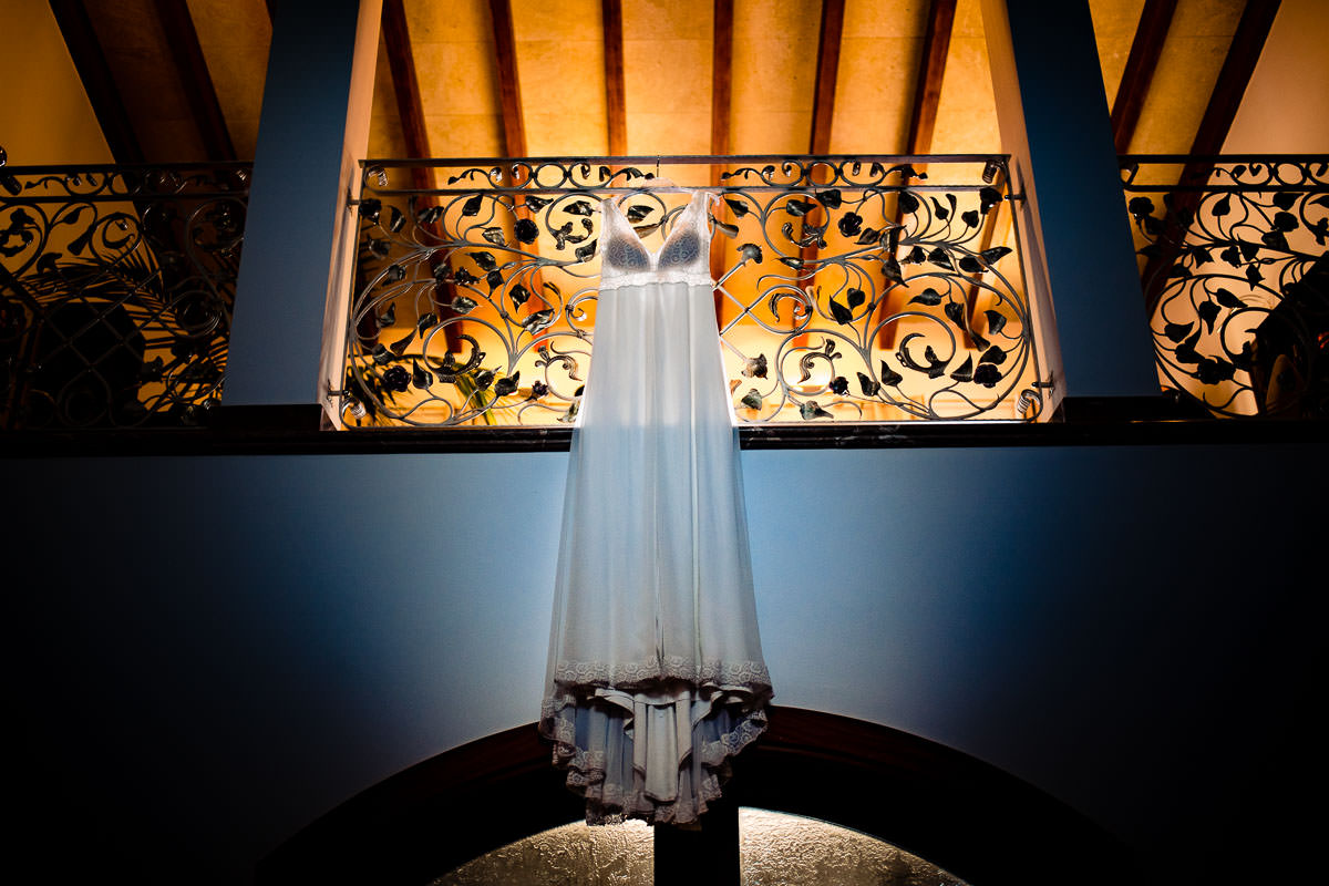 Setze das Kleid in die Mitte des Bildes und nutze eine symmetrische Umgebung — das wirkt harmonisch und elegant. Wenn du es zum Beispiel in ein Fenster hängst, dann solltest du darauf achten, dass es auch wirklich mittig hängt. Und sich auch nicht verdreht hat. Denn nur wenn das Bild wirklich symmetrisch ist, entfaltet es seine volle Wirkung.Brautkleid in der La Villa