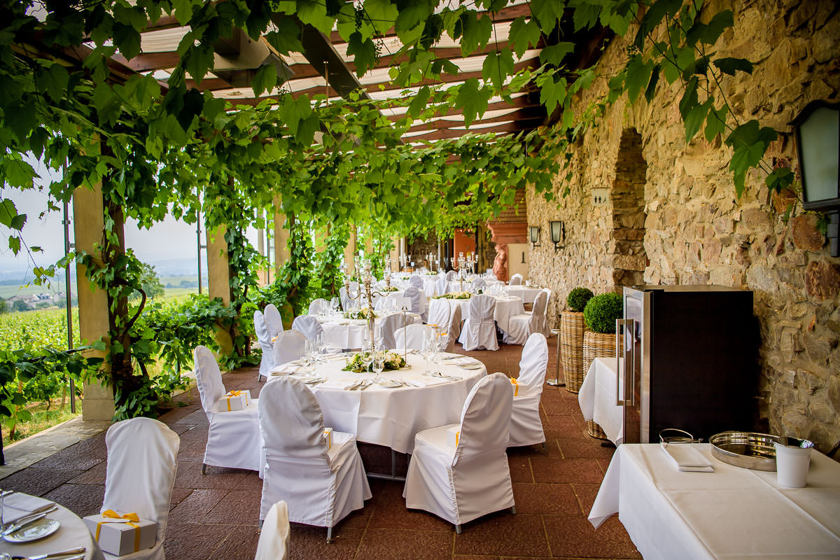 Wunderschön ist eine Feier im Burgrestaurant auf der Terrasse. Auf der einen Seite geöffnet hat man einen wunderschönen Blick ins Rheingau. Eingedeckt mit runden Tischen ist es hier schon wunderschön. Aber besonders toll ist für diesen Raum eine lange Tafel. Für die Party wechselt man in den verglasten Pavillon.