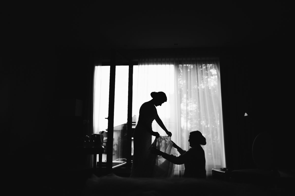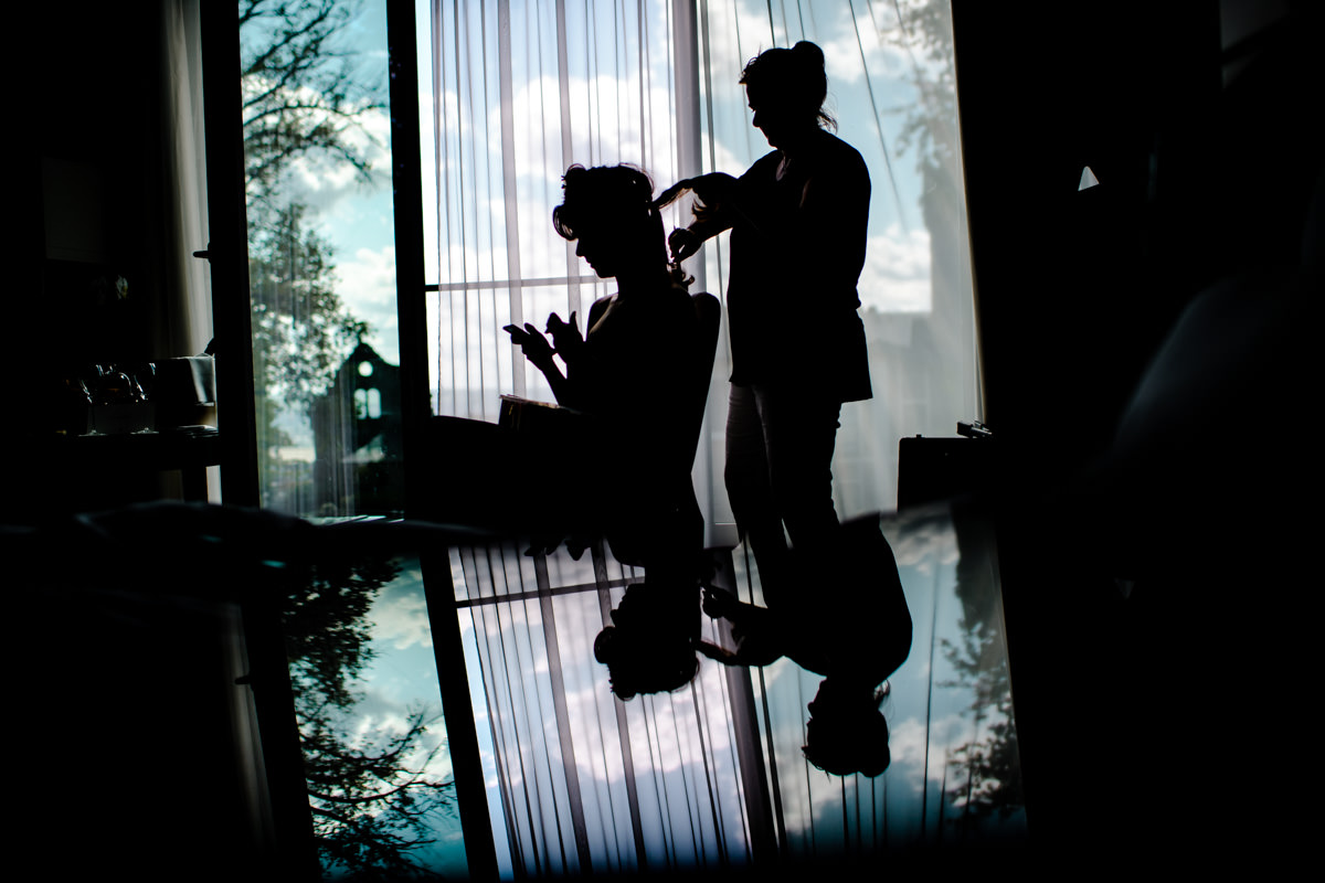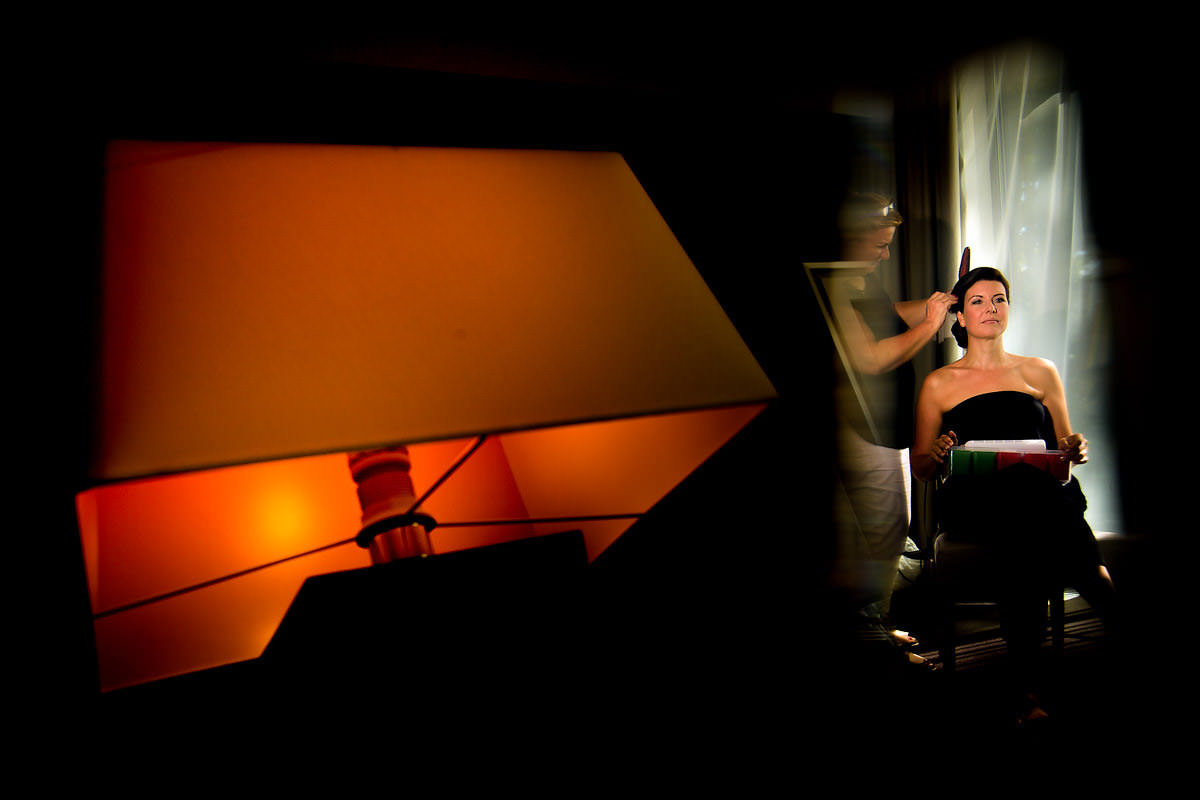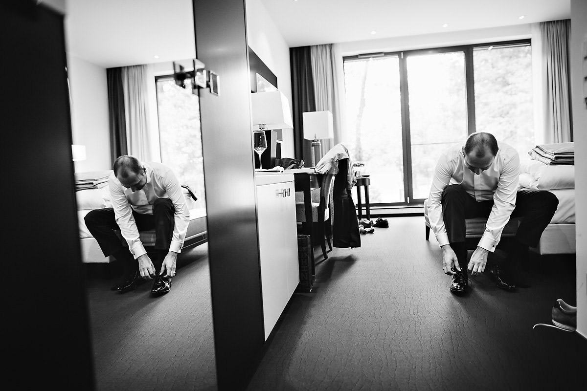 Das getting ready der Braut fand im Hotel der Burg Schwarzenstein statt. Dort fand das Styling in einer der schönen Suiten mit Blick auf die Burg statt. Dieser Raum hatte durch die grosse Fensterfront ein schönes natürliches Licht. Entsprechend vorteilhaft ist das Licht für schöne Bilder beim getting ready. Der Bräutigam machte sich derweilen in einem der anderen Zimmer bei seinem Trauzeugen zurecht.