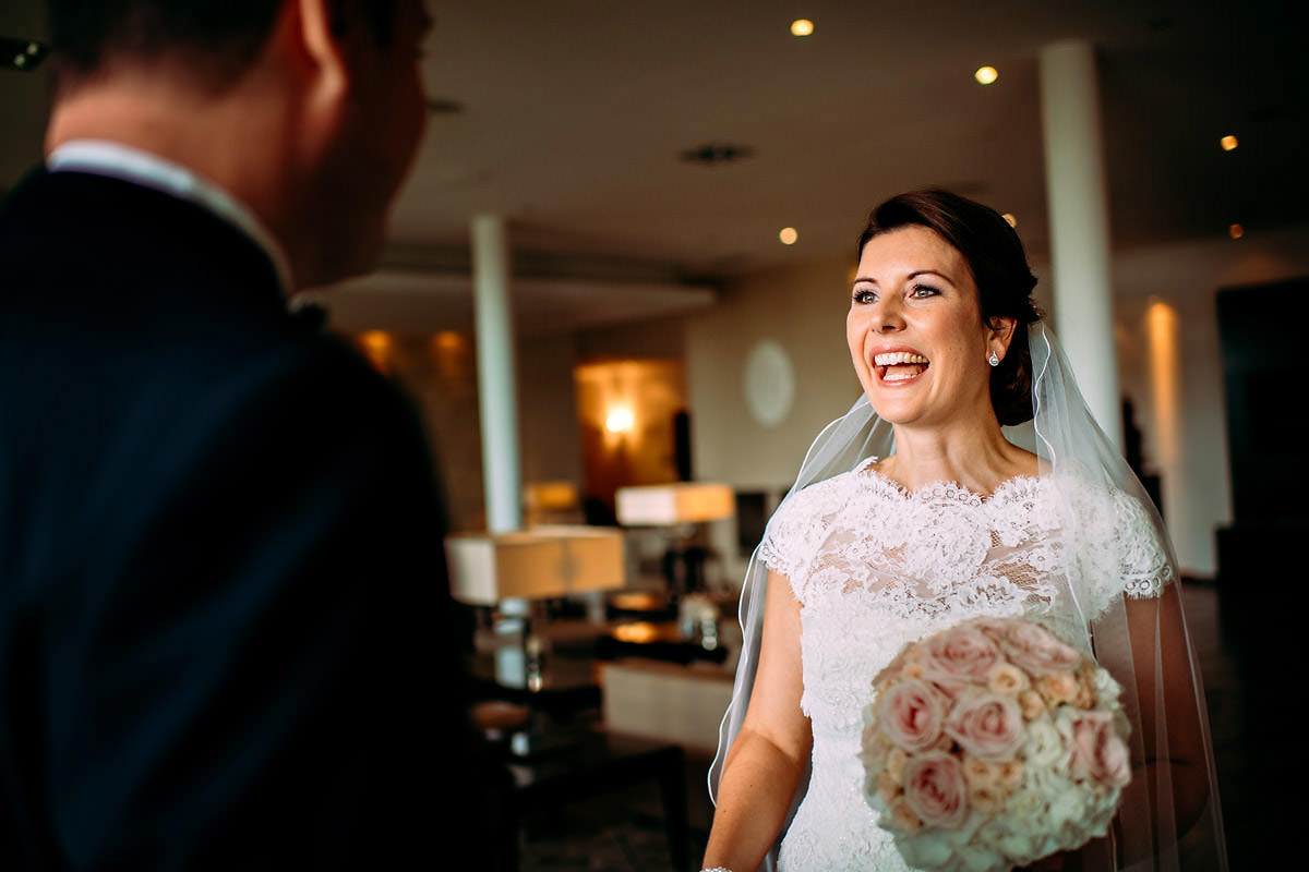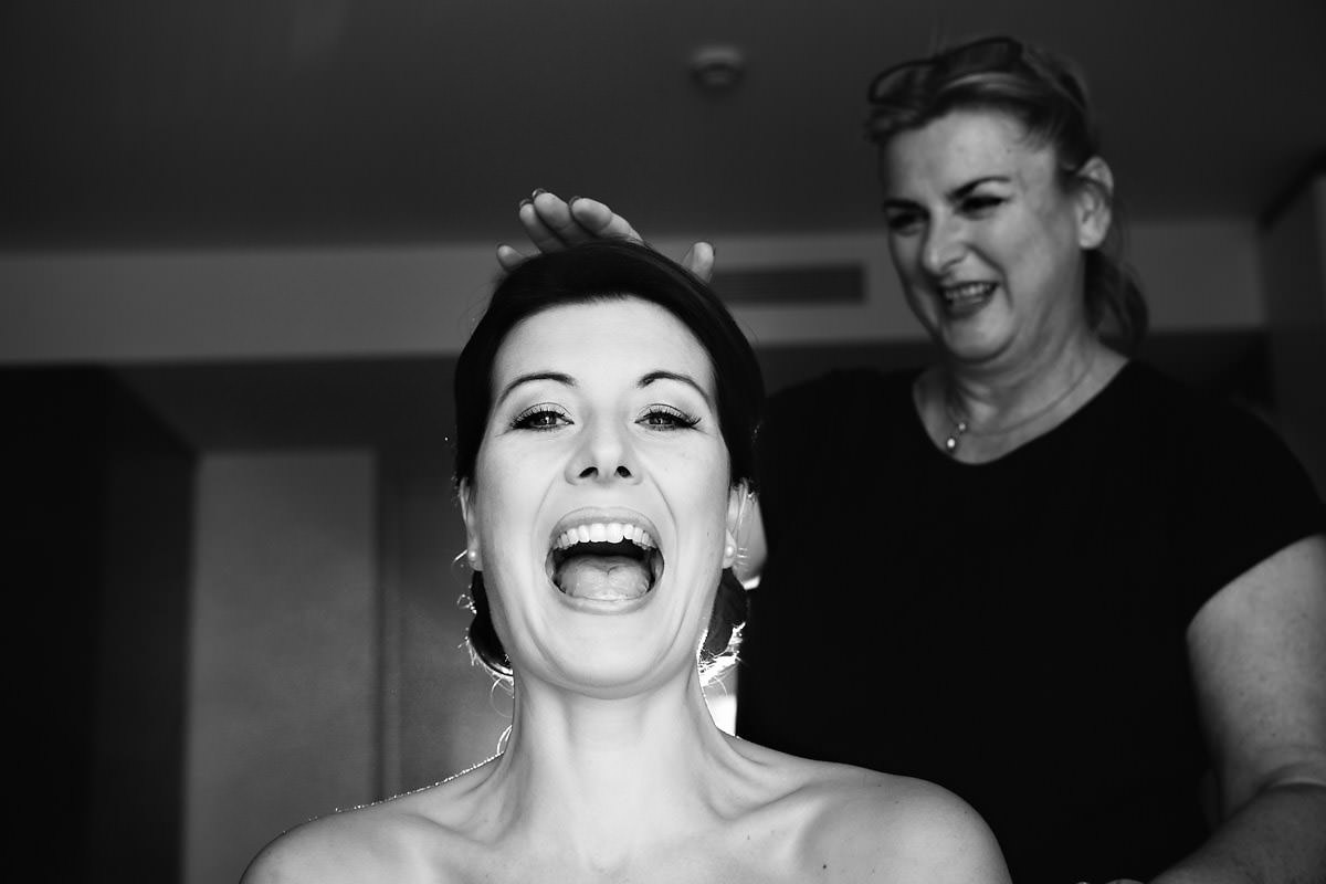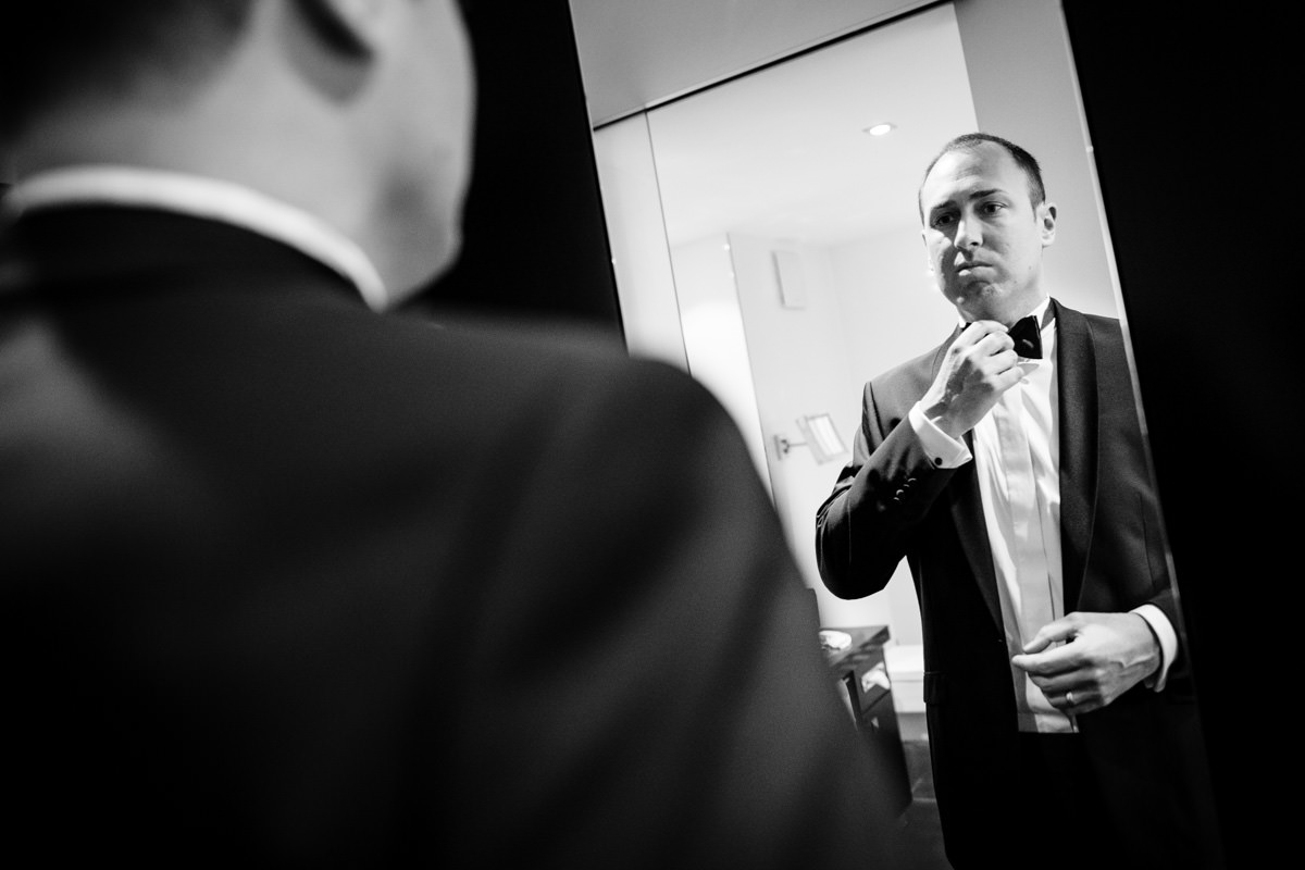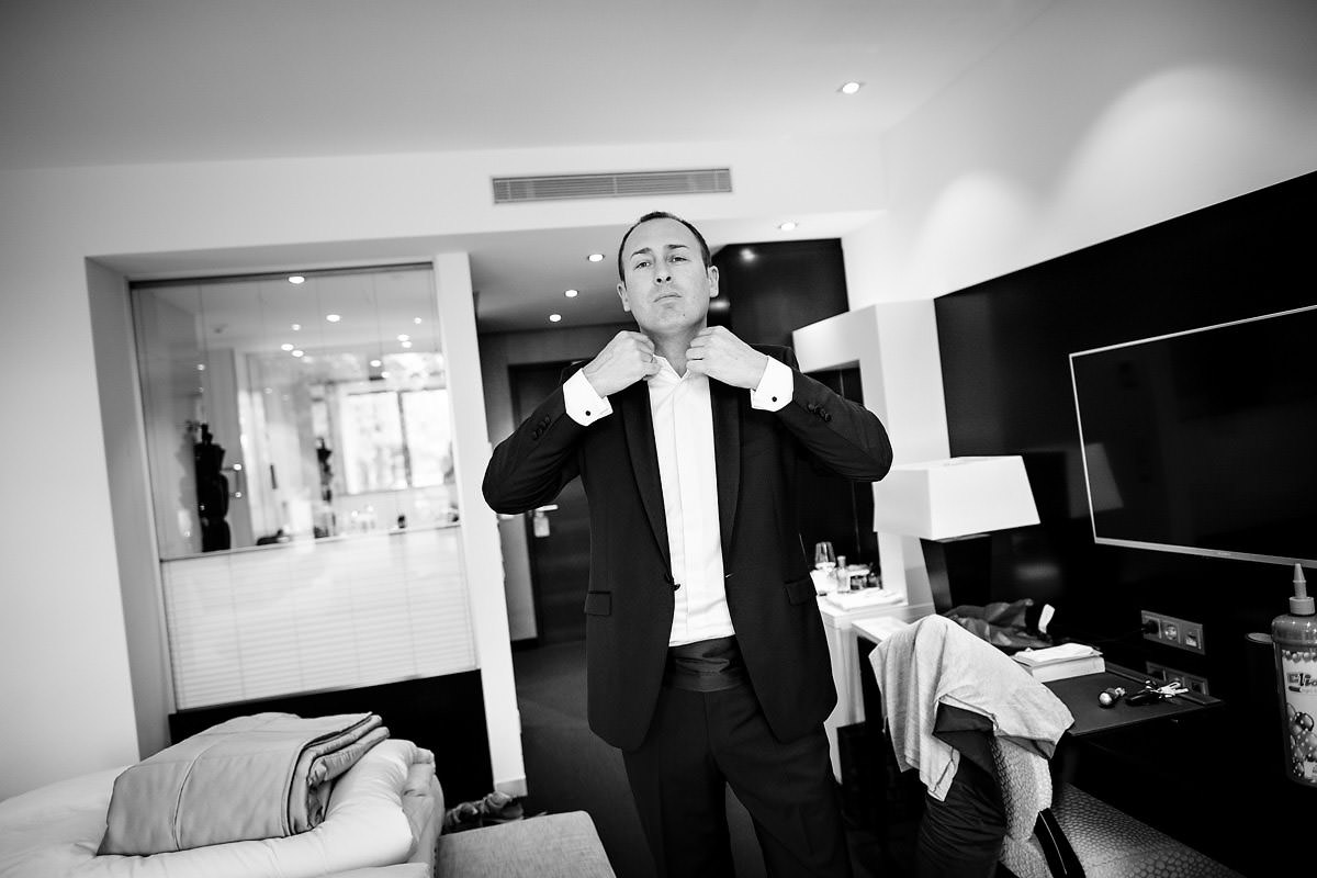 Das getting ready der Braut fand im Hotel der Burg Schwarzenstein statt. Dort fand das Styling in einer der schönen Suiten mit Blick auf die Burg statt. Dieser Raum hatte durch die grosse Fensterfront ein schönes natürliches Licht. Entsprechend vorteilhaft ist das Licht für schöne Bilder beim getting ready. Der Bräutigam machte sich derweilen in einem der anderen Zimmer bei seinem Trauzeugen zurecht.