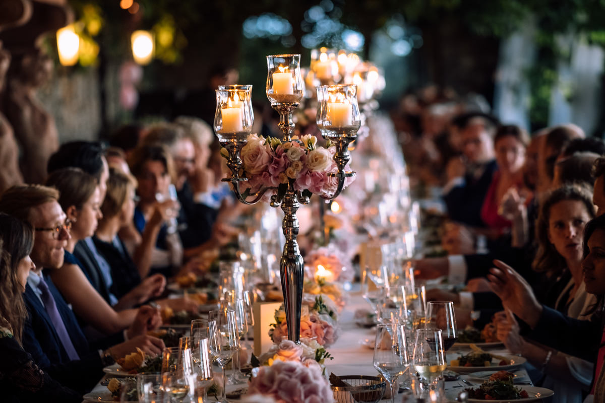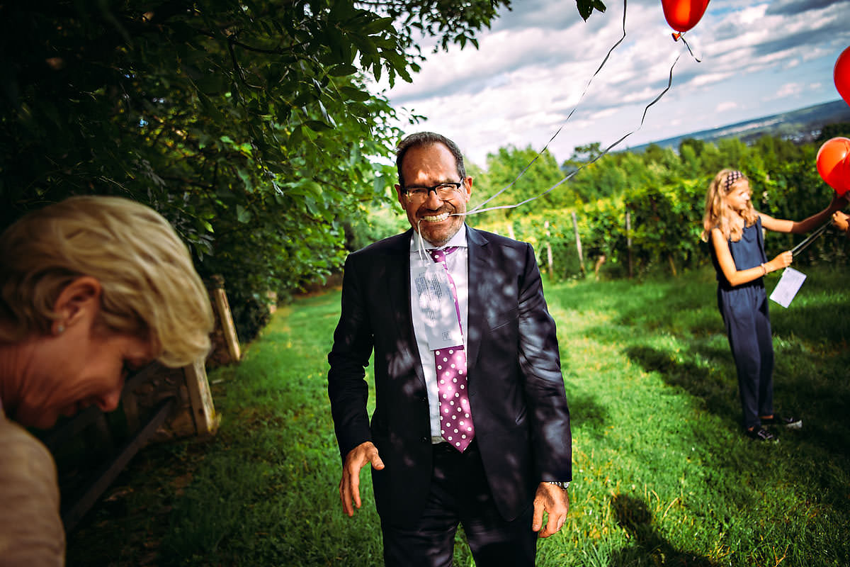 Der anschliessende Sektempfang und die Gratulationen wurden auf der Burg Schwarzenstein entgegen genommen. Der Sektempfang fand in der wunderschönen Gartenanlage der Burg statt, mit Aussicht auf das Rheingau. Die abendliche Feier wurde im Burgrestaurant, besser gesagt auf der Burgterasse gefeiert. Eingedeckt wurde mit einer langen Tafel. Diese alleine schon viele der Besucher sprachlos gemacht. Gegessen wurde mit einer freien Aussicht auf die Weinreben und das umliegende Rheintal.