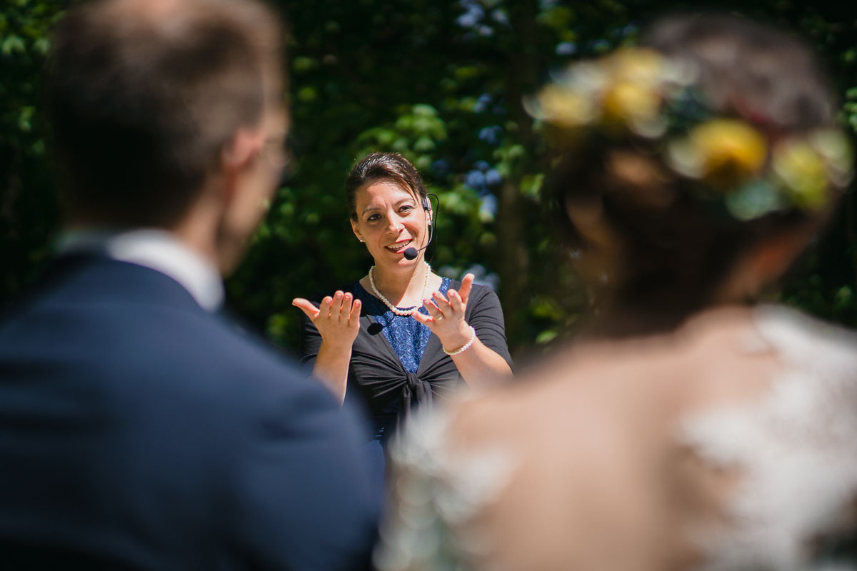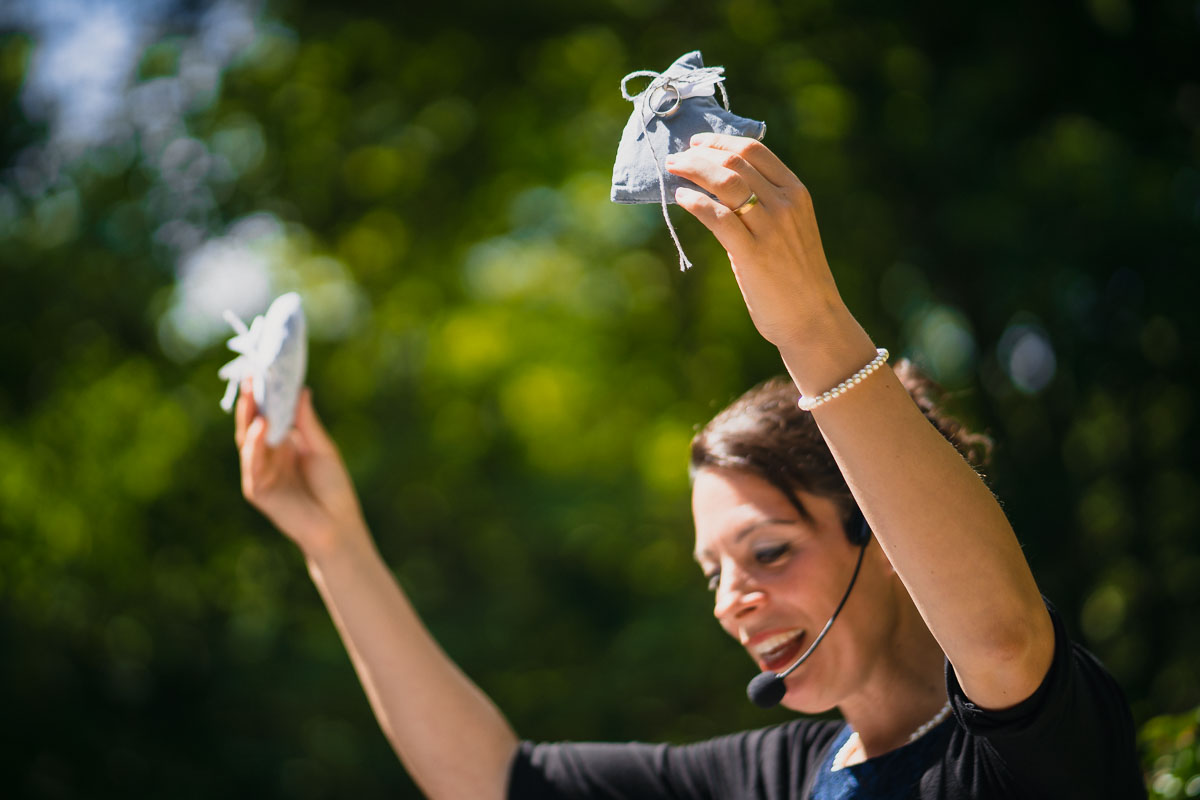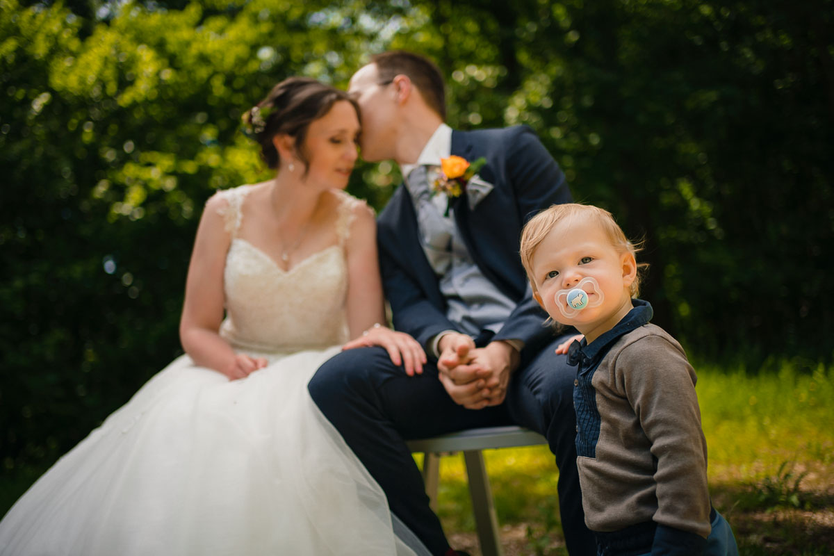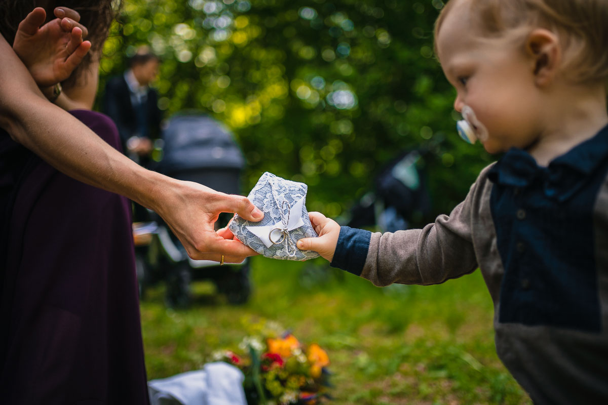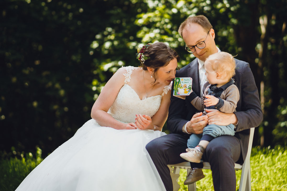 Danach fand die freie Trauung auf der Waldlichtung statt. Zur Sicherheit haben die zwei eine Corona Teststation aufgebaut, wo sich jeder Gast nochmal testen lassen konnte. Damit die Hochzeit ohne Corona Fälle ablaufen konnte. Die Trauung war wunderschön und sehr emotional. Der Sohn hatte natürlich eine Hauptrolle bei dieser freien Trauung im Albgut.