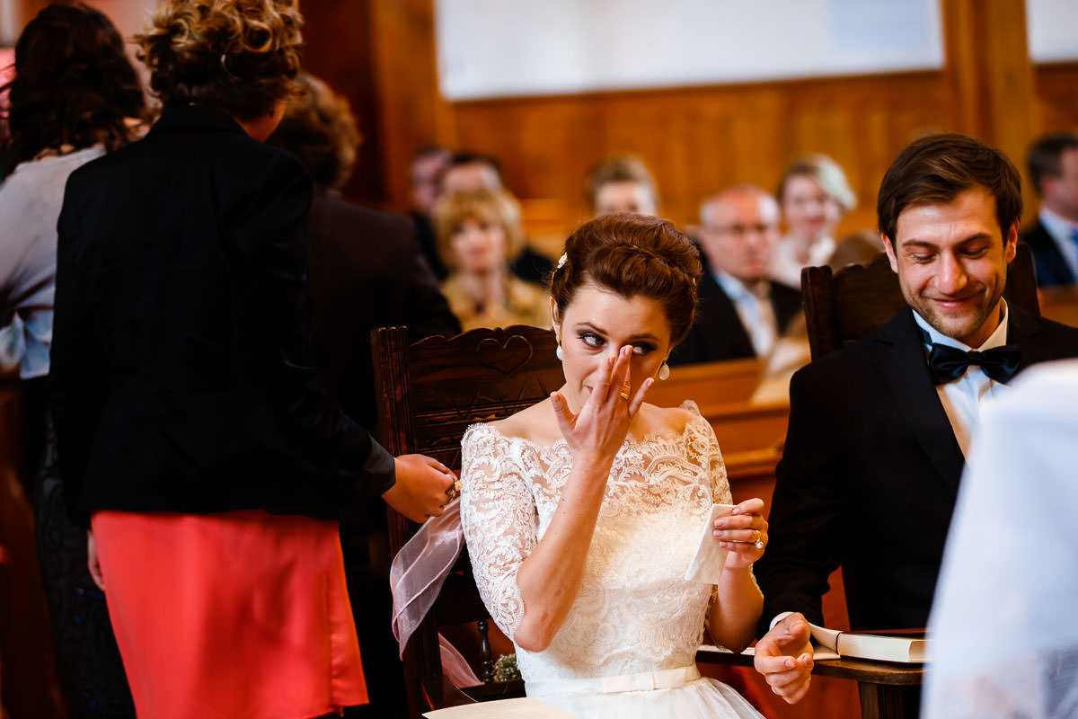 Danach kam der First Look von Alwina und Waldemar im Garten des Weinguts. Anschließend haben wir mit den Hochzeitsfotos bei Fitz Ritter weitergemacht. Alle Bilder sind auf dem Weingut entstanden. Die sehr emotionale Trauung fand in der evangelischen Kirche in Wachenheim statt, wo die Familie mit einer kleinen Gesangseinlage das Brautpaar überrascht hat. Das hat dann auch für die ein und andere Träne gesorgt.