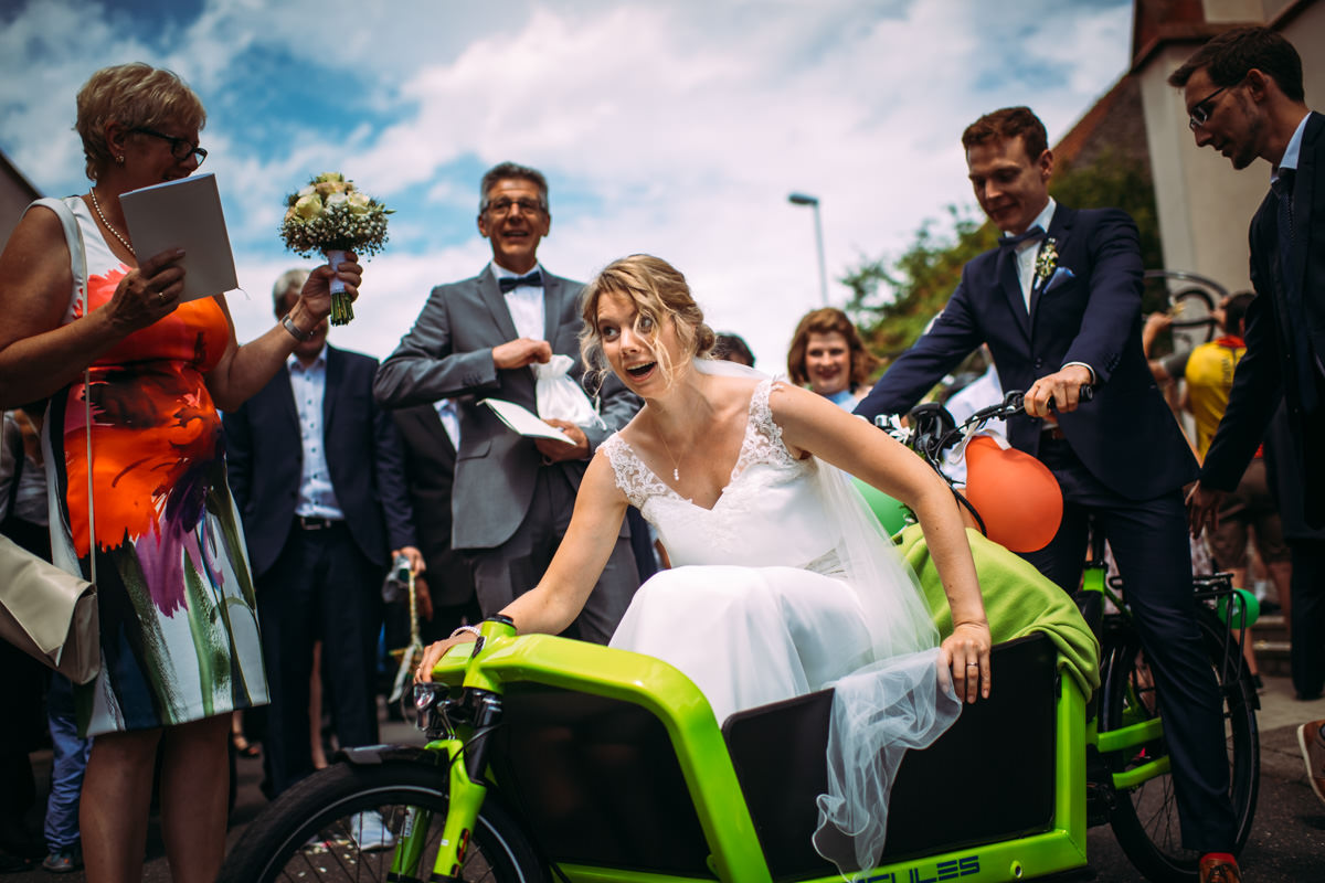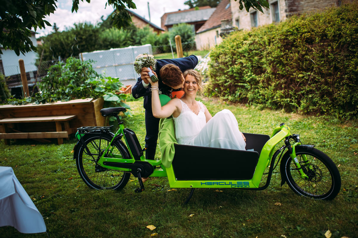 Die kirchliche Trauung fand in Bernsfelden statt, wo wir auch den Tag begonnen haben. Dort traute man sich in der kleinen Kirche. Nach dem Gottesdienst ging es mit dem Fahrrad auf die grüne Wiese zum Sektempfang.