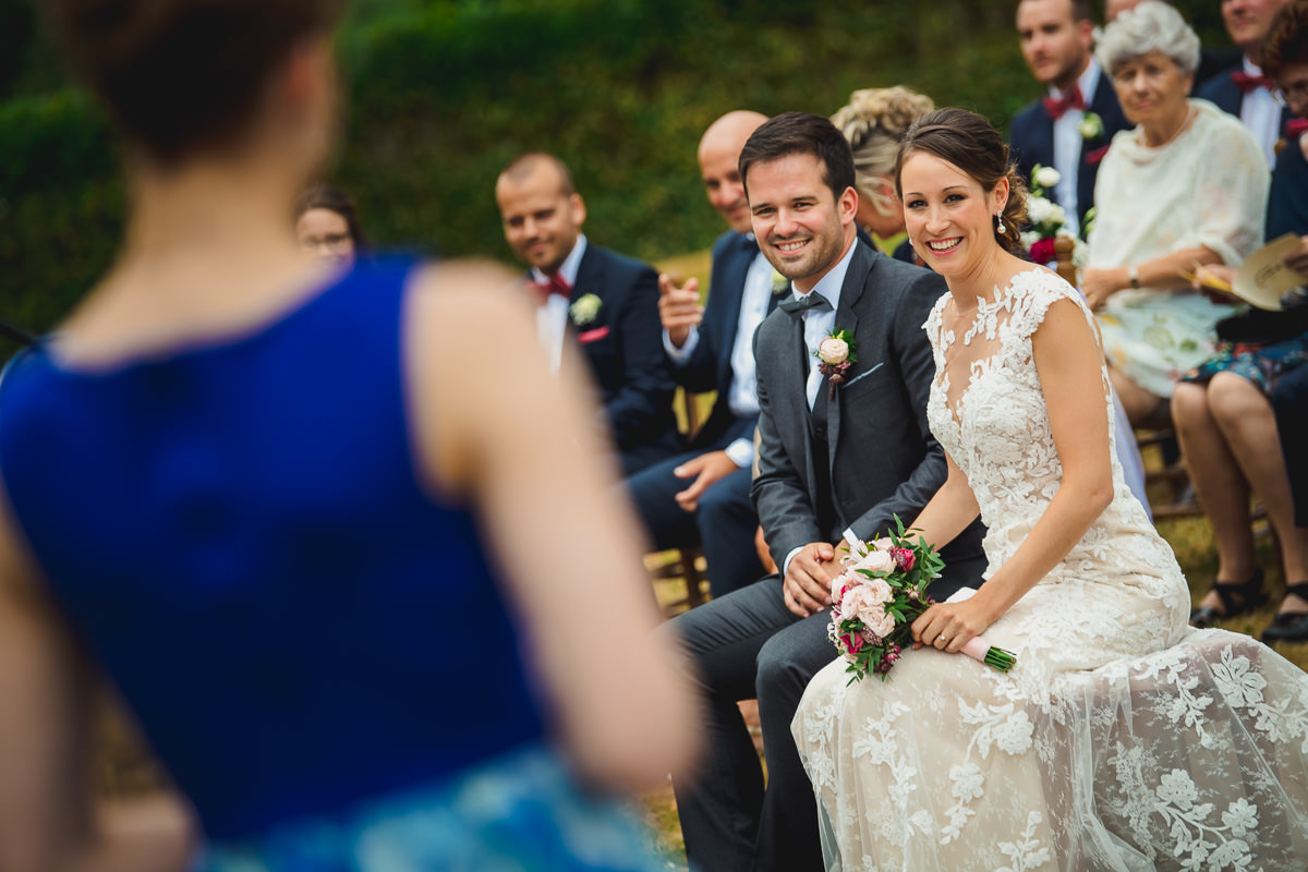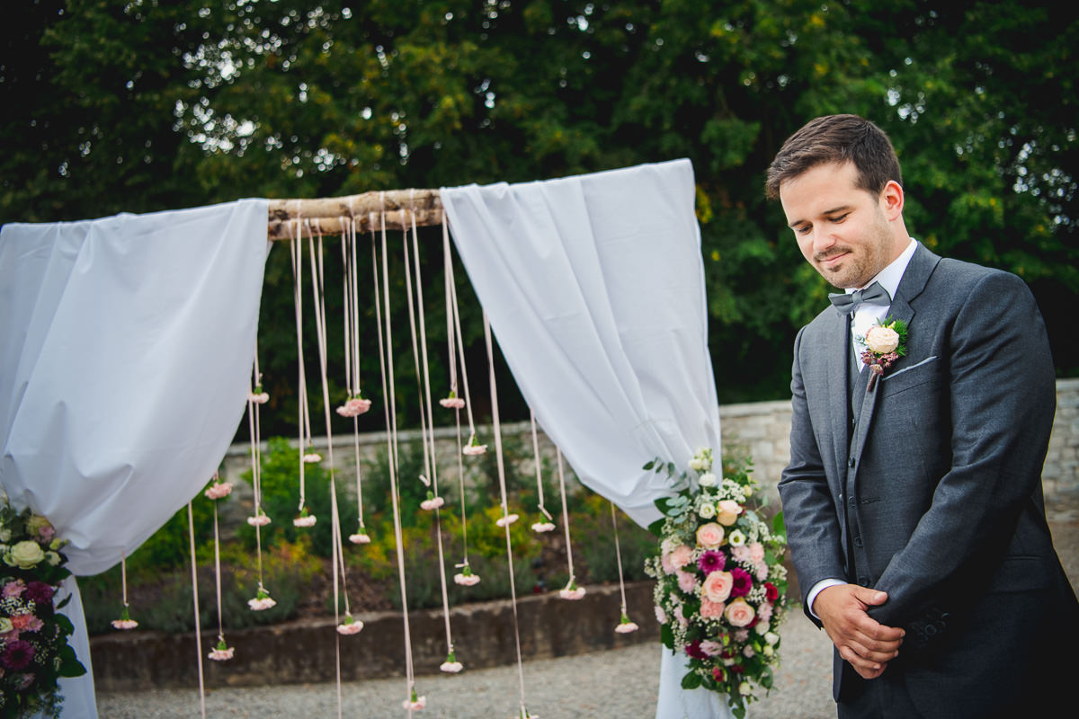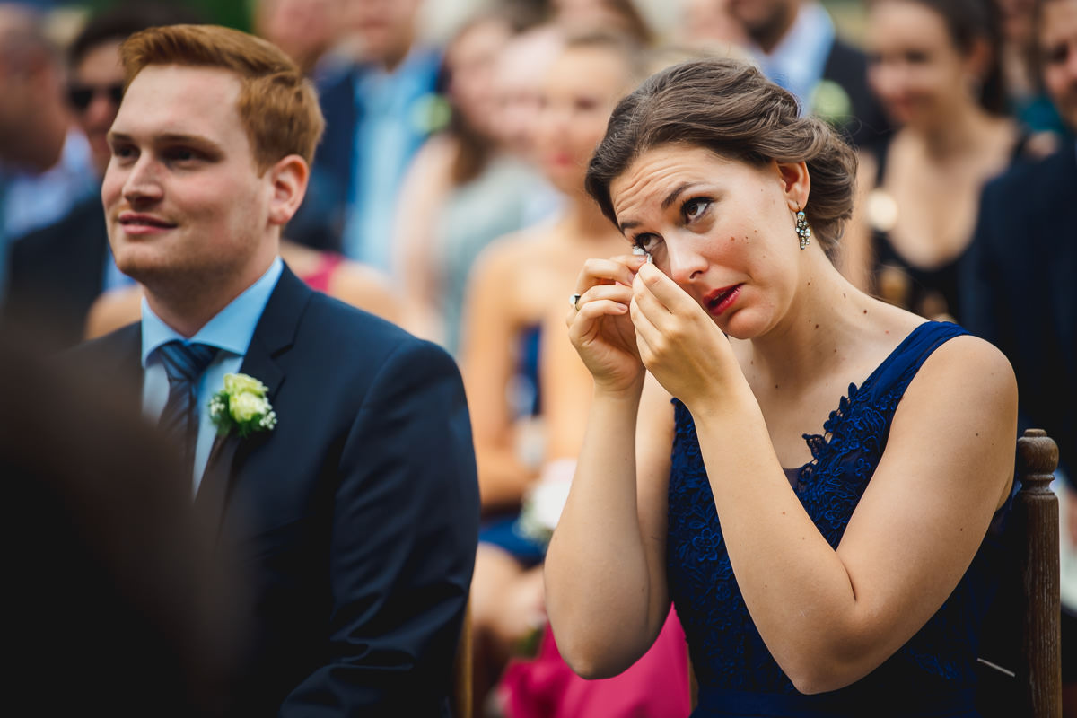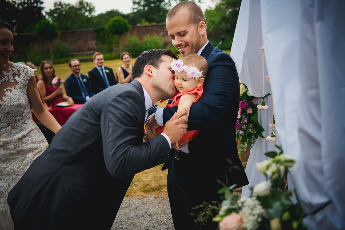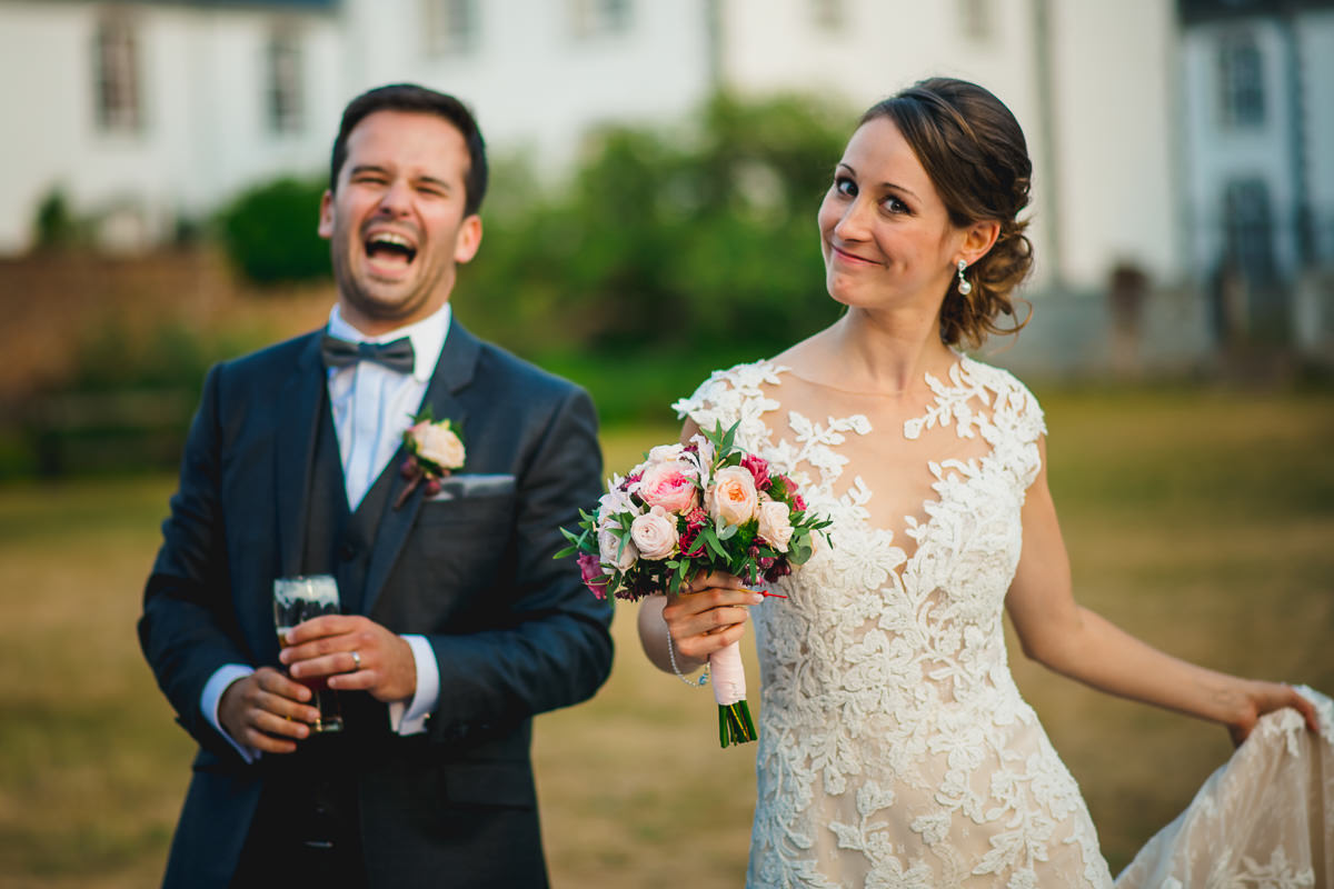 Die Trauung fand auf der freien Wiese statt. Leider hat sich die Sonne hinter dunklen Wolken versteckt. Ein Grossteil der Gäste wurde vom Hotel mit einem Bus zum Schloss transportiert. Da dieser infolge Baustellen leider verspätet war, musste die Braut im Innenhof noch etwas warten. Infolgedessen wurde sie auch immer nervöser. Aber dann war es endlich soweit, und es ging los. Die Trauzeremonie war trotz des düsteren Wetters eine der schönsten, die ich erlebt habe. Denn sie war komplett durch Beiträge der Freunde und der Familie gestaltet. Deswegen auch sehr persönlich. Nach der Trauung wurde noch kurz gratuliert bevor wir ein paar der Portraits gemacht haben. Leider war infolge des fortgeschrittenen Zeitplans nicht so viel Zeit dafür.