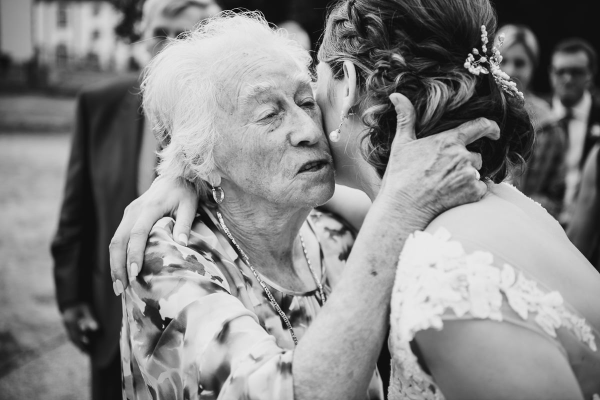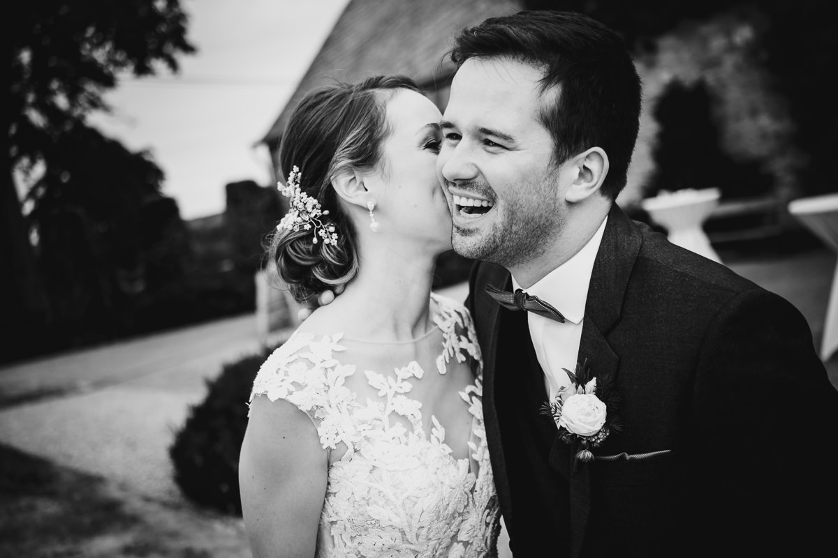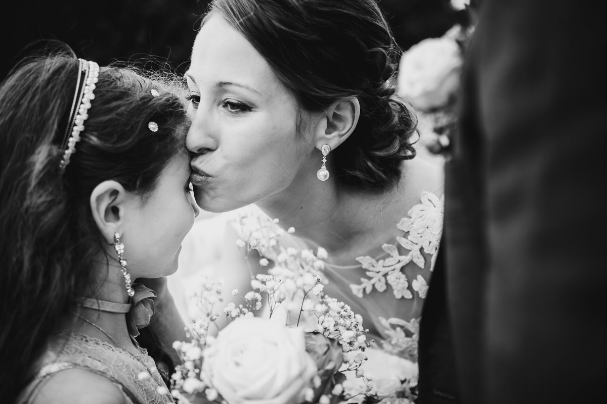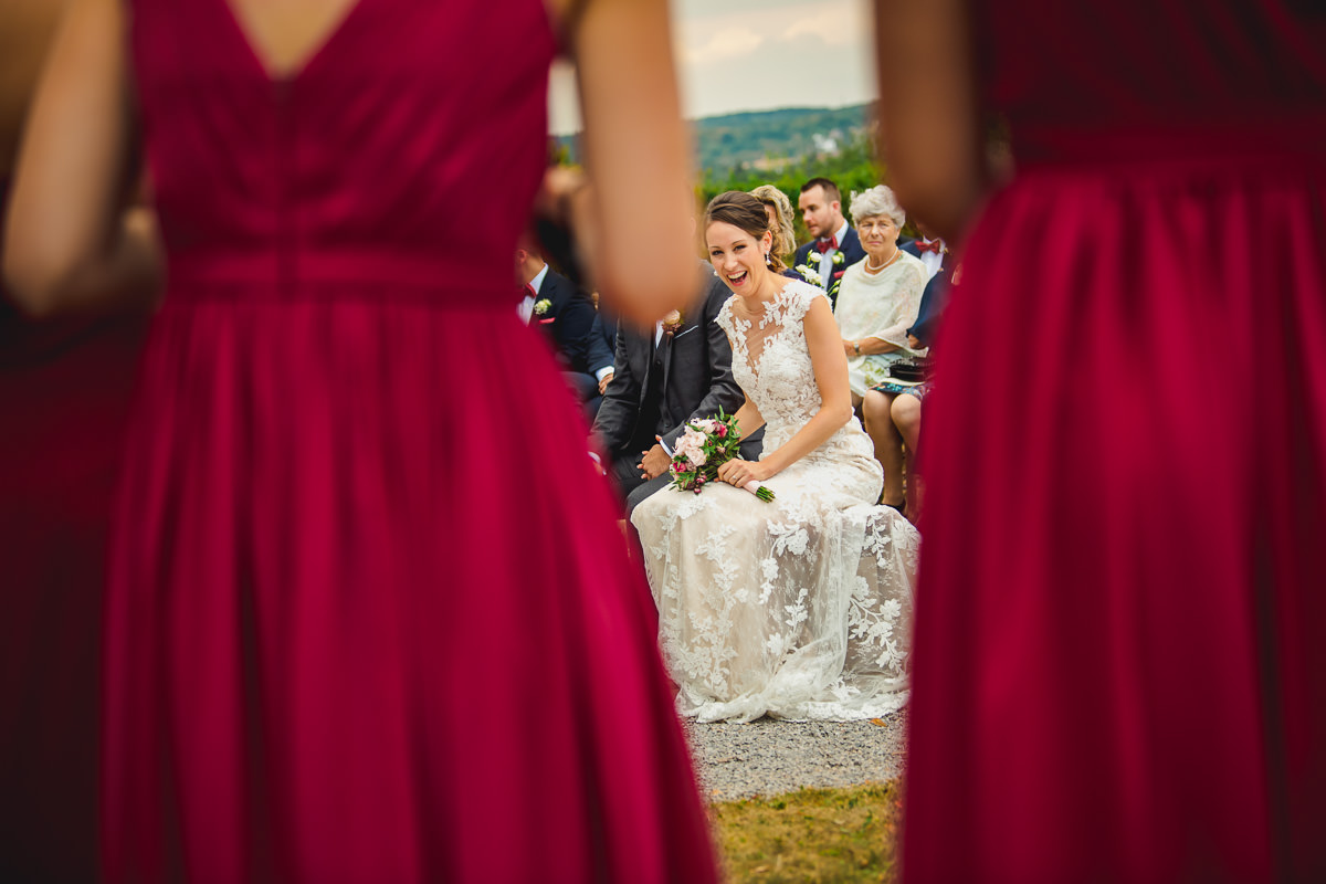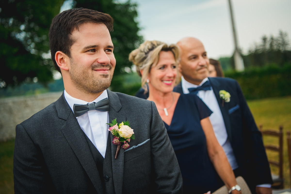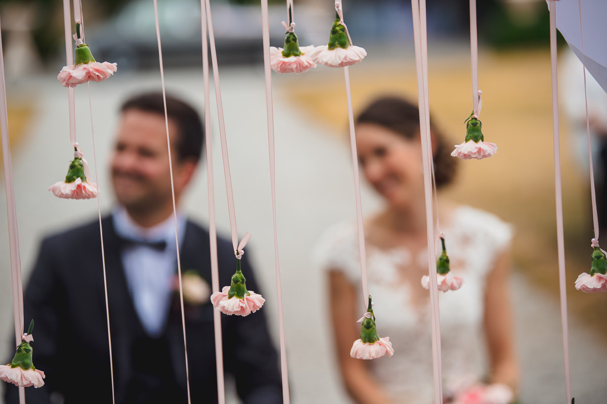Die Trauung fand auf der freien Wiese statt. Leider hat sich die Sonne hinter dunklen Wolken versteckt. Ein Grossteil der Gäste wurde vom Hotel mit einem Bus zum Schloss transportiert. Da dieser infolge Baustellen leider verspätet war, musste die Braut im Innenhof noch etwas warten. Infolgedessen wurde sie auch immer nervöser. Aber dann war es endlich soweit, und es ging los. Die Trauzeremonie war trotz des düsteren Wetters eine der schönsten, die ich erlebt habe. Denn sie war komplett durch Beiträge der Freunde und der Familie gestaltet. Deswegen auch sehr persönlich. Nach der Trauung wurde noch kurz gratuliert bevor wir ein paar der Portraits gemacht haben. Leider war infolge des fortgeschrittenen Zeitplans nicht so viel Zeit dafür.