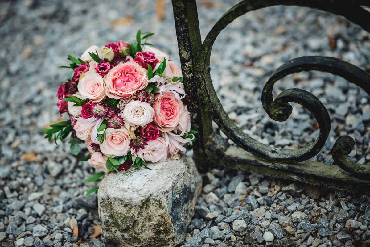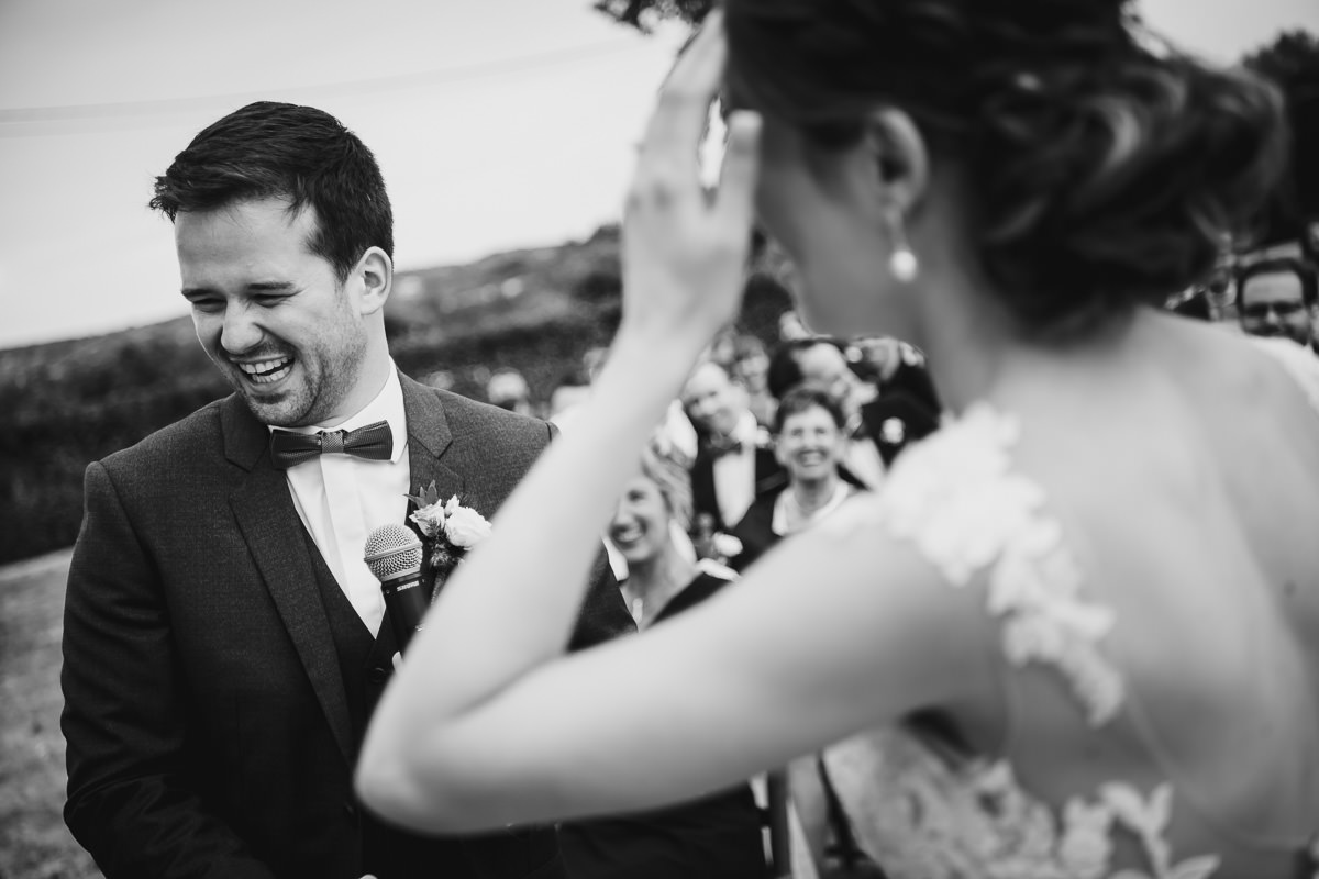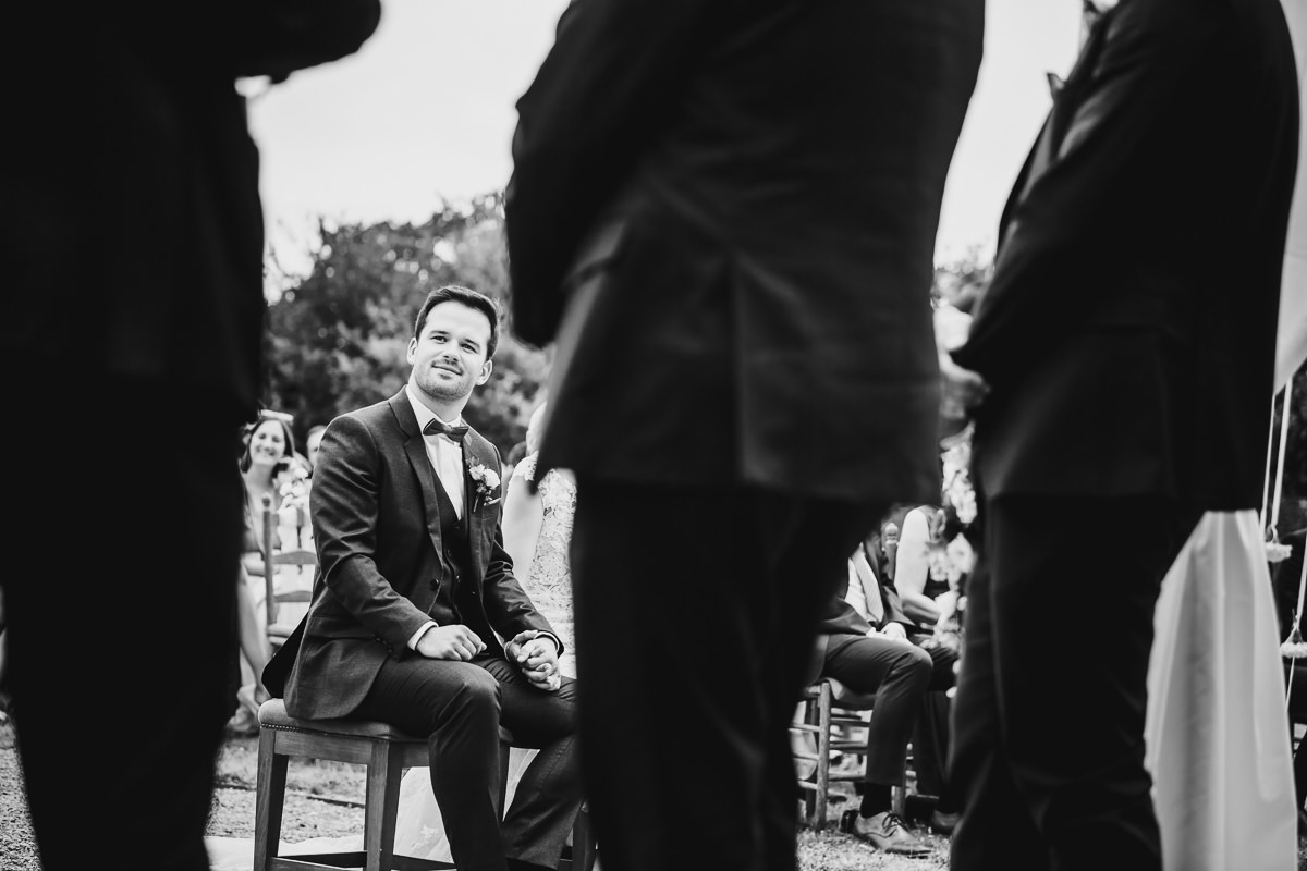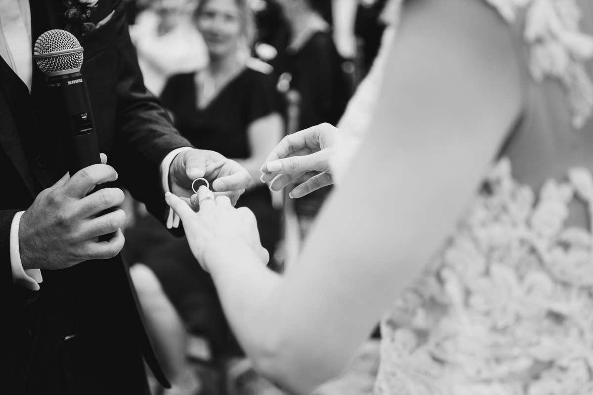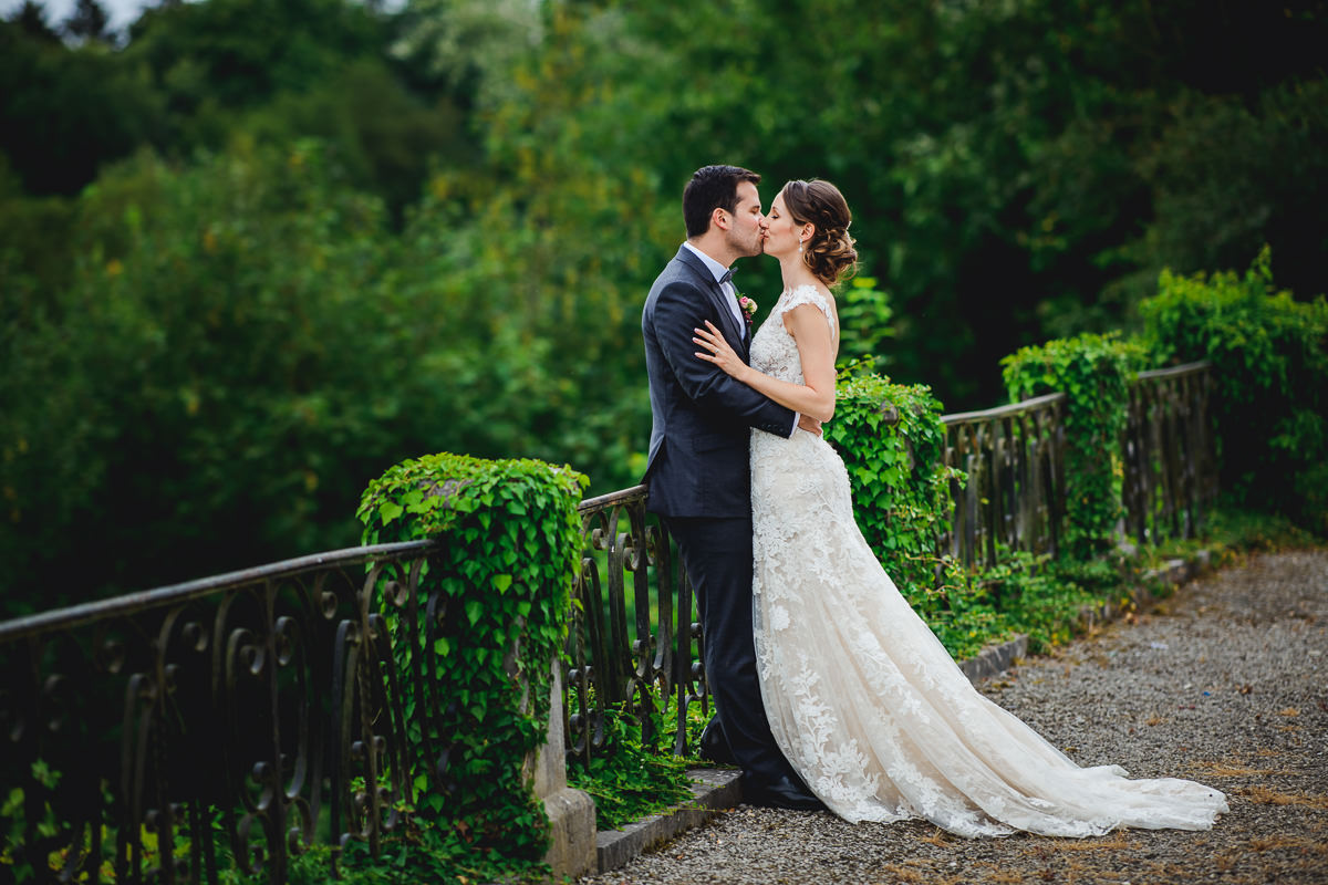 Die Trauung fand auf der freien Wiese statt. Leider hat sich die Sonne hinter dunklen Wolken versteckt. Ein Grossteil der Gäste wurde vom Hotel mit einem Bus zum Schloss transportiert. Da dieser infolge Baustellen leider verspätet war, musste die Braut im Innenhof noch etwas warten. Infolgedessen wurde sie auch immer nervöser. Aber dann war es endlich soweit, und es ging los. Die Trauzeremonie war trotz des düsteren Wetters eine der schönsten, die ich erlebt habe. Denn sie war komplett durch Beiträge der Freunde und der Familie gestaltet. Deswegen auch sehr persönlich. Nach der Trauung wurde noch kurz gratuliert bevor wir ein paar der Portraits gemacht haben. Leider war infolge des fortgeschrittenen Zeitplans nicht so viel Zeit dafür.
