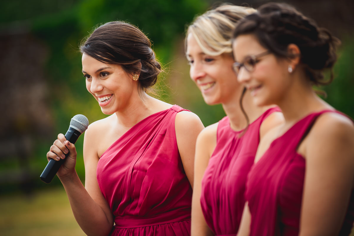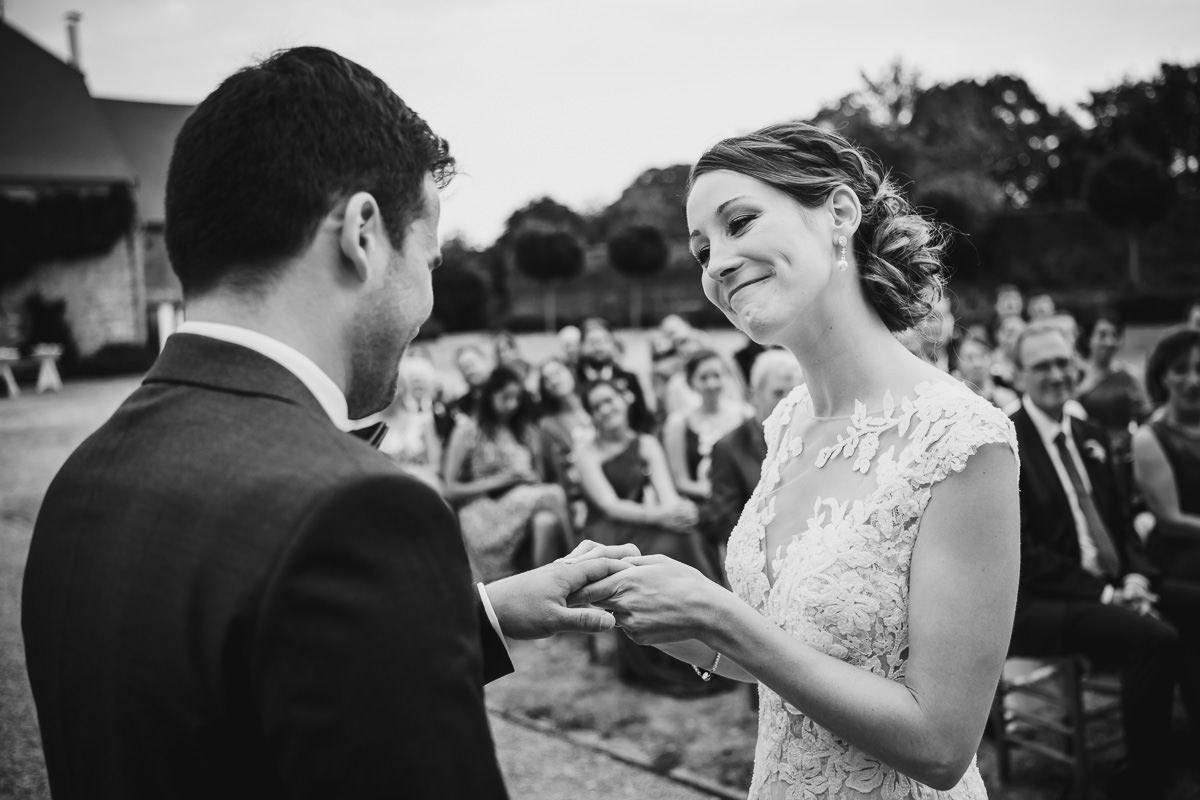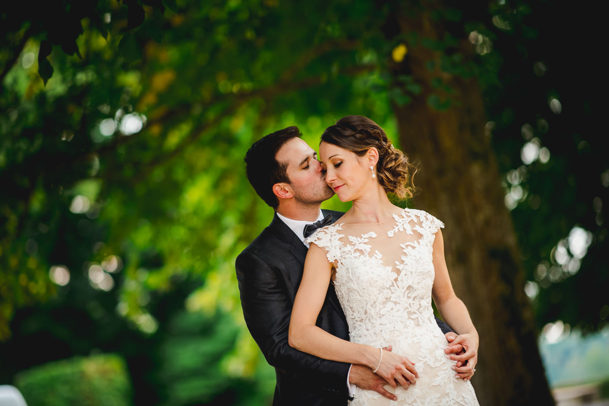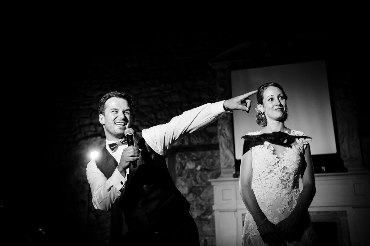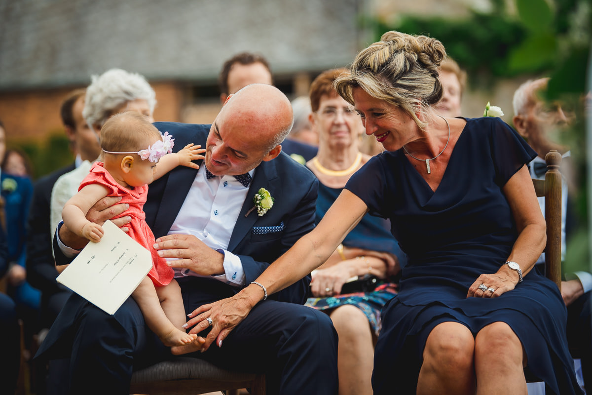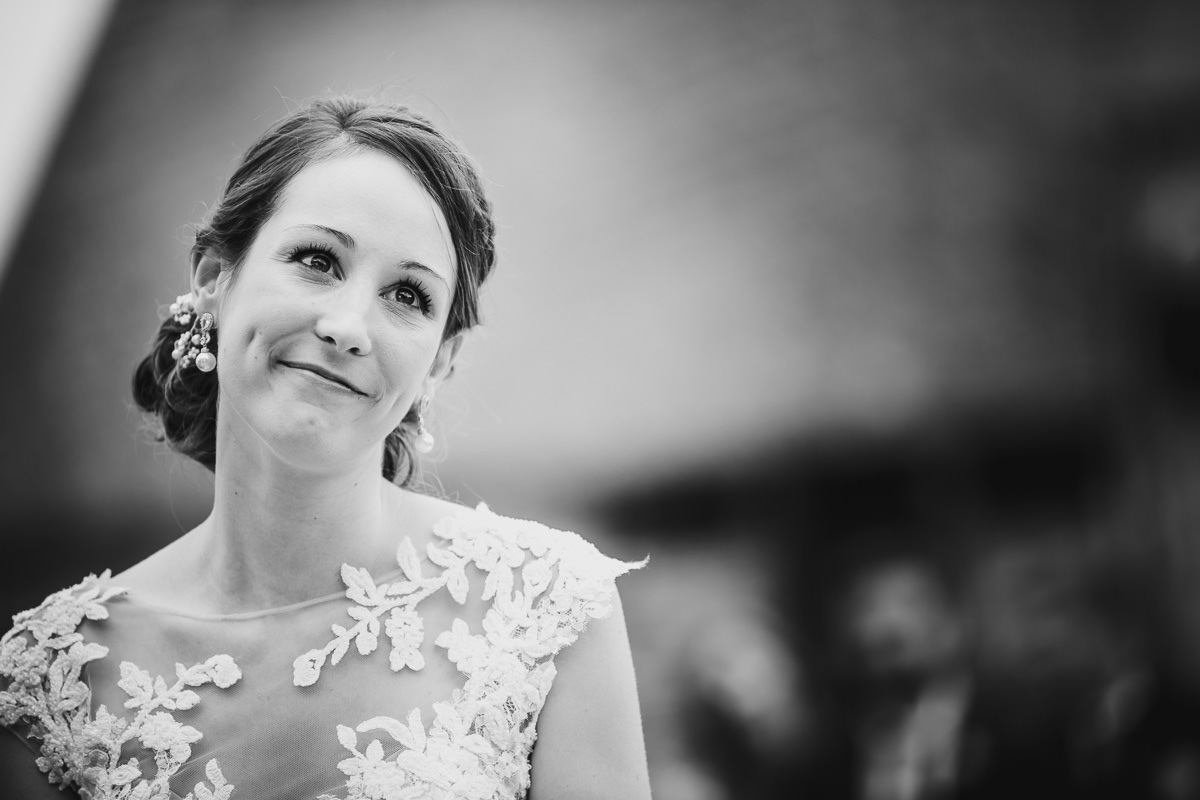 Die Trauung fand auf der freien Wiese statt. Leider hat sich die Sonne hinter dunklen Wolken versteckt. Ein Grossteil der Gäste wurde vom Hotel mit einem Bus zum Schloss transportiert. Da dieser infolge Baustellen leider verspätet war, musste die Braut im Innenhof noch etwas warten. Infolgedessen wurde sie auch immer nervöser. Aber dann war es endlich soweit, und es ging los. Die Trauzeremonie war trotz des düsteren Wetters eine der schönsten, die ich erlebt habe. Denn sie war komplett durch Beiträge der Freunde und der Familie gestaltet. Deswegen auch sehr persönlich. Nach der Trauung wurde noch kurz gratuliert bevor wir ein paar der Portraits gemacht haben. Leider war infolge des fortgeschrittenen Zeitplans nicht so viel Zeit dafür.