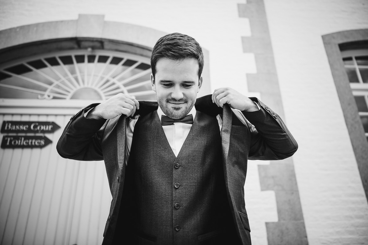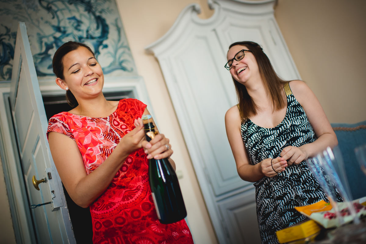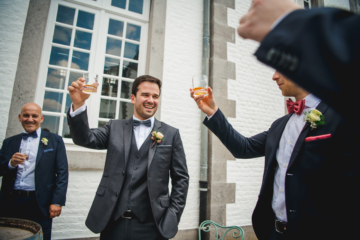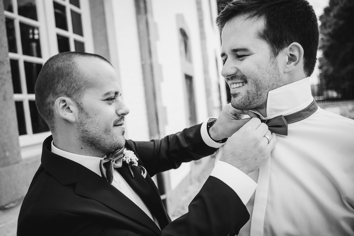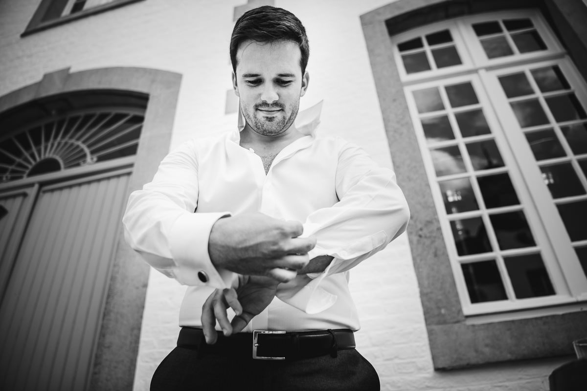 Die Brautvorbereitungen fanden, wie die gesamte Feier im Schloss Deulin in Belgien statt. Das Schloss befindet sich im privaten Besitz. Die Räumlichkeiten im Hauptgebäude standen der Braut für die Vorbereitungen zur Verfügung. Das Brautpaar selbst stammt aus Luxemburg und viele der Freunde sind ebenfalls aus Luxemburg angereist. Nach und Nach wurden auch die Räume immer voller, da sich immer mehr Freundinnen und Freunde eingefunden haben. Es hat einfach einen riesigen Spass gemacht, von Raum zu Raum zu gehen, um viele tolle Momente einzufangen. Der Bräutigam hat sich kurzfristig entschlossen, draussen im Innenhof sich final anzuziehen.