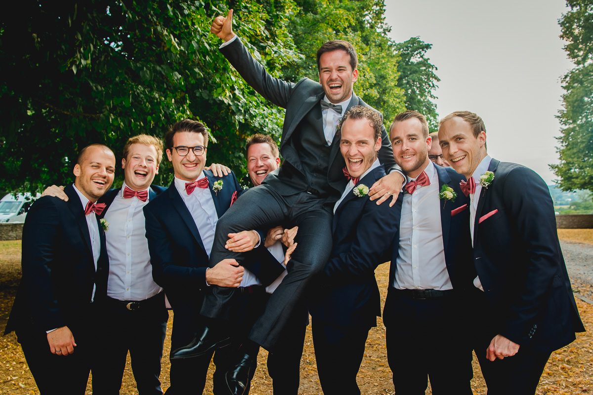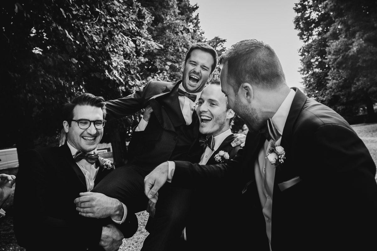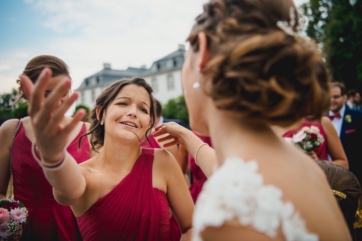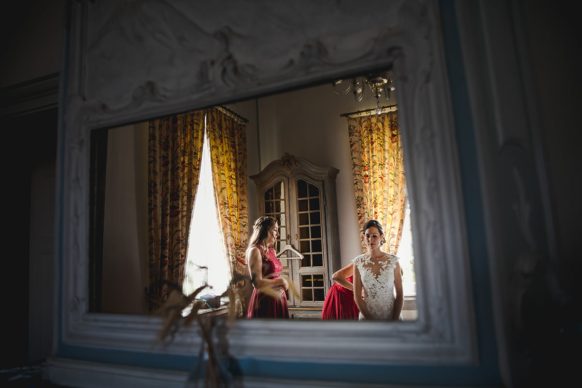 Die Brautvorbereitungen fanden, wie die gesamte Feier im Schloss Deulin in Belgien statt. Das Schloss befindet sich im privaten Besitz. Die Räumlichkeiten im Hauptgebäude standen der Braut für die Vorbereitungen zur Verfügung. Das Brautpaar selbst stammt aus Luxemburg und viele der Freunde sind ebenfalls aus Luxemburg angereist. Nach und Nach wurden auch die Räume immer voller, da sich immer mehr Freundinnen und Freunde eingefunden haben. Es hat einfach einen riesigen Spass gemacht, von Raum zu Raum zu gehen, um viele tolle Momente einzufangen. Der Bräutigam hat sich kurzfristig entschlossen, draussen im Innenhof sich final anzuziehen.
