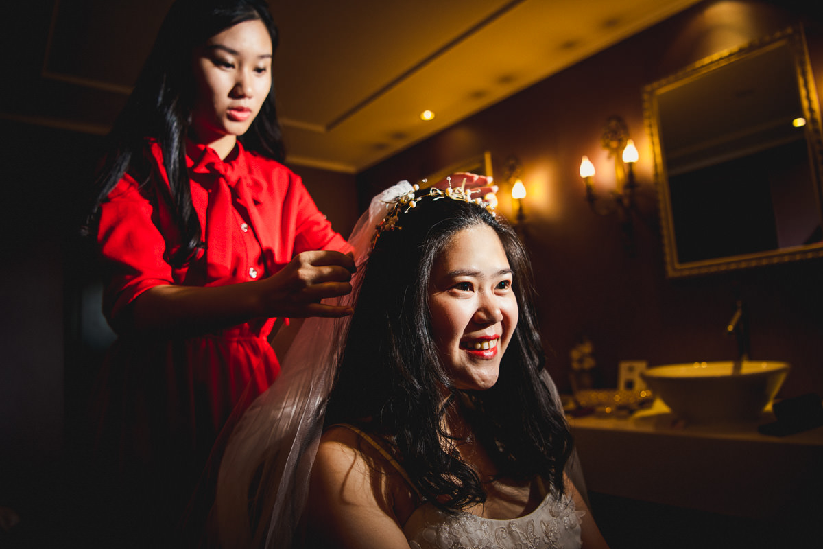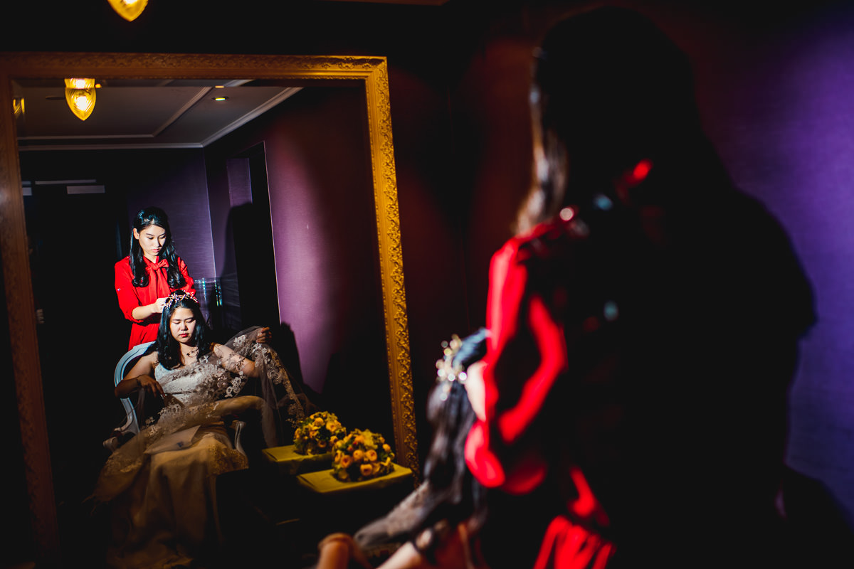 Da das Brautpaar ausschließlich für die Trauung ins Chateau Gütsch gekommen ist, hatten die beiden auch kein Zimmer dort. So dass der letzte Touch des Stylings kurzerhand in der Damentoilette im Untergeschoss durchgeführt wurde. Das war schon ein wenig merkwürdig, als ich zum Schluss mit auf der Damentoilette war, um davon ein paar Bilder zu machen. Zum Glück war diese Toilette nicht besonders frequentiert. Aber so ist es eben bei einer Hochzeitsreportage.