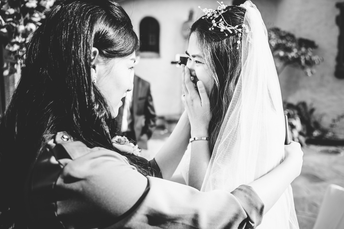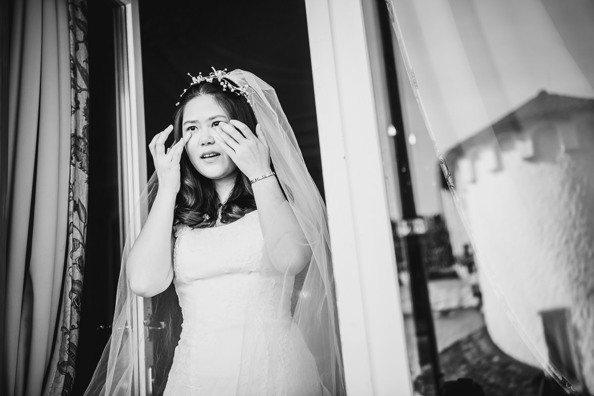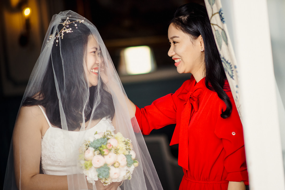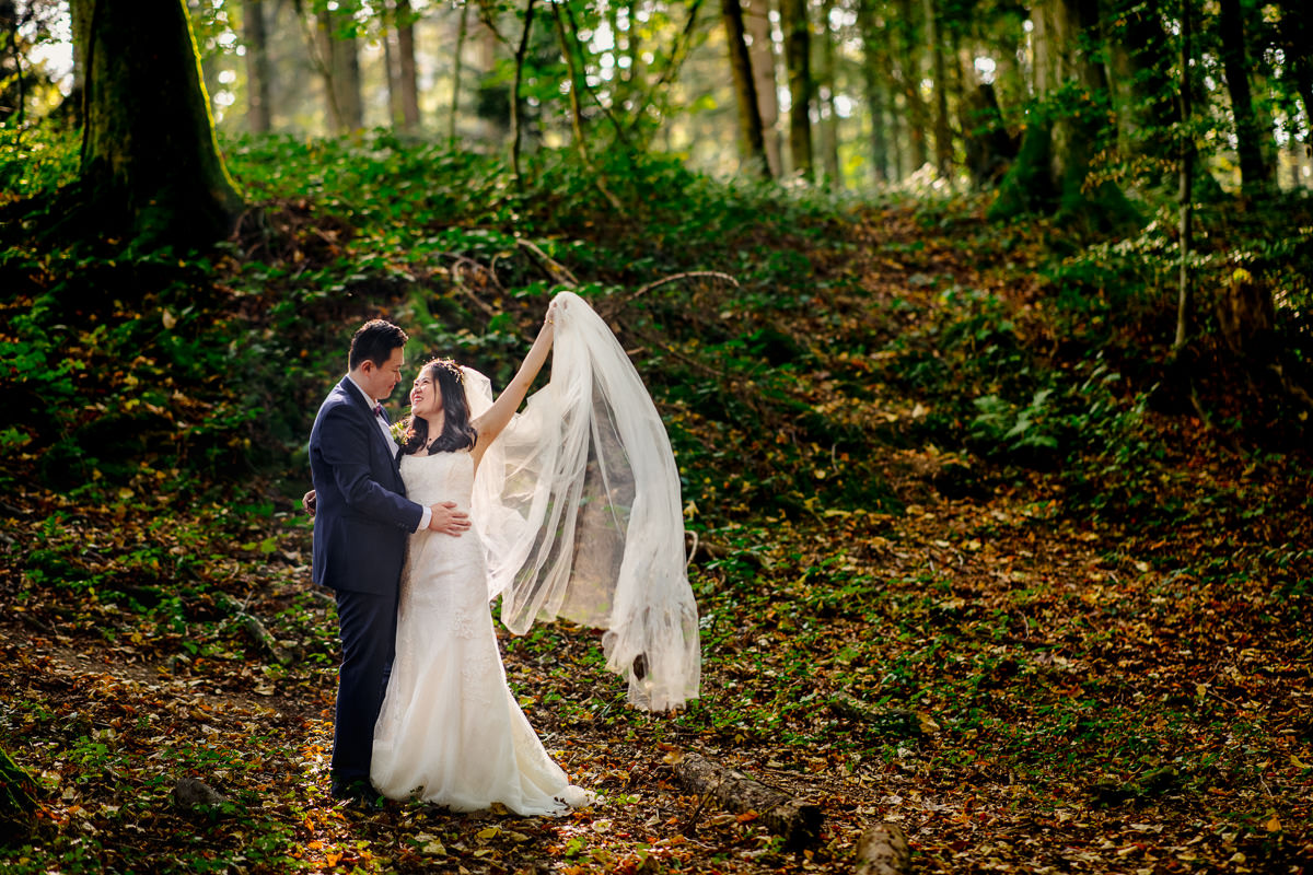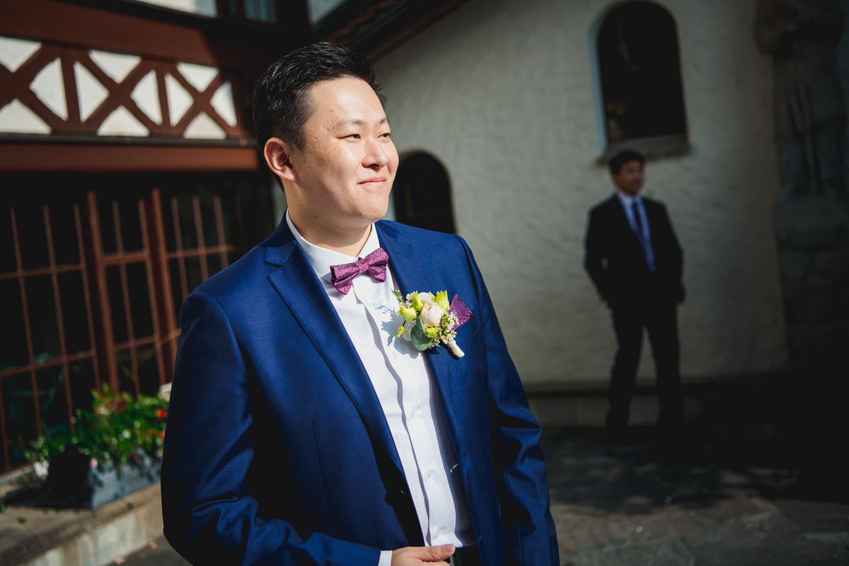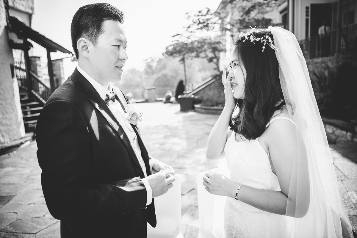 Als die Trauung dann immer näher rückte steigerte sich auch die Aufregung der Braut. Sichtlich von Emotionen gerührt fand die freie Trauung im Innenhof des Chateaus statt. Eine tolle Traurednerin, die die Trauung auf englisch leitete. Auch wenn das Brautpaar nicht perfekt englisch konnte, fanden die Worte der Traurednerin einen Weg direkt ins Herz der Braut. Der Bräutigam streamte die Trauung live nach Hause. Was ich schon ziemlich witzig fand. Dennoch war ich selbst sehr berüht, als die beiden sich in ihrer Heimatsprache das Trauversprechen gaben. Ich habe zwar kein Wort verstanden, aber es klang wahnsinnig emotional. Ich mag unheimlich gerne asiatische Pärchen. Insbesondere wenn diese in solchen Augenblicken ihre Emotionen zeigen. Danach konnten wir noch die restliche Zeit nutzen, um einige Hochzeitsbilder im Chateau Gütsch und der Umgebung zu machen.