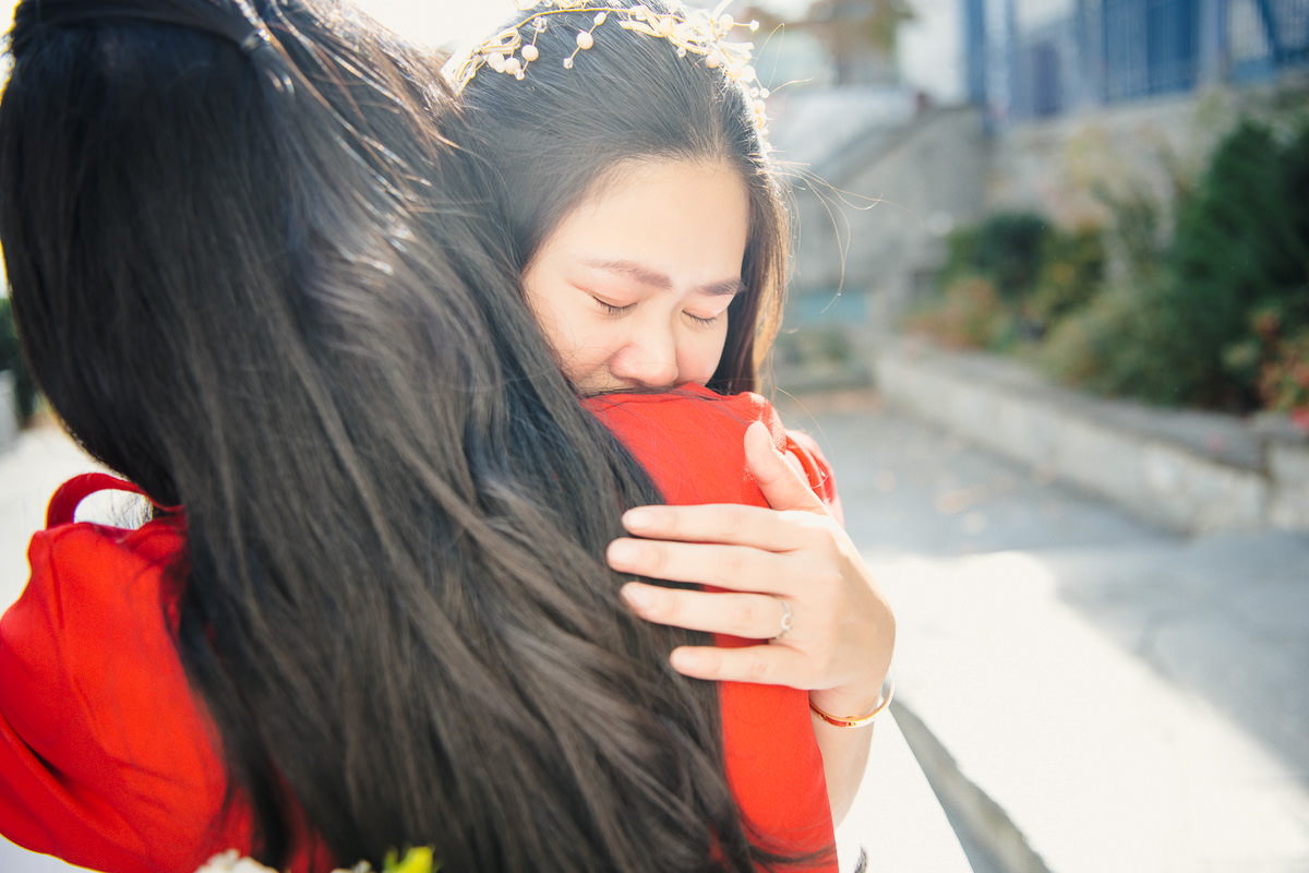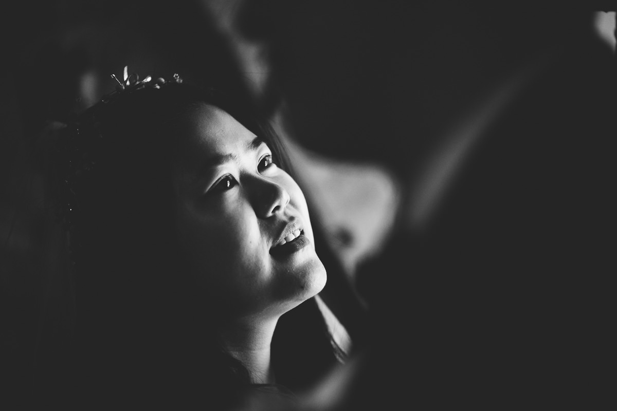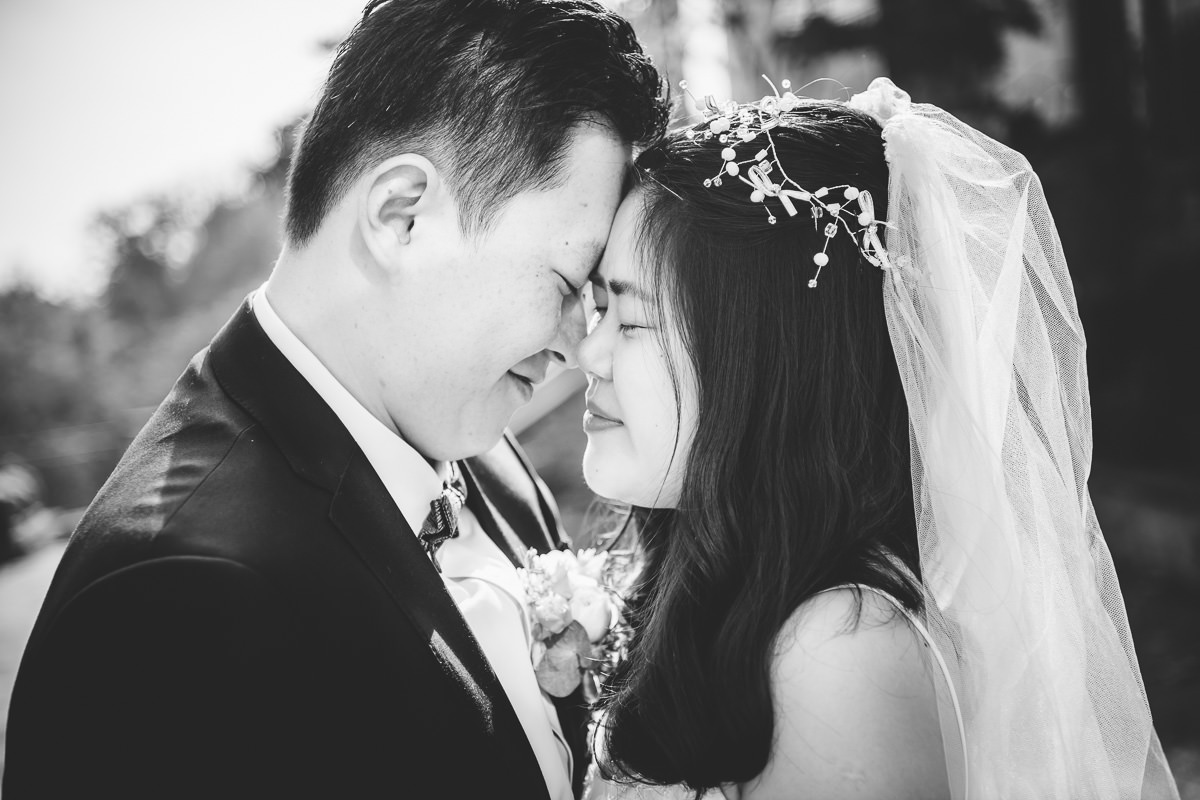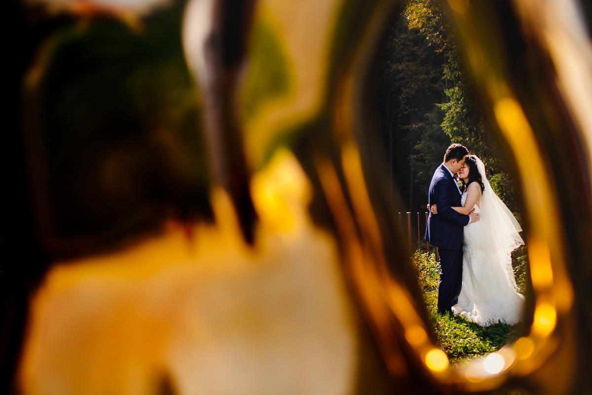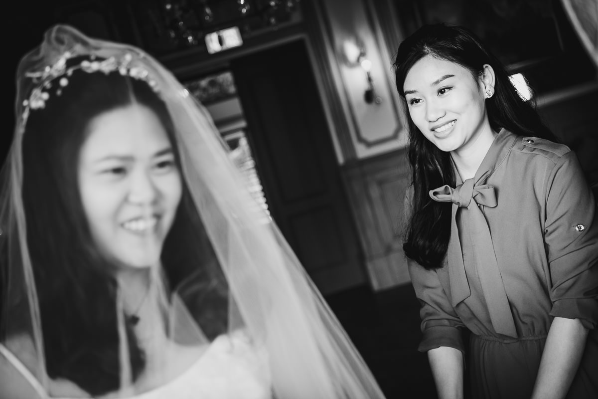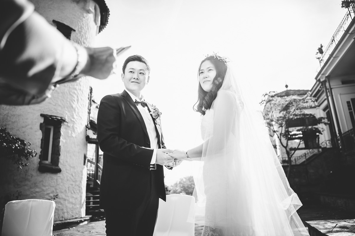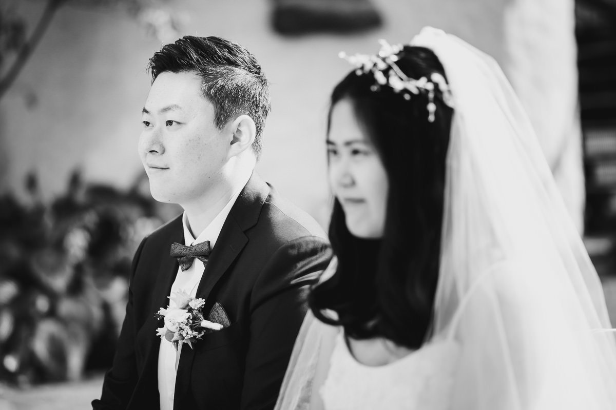 Als die Trauung dann immer näher rückte steigerte sich auch die Aufregung der Braut. Sichtlich von Emotionen gerührt fand die freie Trauung im Innenhof des Chateaus statt. Eine tolle Traurednerin, die die Trauung auf englisch leitete. Auch wenn das Brautpaar nicht perfekt englisch konnte, fanden die Worte der Traurednerin einen Weg direkt ins Herz der Braut. Der Bräutigam streamte die Trauung live nach Hause. Was ich schon ziemlich witzig fand. Dennoch war ich selbst sehr berüht, als die beiden sich in ihrer Heimatsprache das Trauversprechen gaben. Ich habe zwar kein Wort verstanden, aber es klang wahnsinnig emotional. Ich mag unheimlich gerne asiatische Pärchen. Insbesondere wenn diese in solchen Augenblicken ihre Emotionen zeigen. Danach konnten wir noch die restliche Zeit nutzen, um einige Hochzeitsbilder im Chateau Gütsch und der Umgebung zu machen.
