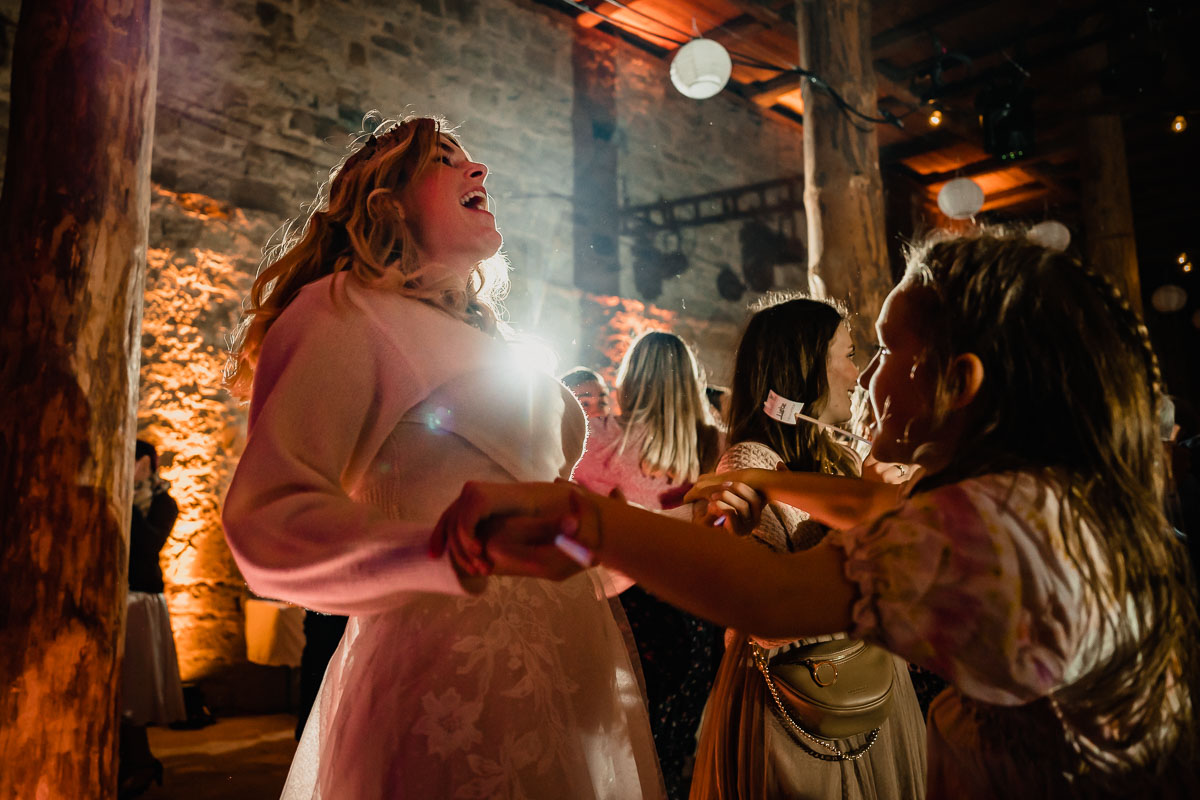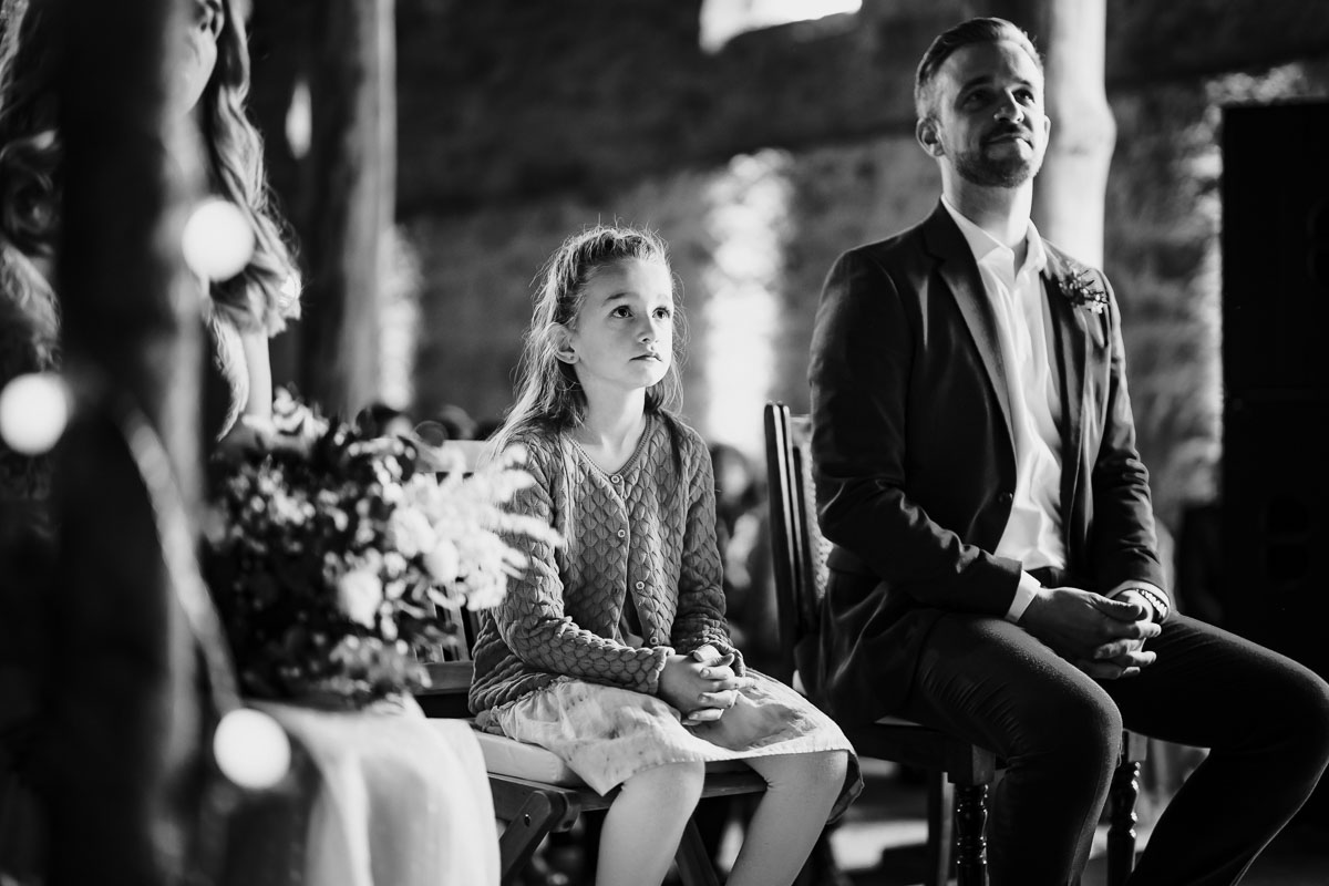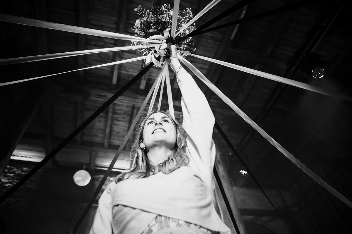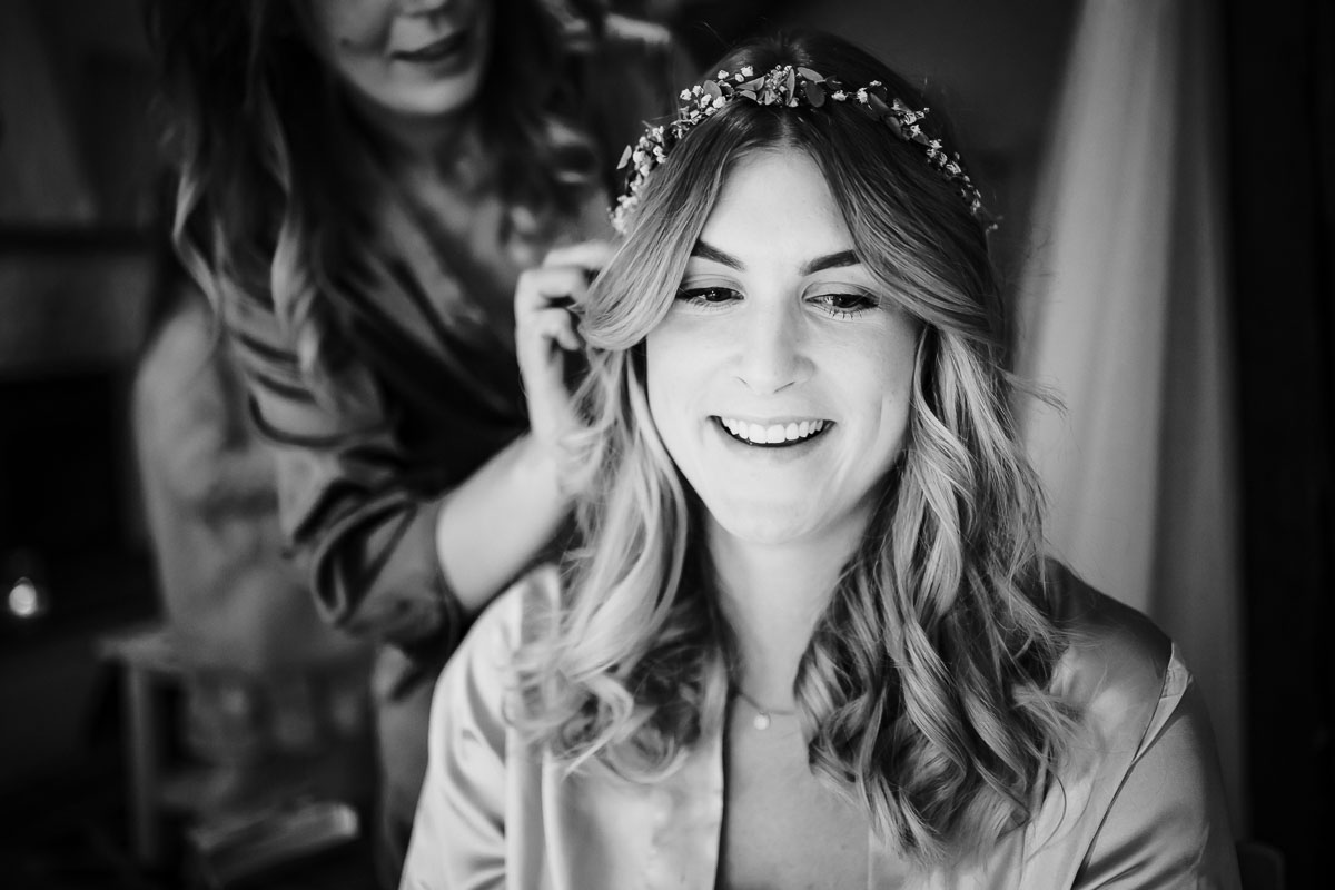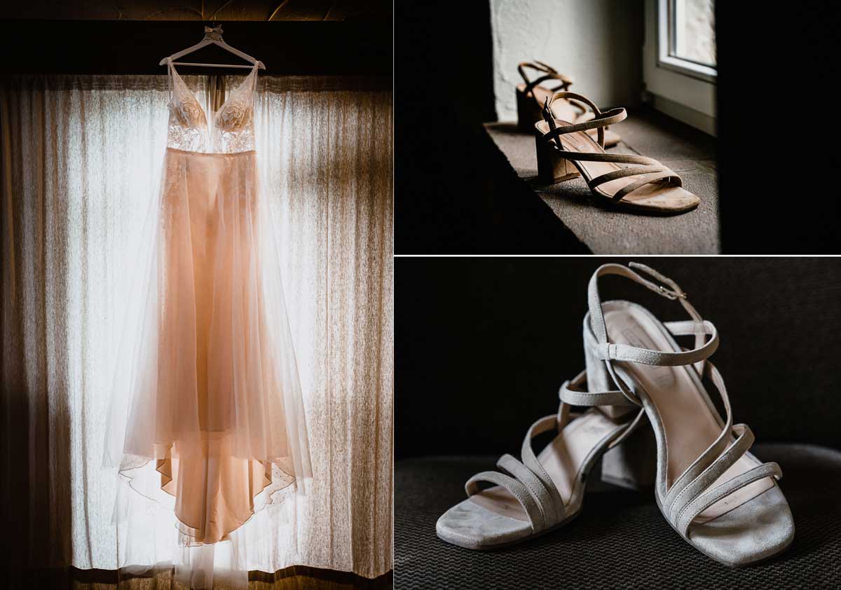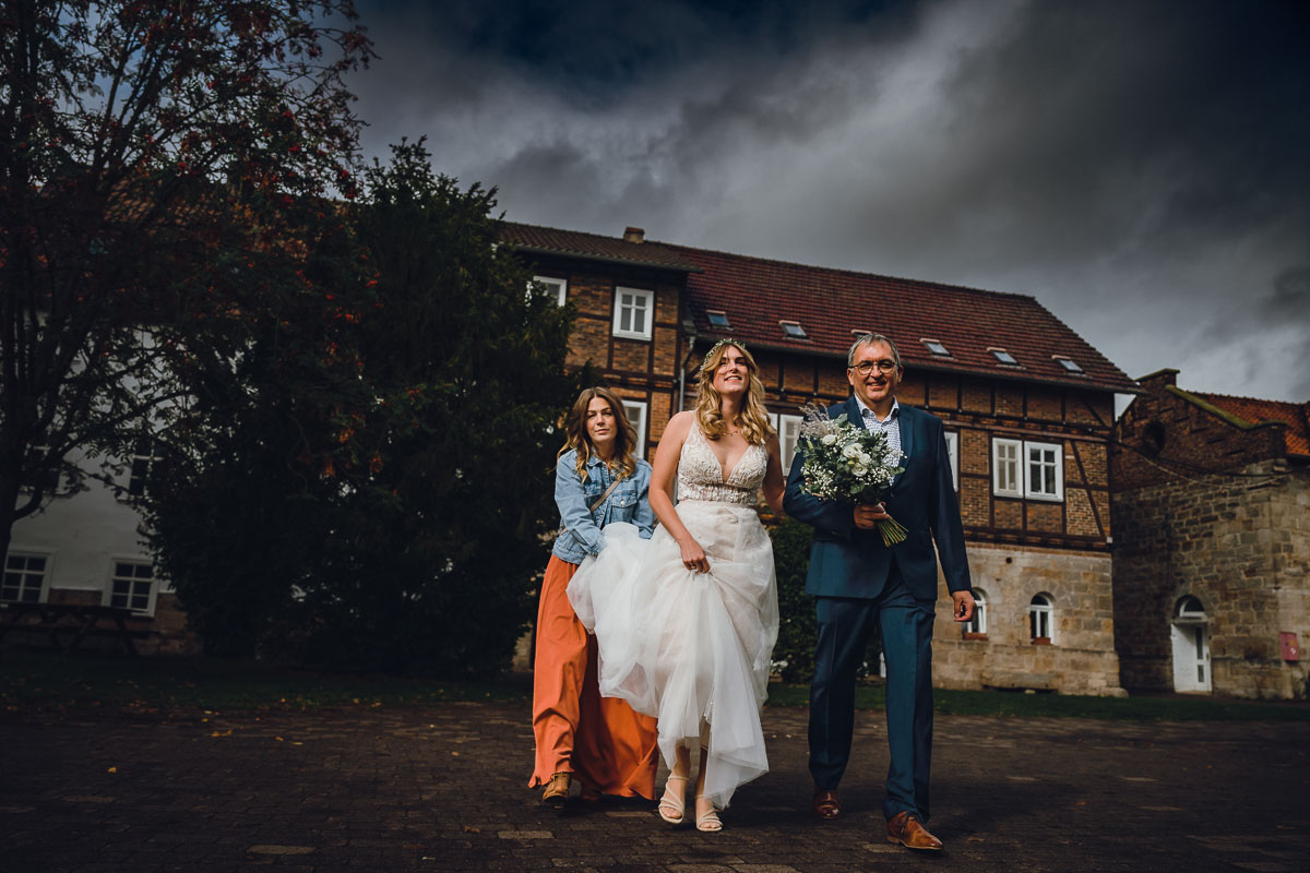 Die Brautvorbereitungen fanden im Gästehaus statt. Dort machte sich die Braut mit ihrer Mutter und Trauzeugin zurecht. Die Trauzeugin war auch für die Frisur verantwortlich. Da es tags davor noch recht kräftig geregnet hat, hat man sich dazu entschlossen die Trauung nicht wie geplant draussen stattfinden zu lassen. Sondern in die Scheune zu verlegen. Viele der Gäste sind bereits tags davor angereist. In der Zwischenzeit wurde die Scheune noch festlich dekoriert und auch die Bestuhlung für die freie Trauung arrangiert. Und bald war es dann soweit, dass die Braut von ihrem Vater zur Trauung abgeholt wurde.