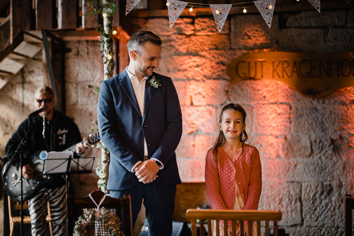Die Trauung wurde vom Bruder der Braut geleitet. Eine Besonderheit war, daß der Bräutigam bereits eine Tochter hat, die bei der Trauung natürlich auch eine Hauptrolle spielte. Denn sie ist ganz klar der Mittelpunkt der Beiden. Und durfte auch bei der Trauung im Gut Kragenhof die ganze Zeit zwischen den Beiden sitzen. Sie wurde natürlich auch gefragt, ob sie der Ehe zustimmt. Was sie mit einem klaren Ja beantwortete.