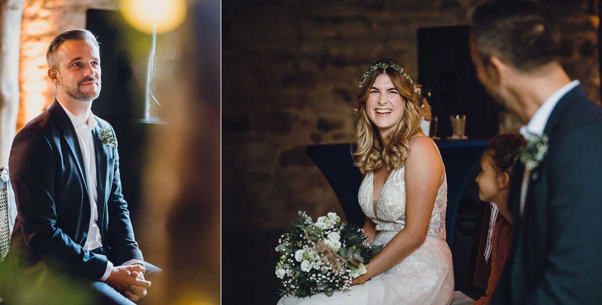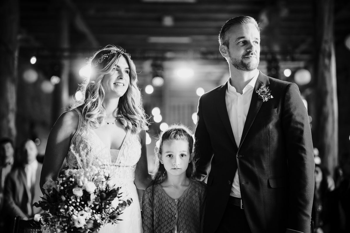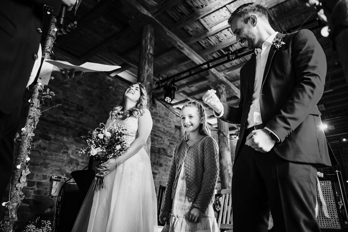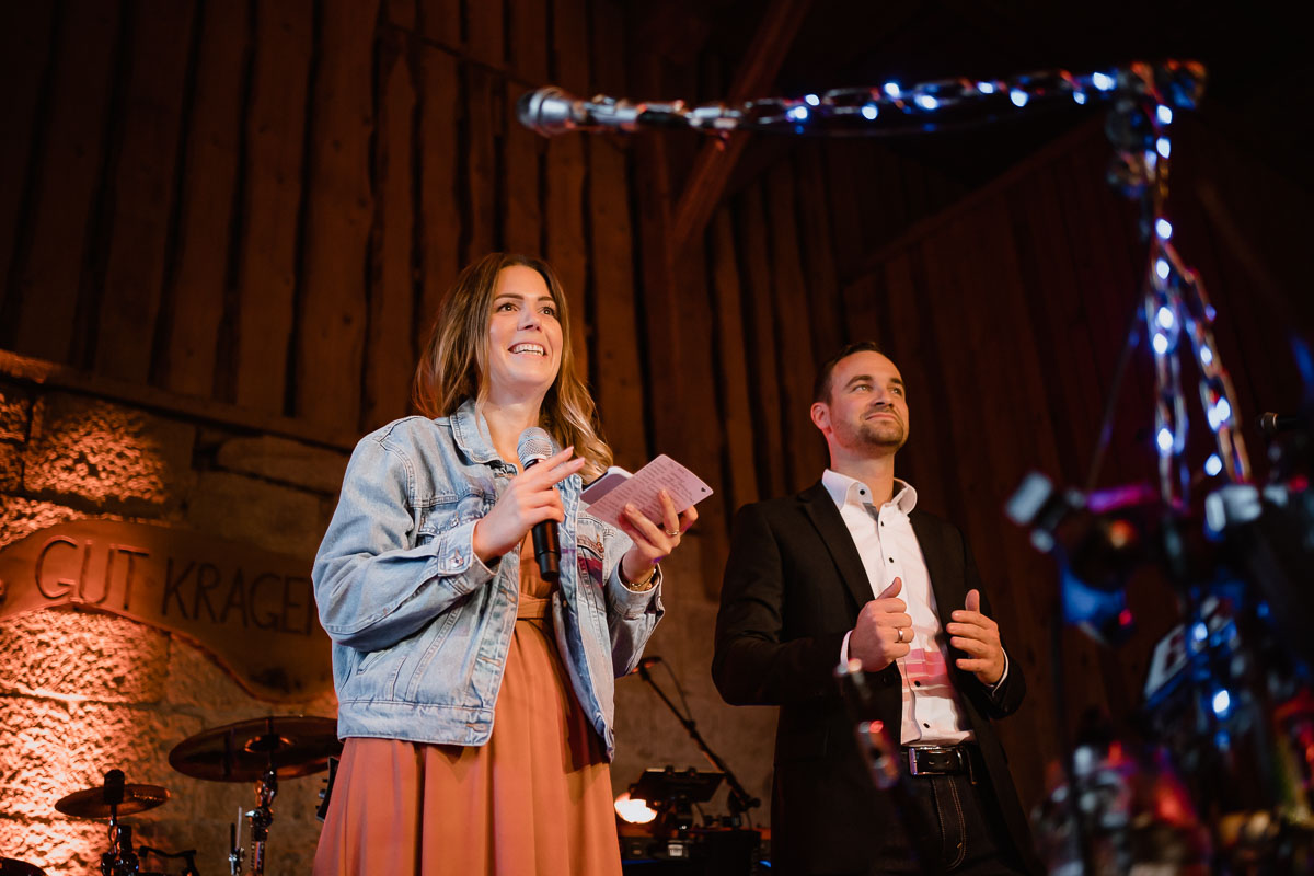 Leider hat das Wetter nicht so ganz mitgespielt. Selbst am Morgen war der letzte Regen der Nacht noch zu spüren. Dadurch war die Wiese noch feucht und die Ungewissheit groß. Sodaß man sich dazu entschlossen hat, die freie Trauung in der Scheune durchzuführen. Da die Scheune viel Platz bietet, stellte diese kein Problem dar. Für das Brautpaar wurde einfach auf der Bühne Platz geschaffen.
