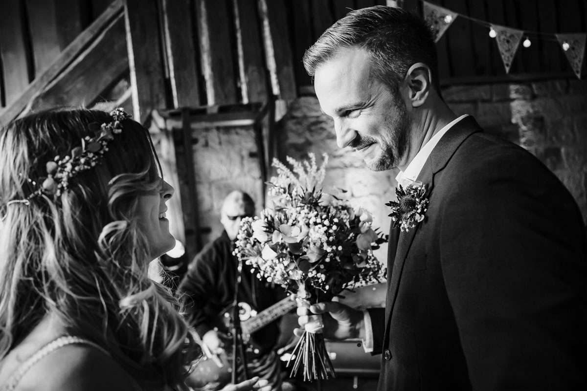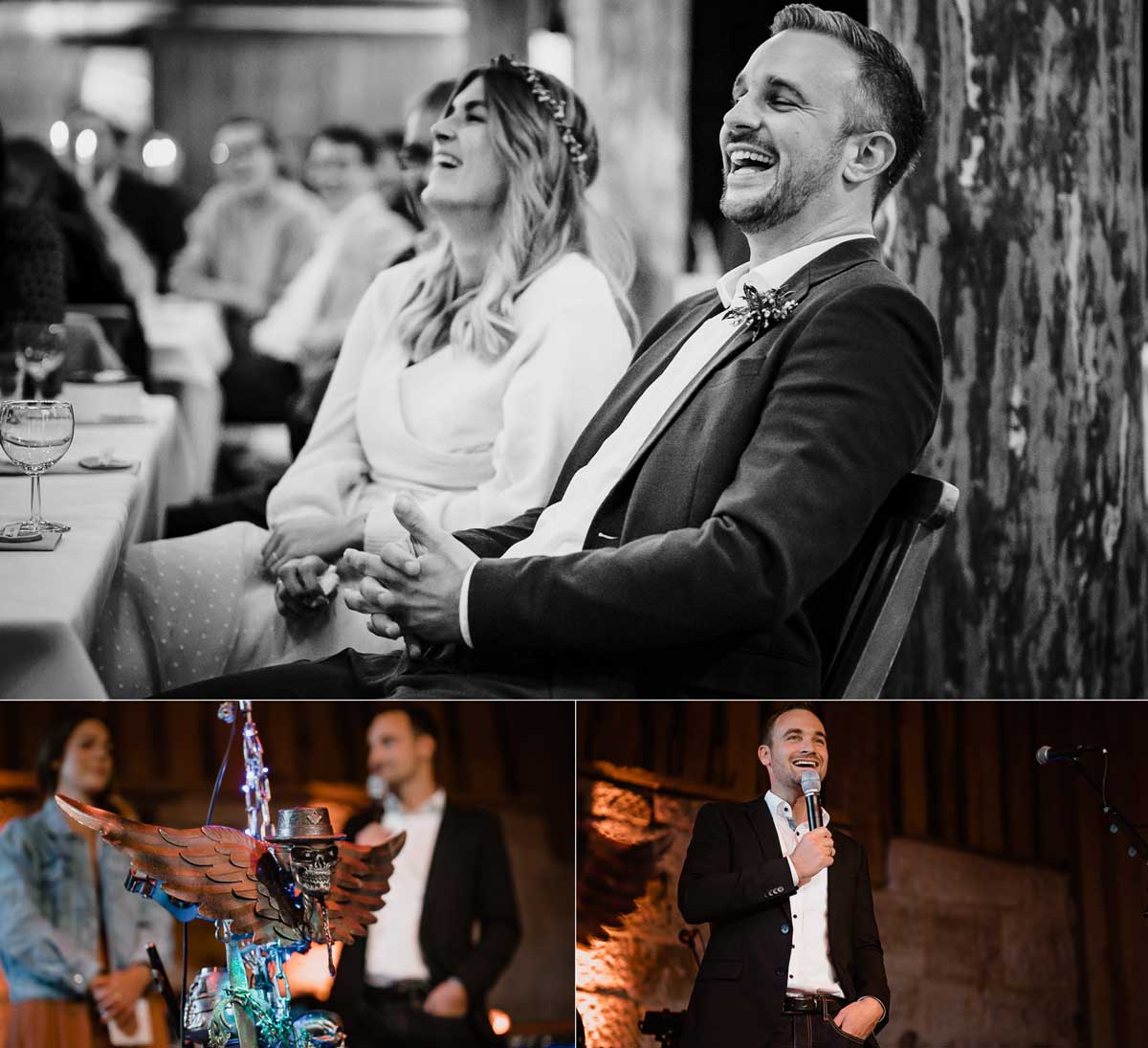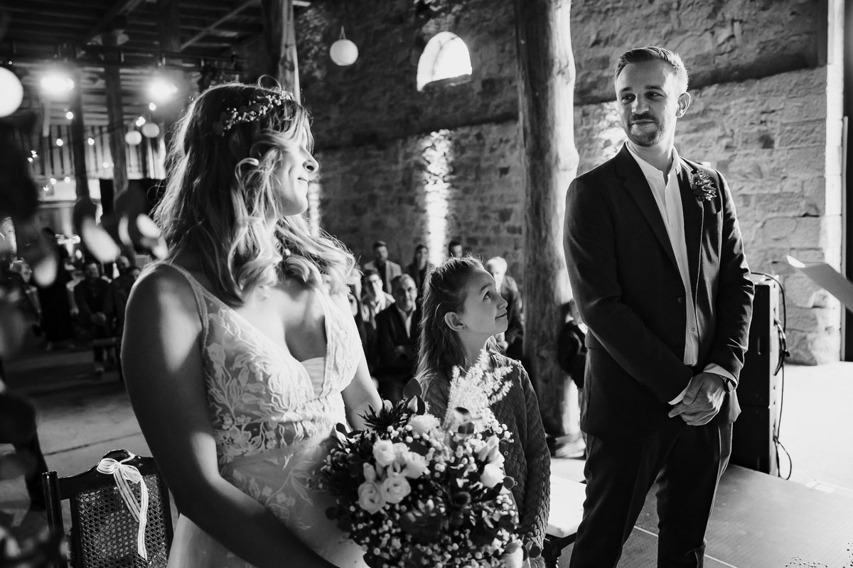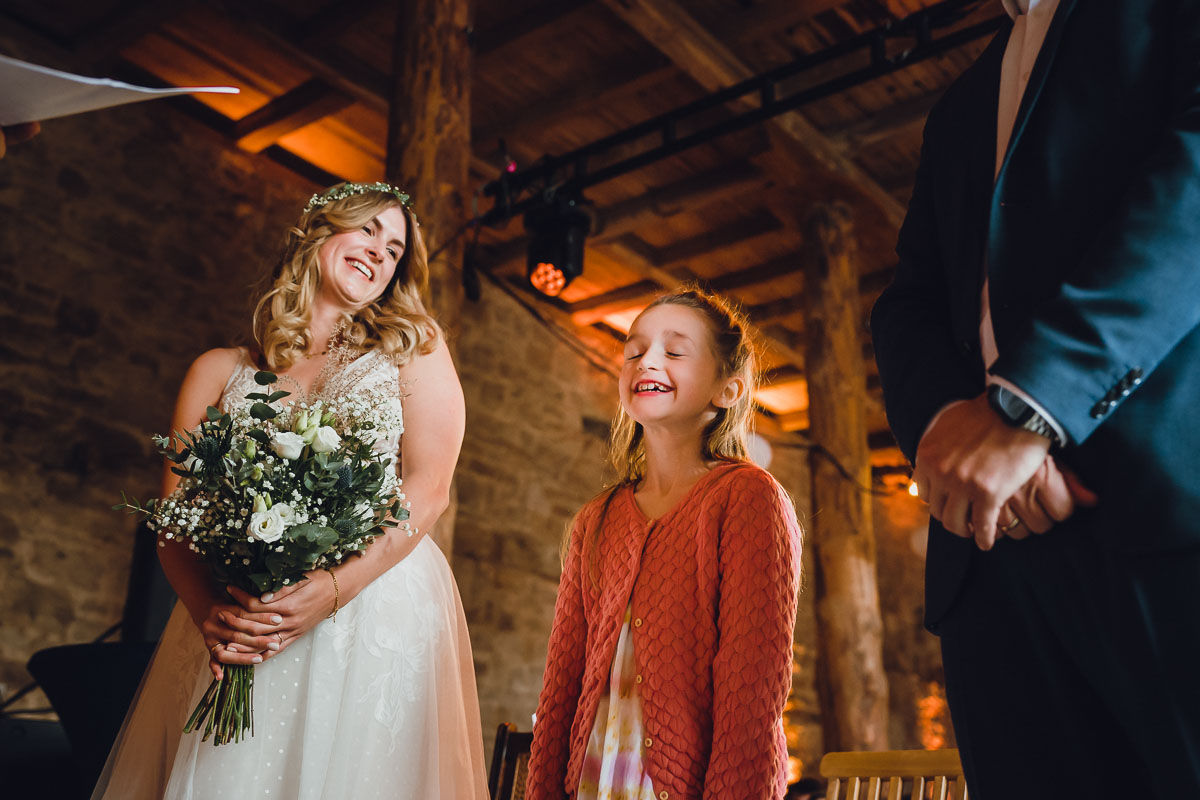 Leider hat das Wetter nicht so ganz mitgespielt. Selbst am Morgen war der letzte Regen der Nacht noch zu spüren. Dadurch war die Wiese noch feucht und die Ungewissheit groß. Sodaß man sich dazu entschlossen hat, die freie Trauung in der Scheune durchzuführen. Da die Scheune viel Platz bietet, stellte diese kein Problem dar. Für das Brautpaar wurde einfach auf der Bühne Platz geschaffen.