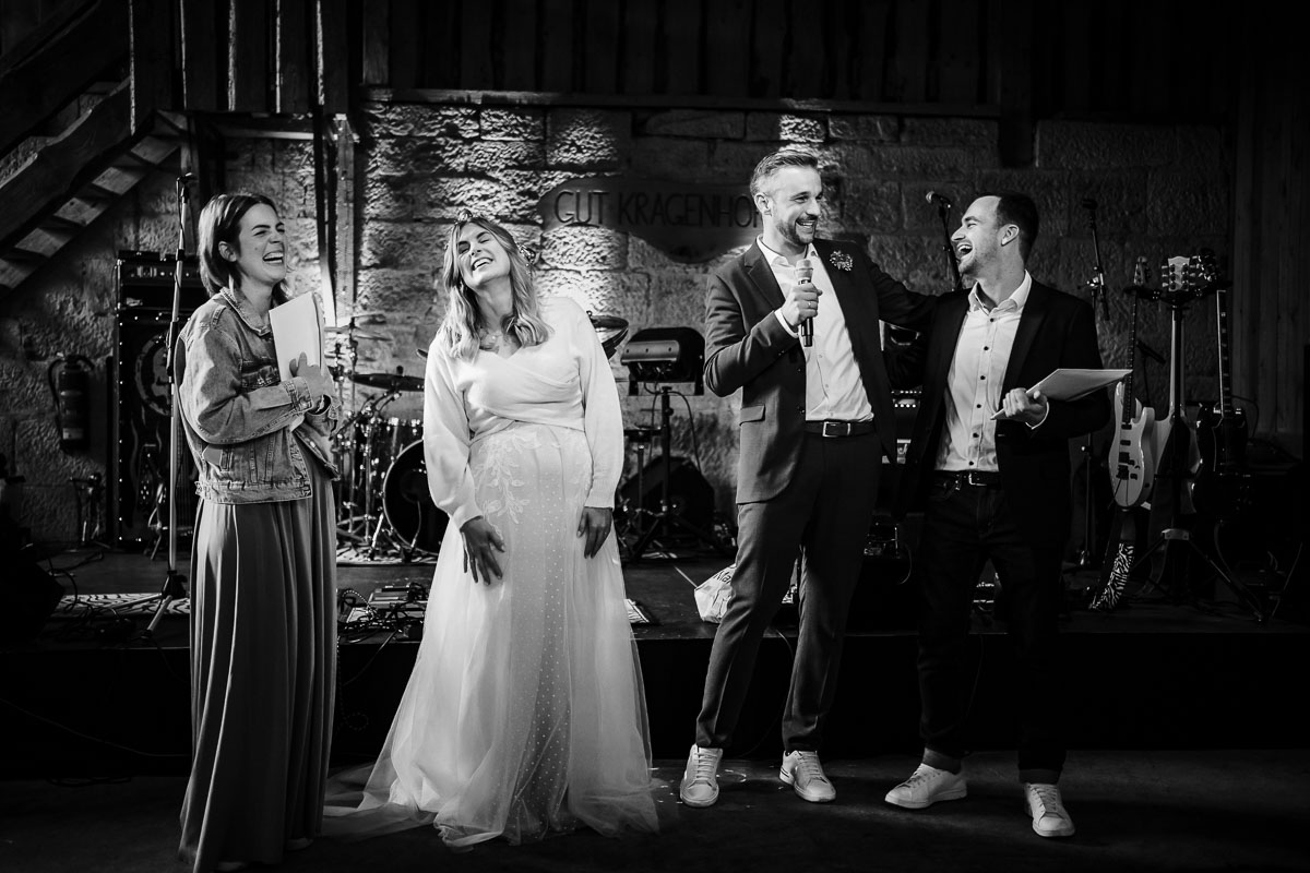 Für Hochzeiten im Gut Kragenhof steht die Veranstaltungsscheune, das Atelier und der alte Kuhstall zur Verfügung. Hier können Feiern mit über 100 bis zu maximal 300 Personen ausgerichtet werden. Die Scheune ist sehr großräumig, und bietet genug Fläche für eine ausgiebige Bestuhlung, plus einer Bühne für Bands. Auf der Wiese vor oder hinter der Scheune können freie Trauungen veranstaltet werden. Und falls es doch mal regnen sollte, verlegt man einfach die Trauung in die Veranstaltungsscheune. Wie auch bei dieser Hochzeit im Gut Kragenhof.