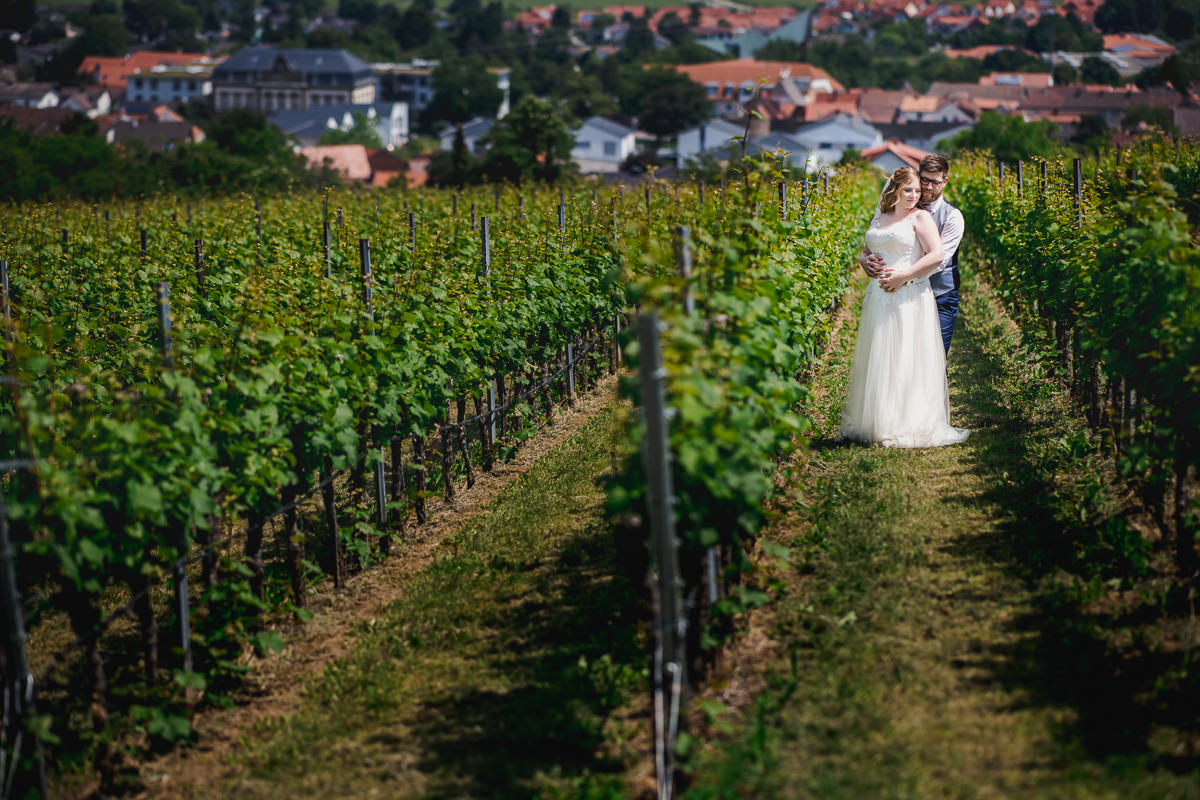 Ihr erinnert euch doch noch, an diesen Wahnsinnssommer von 2018. Dieser hat schon im Mai angefangen. Bei höchst sommerlichen Temperaturen starteten wir in Wachenheim mit den Hochzeitsportraits. Nicht unbedingt die besten Vorraussetzungen für die Portraits. Wir starteten in den Weinreben und arbeitetet uns bis zur Stadt vor. Dabei nutzten wir auch die Kirche, in der später noch die Trauung stattfand.
