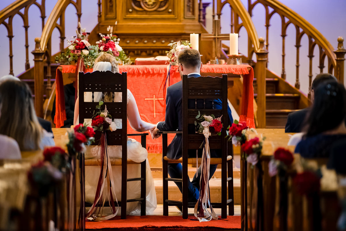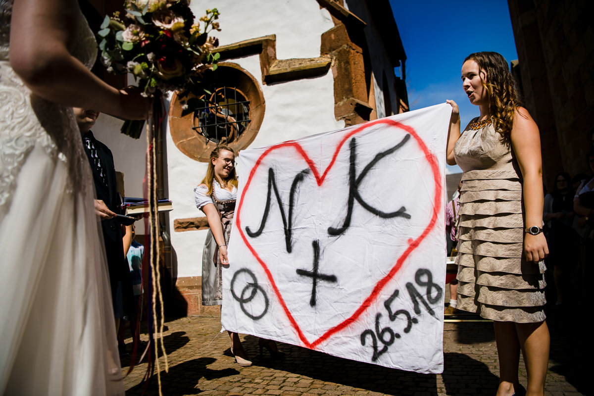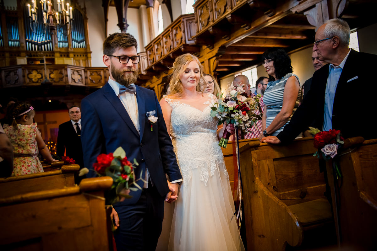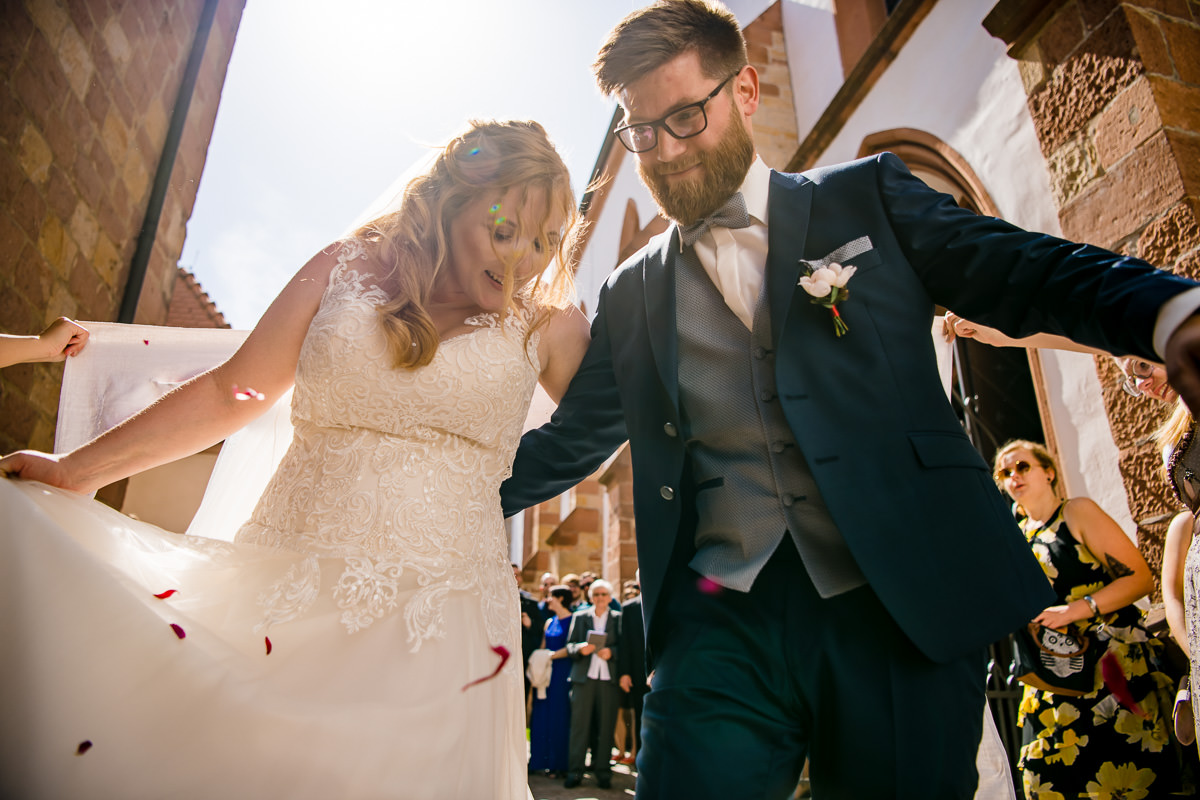 Die kirchliche Trauung fand in der Simultankirche St. Georg in Wachenheim statt. Leider wurde ich durch die Pfarrerin eingeschränkt. Zuerst hiess ich ich dürfe gar nicht fotografieren. Zum Glück konnte ich mich noch einigen, so dass ich zumindest aus bestimmten Perspektiven noch Fotos machen durfte. Eigentlich sehr schade, da ich ein paar Wochen drauf in der gleichen Kirche mit einem anderen Pfarrer keine Beschränkungen hatte. Deswegen zeige ich hier nur wenige Bilder der Trauung. Im Anschluss fand ein kleiner Sektempfang vor der Kirche statt. Bevor es im Anschluss nach Deidesheim ging.