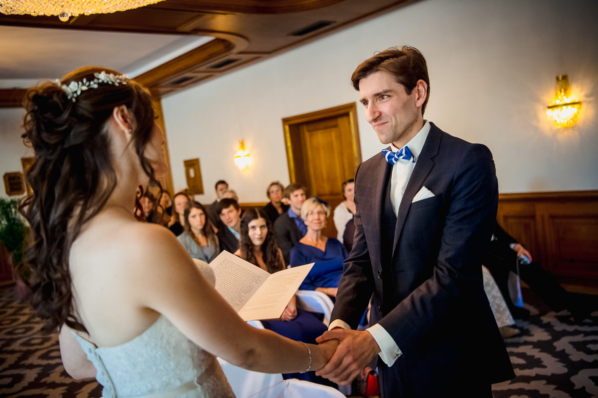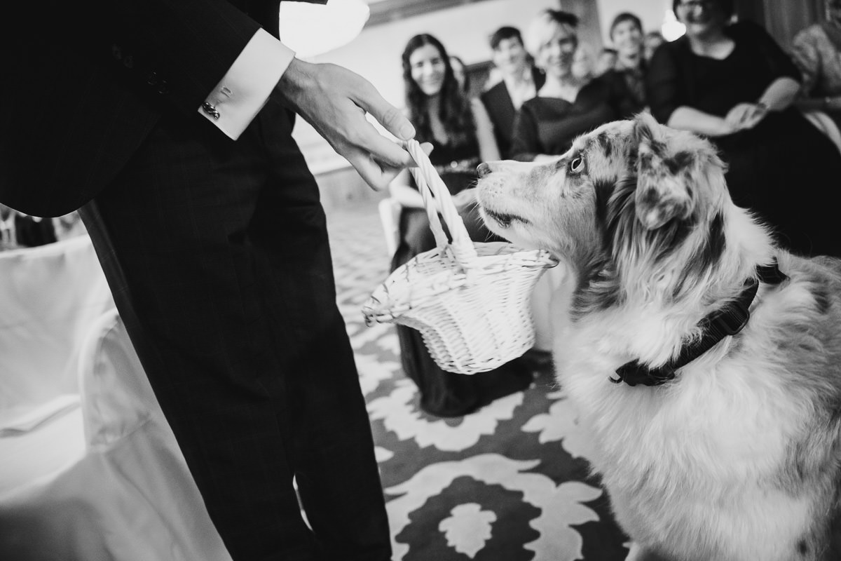 Anschliessend fand die freie Trauung in einem der Säle des Hotel Kronsberg statt. Für draussen war es an dem Tag einfach zu kalt, auch wenn stellenweise die Sonne geschienen hat. Da die beiden stolze Hundeeltern sind, hatte auch der Hund eine tragenden Rolle. Er durfte die Ringe bringen. Es waren zwar nur zwei Meter, aber die hat er trotz Riesenaufregung gemeistert.
