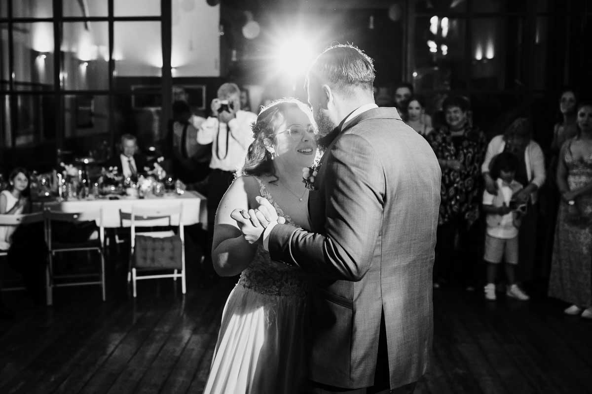 Im Saal mit großer Bühne, hohen Decken und altem Dielenboden wirken Reden und erster Tanz besonders groß. Diese Architekturelemente schaffen starke Kontraste und emotionalen Bildstoff.