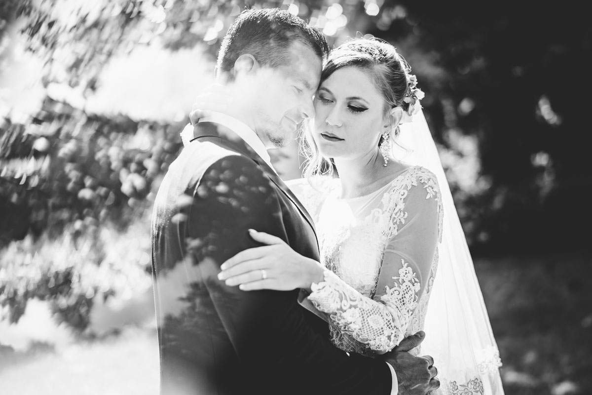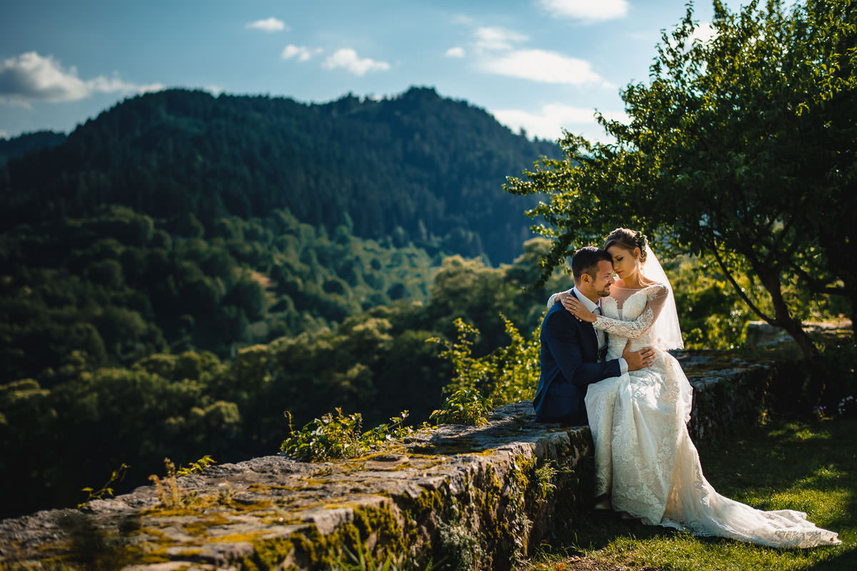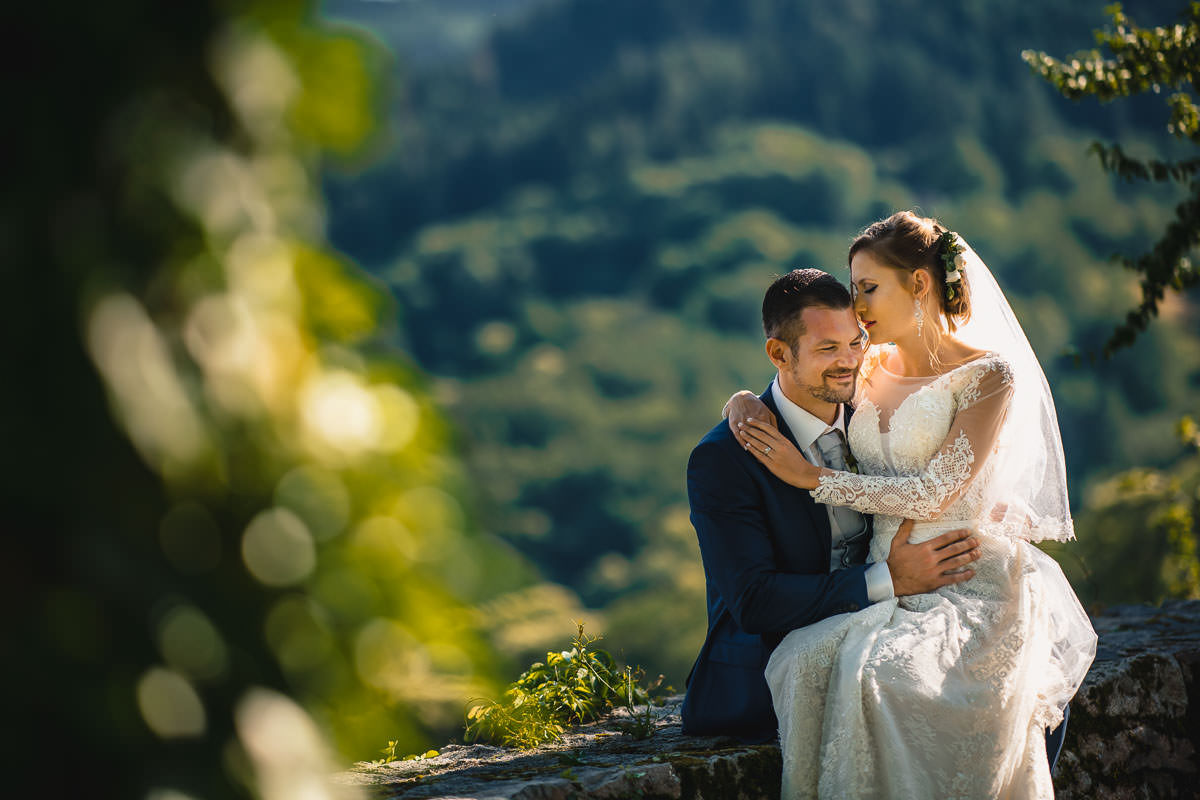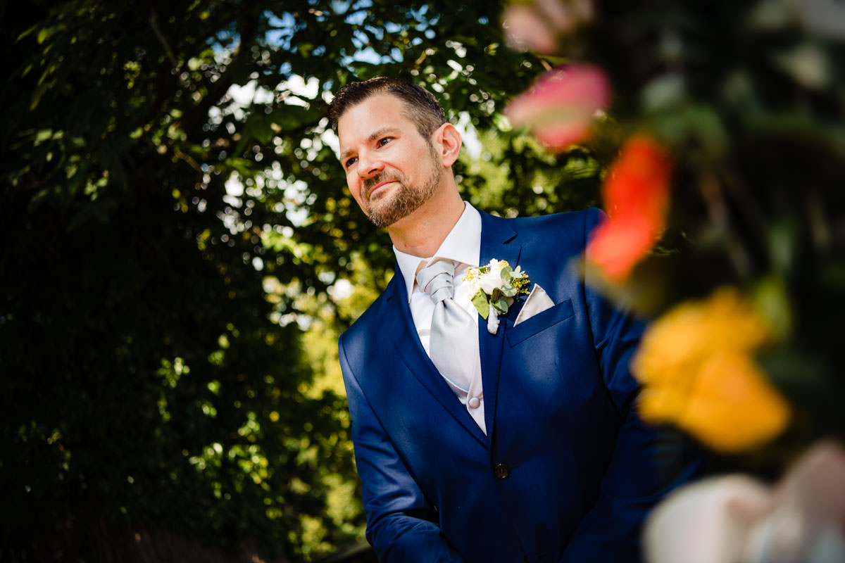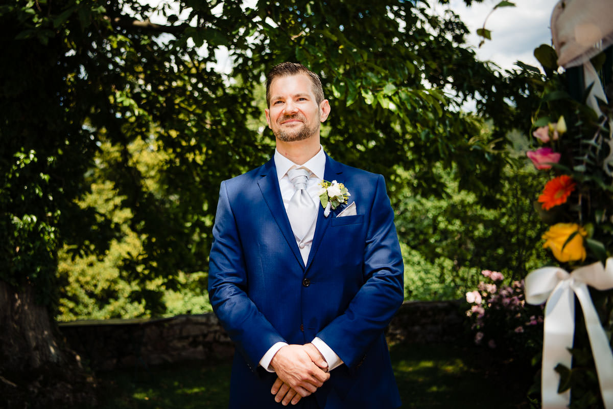 Bei herrlich sommerlichem Wetter fand die freie standesamtliche Trauung mitsamt Übersetzerin im Rosengarten des Schlosses statt. Wie bereits erwähnt ist das Ambiente im Rosengarten mit Blick ins Tal wunderschön. Im Anschluss fand der Sektempfang auf der Terrasse der Schloss Schänke statt. Nachdem der erste Durst gestillt war, bin ich mit den beiden für die Hochzeitsportraits losgezogen. Die hochzeitsbilder haben wir alle auf dem Gelände des Schlosses gemacht. Dabei habe ich auch eines meiner Lieblingsportraits von diesem Jahr gemacht.
