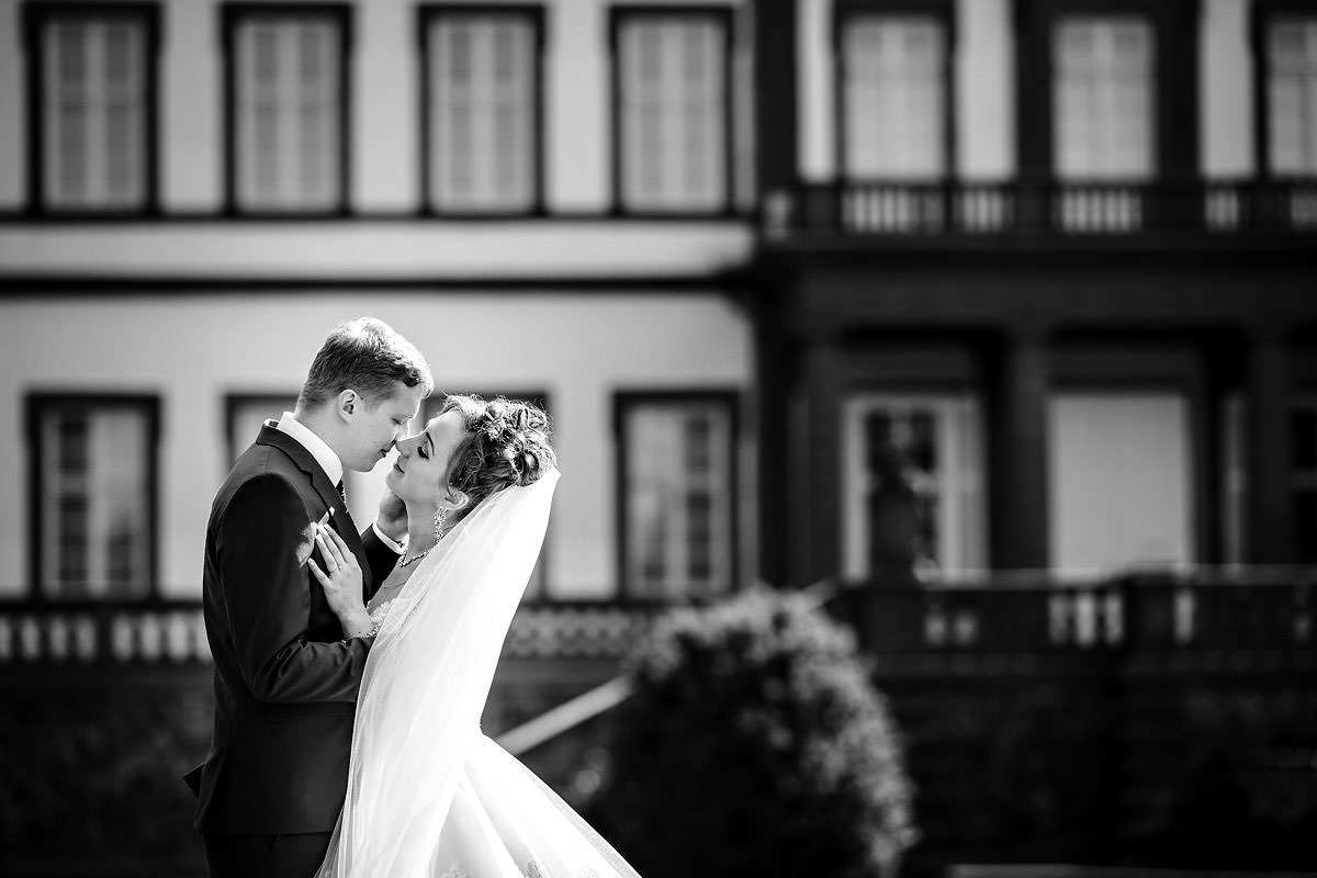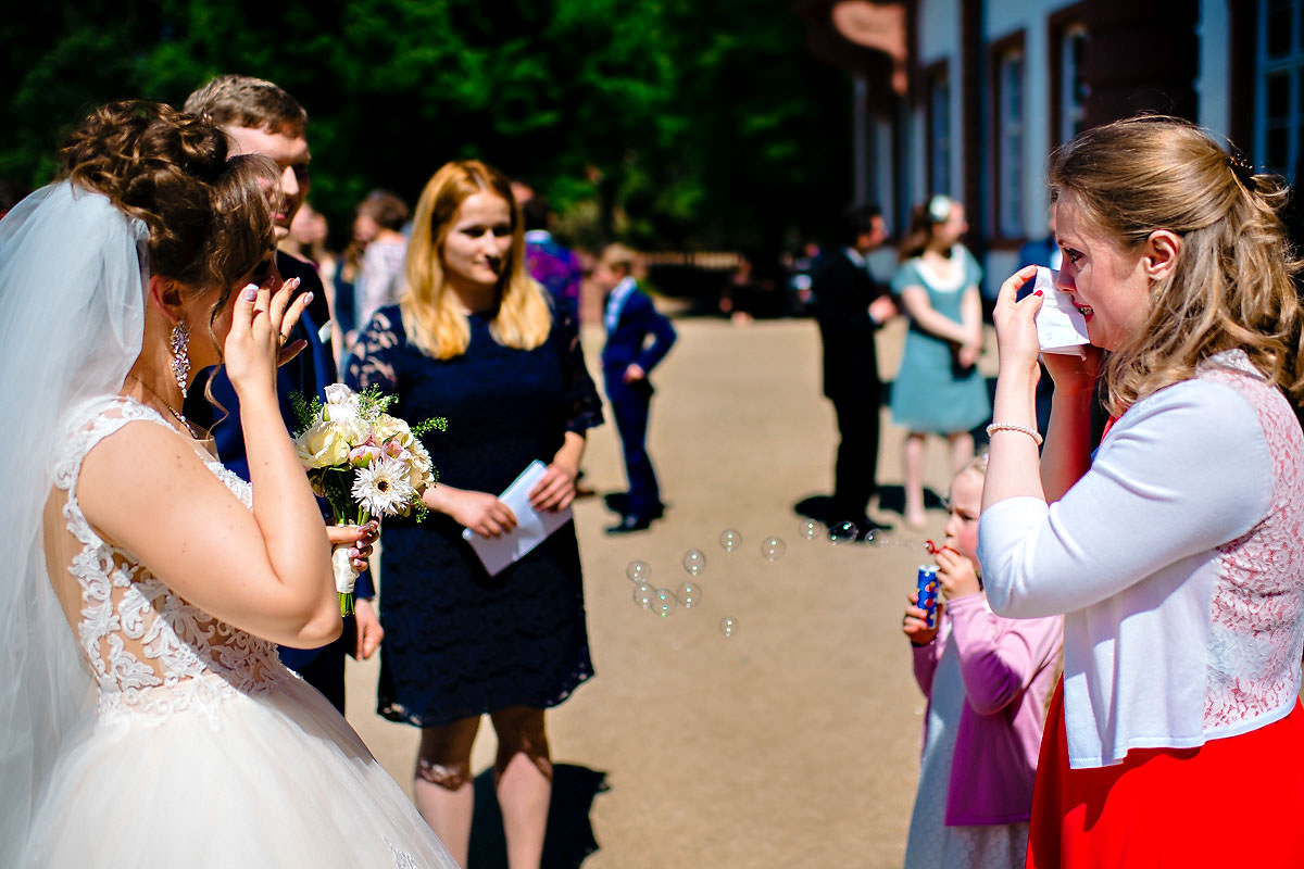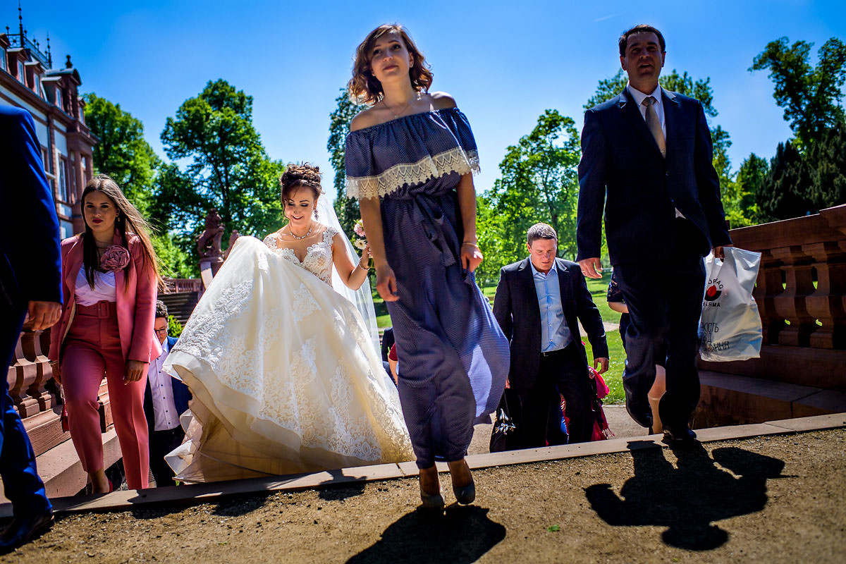 Die Standesamtliche Trauung fand mittags im Schloss Philippsruhe statt. Das Schloss bietet einen wunderschönen Raum für die Trauung, in der auch ausreichend Gäste Platz finden. Noch dazu sind die Standesbeamten und Standesbeamtinnen sehr nett und machen den Rahmen erst richtig schön. Auch wenn ein Teil der Gäste, weil aus Russland kommend, nicht viel verstanden hat, ist der Funke dennoch auf alle übergesprungen. Zuvor haben wir allerdings noch einige Hochzeitsbilder im Schlosspark gemacht. Da wir morgens damit begonnen haben, war der Park auch noch sehr schön leer. Bereits morgens hatten wir einen blauen Himmel und sehr viel Sonne. Zwar der Traum eines jeden Brautpaares, aber nicht gerade der Traum eines jeden Fotografens. Denn es ist nicht einfach um die Tageszeit mit dem sehr harten Licht umzugehen. Aber ich denke, das haben wir sehr gut hinbekommen.