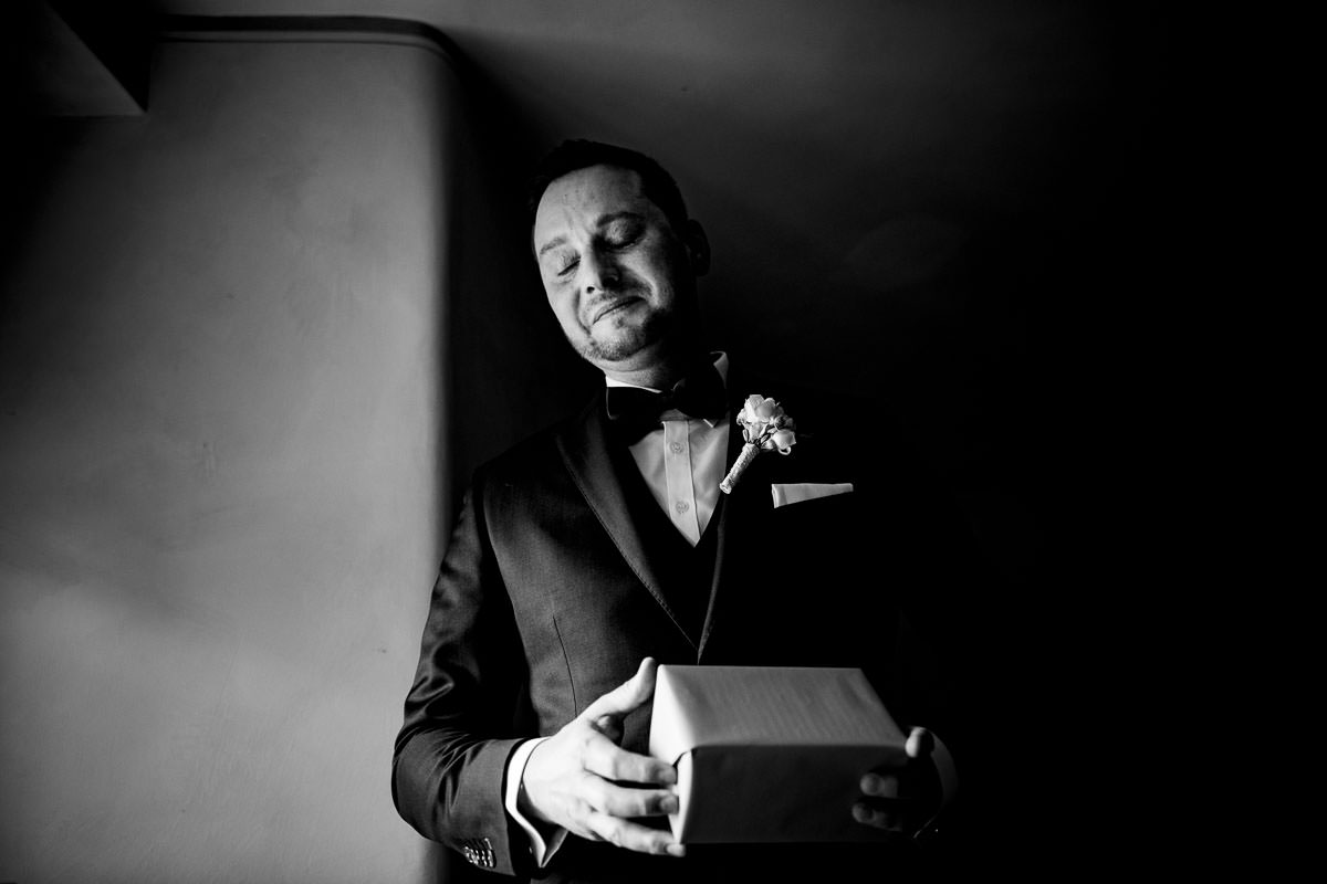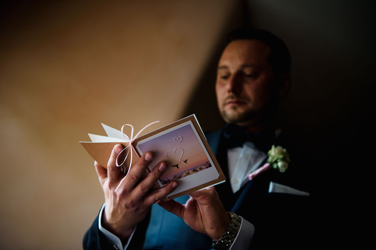Aber nun zur eigentlichen Hochzeit auf Schloss Romrod. Zu Beginn hatte ich erstmal das Vergnügen mit der zauberhaften Braut Jana. Die Brautvorbereitungen fanden in der Hofreite statt, die sich nicht mehr direkt auf dem Schlossgelände befindet. Anwesend waren die Brautjungfern, die Mutter der Braut mehrere Stylistinnen, sowie Videograf und ich. Also ganz schön was los. im Anschluss bin ich zu Dennis, der sich in einem der Hotelzimmer fertig gemacht hat. Hier waren wir dann nur zu fünft, also angenehm ruhig. Hier wurde es dann auch zum ersten Mal emotional, als der Bräutigam einen Brief seiner Braut mitsamt Geschenk erhalten hat. Übrigens schön zu sehen, dass auch Hochzeitsfotografen, die solche Szenen schon oft erlebt haben, doch an so einem Tag selbst nervös sind, und Gefühle zeigen.