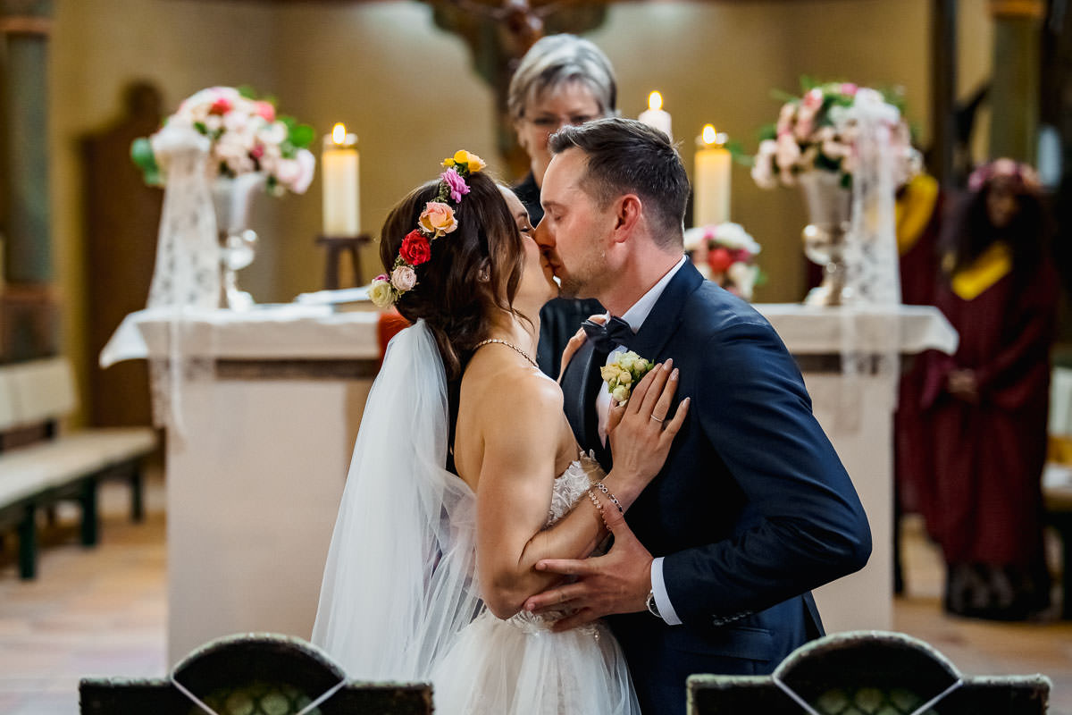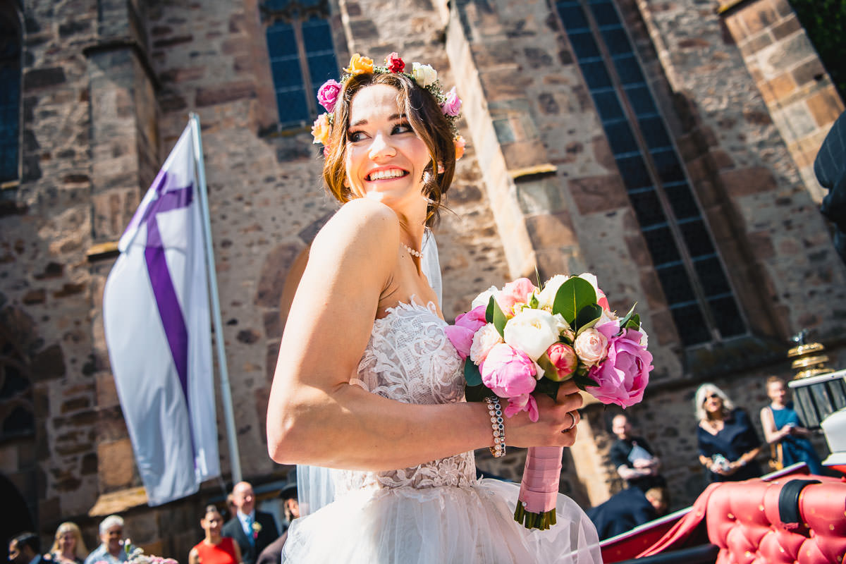Die kirchliche Trauung fand in der evangelischen Walpurgiskirche in Alsfeld statt. Und auch hier ging es emotional weiter. Sowohl Einzug als auch die Trauung selbst waren sehr schön. Beim Auszug erwartete die braut eine Überraschung in Form einer Kutsche. So dass die Beiden erstmal gemütlich wieder zum Schloss Romrod fahren konnten.