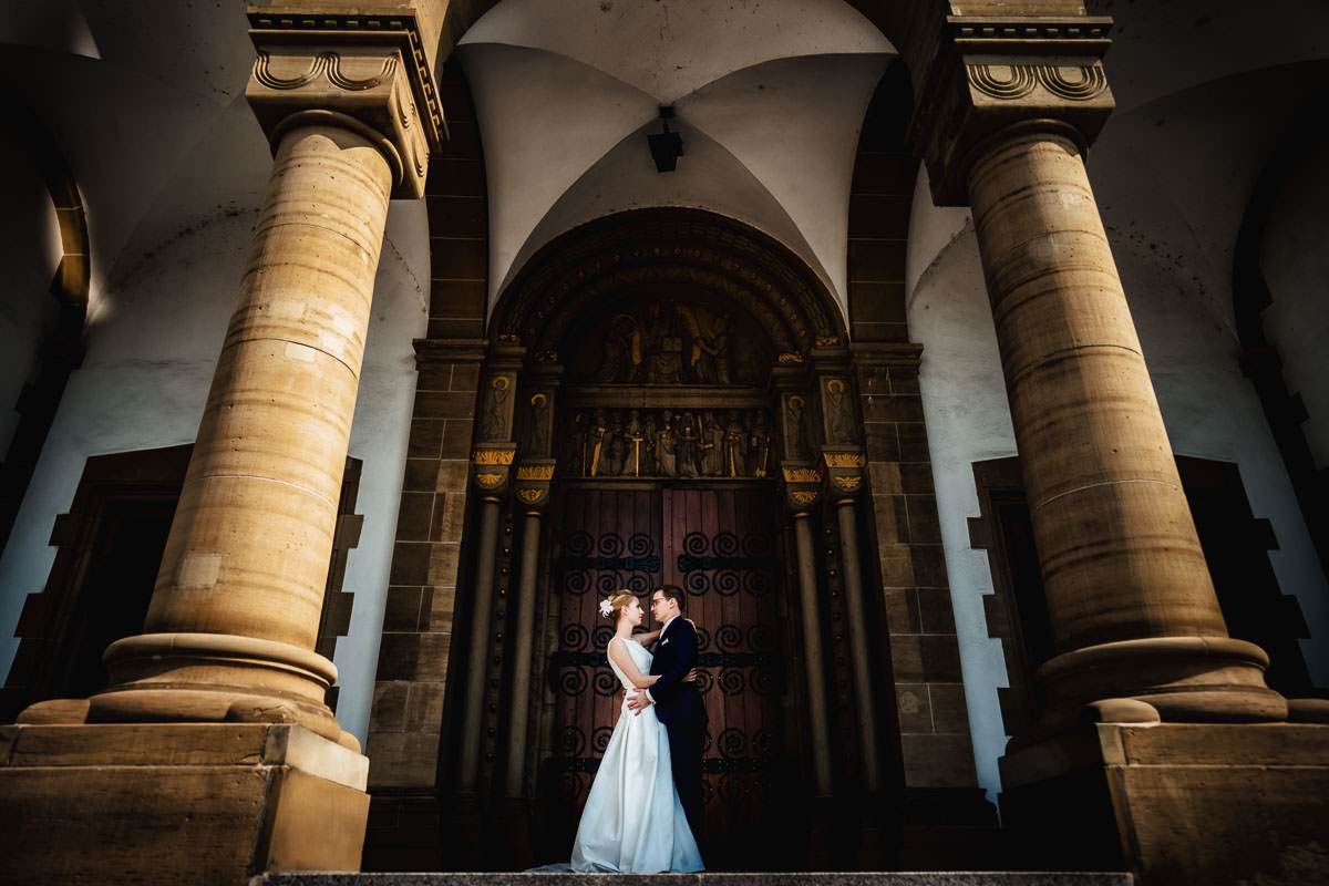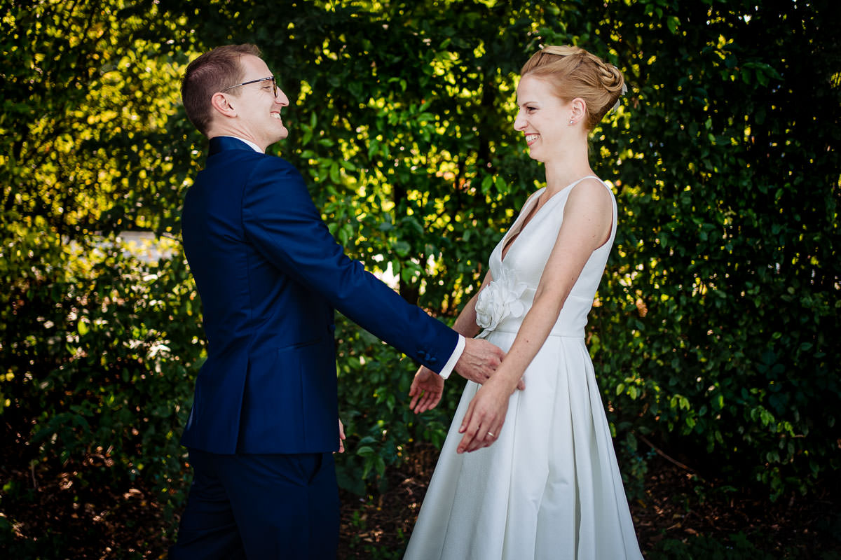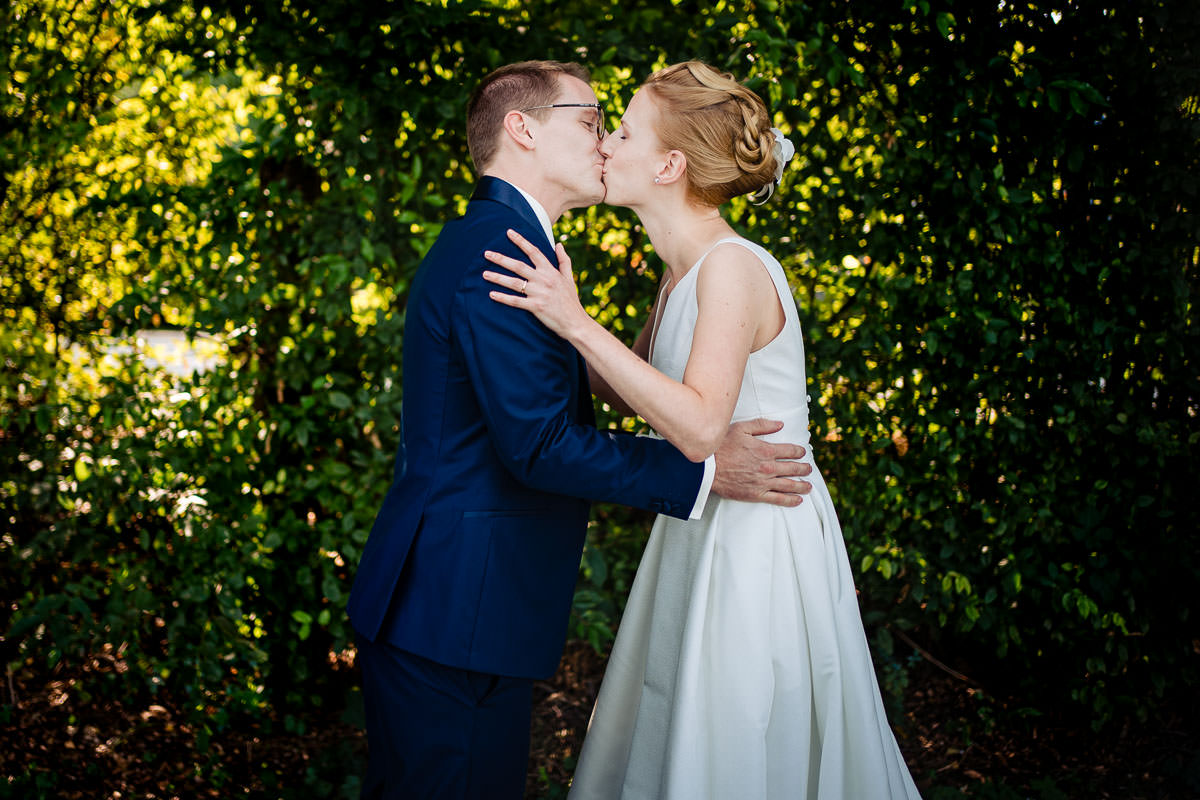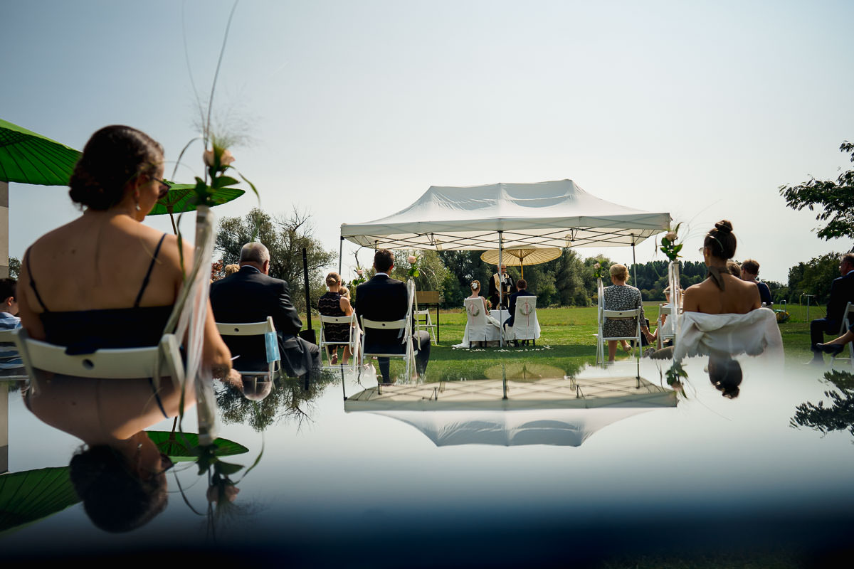 Das Styling der Braut fand beim Friseur statt, wo ich aus Corona-Gründen nicht dabei sein konnte. Nach dem Ankleiden, ging es zum First Look der Beiden an den See. Anschließend fand das Brautpaarshooting statt, das wir nicht nur am See, sondern vor allem auch in Ketsch selbst gemacht haben. So konnten wir ganz unterschiedliche Szenerien einfangen und eine schöne Abwechslung an Bildern zusammen verwirklichen. Im Anschluß ging es wieder zurück ins Hotel. Die Freie Trauung fand im Garten auf der grünen Wiese statt. Besser gesagt war es eigentlich eine kirchliche Trauung, die vom Pfarrer aus Corona-Gründen im Freien gehalten wurde. Dadurch konnten die Gäste mit ausreichend Abstand sitzen.