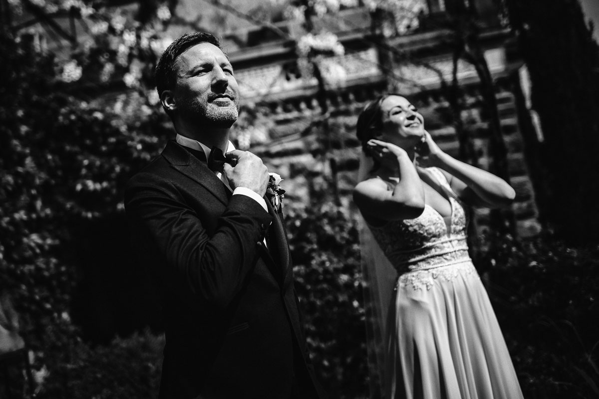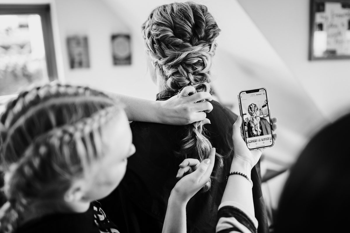 Die Vorbereitungen der Braut fanden im gemütlichen Ambiente des eigenen Zuhauses statt. Mein Tag begann dort mit einem kleinen Einblick in das Styling. Anschließend ging es nach Nordheim, wo das erste Treffen des Brautpaares stattfand. Die Wahl fiel auf das Alte Schlössle am Bahnhof. Umgeben von Weinbergen entlang des alten Neckarlaufs befindet sich dieses charmante Sandsteingebäude, das als Atelier dient und für verschiedene Veranstaltungen genutzt wird. Obwohl es kein richtiges Schloss und auch recht klein ist, bietet es einen malerischen Hintergrund für Hochzeitsfotos.