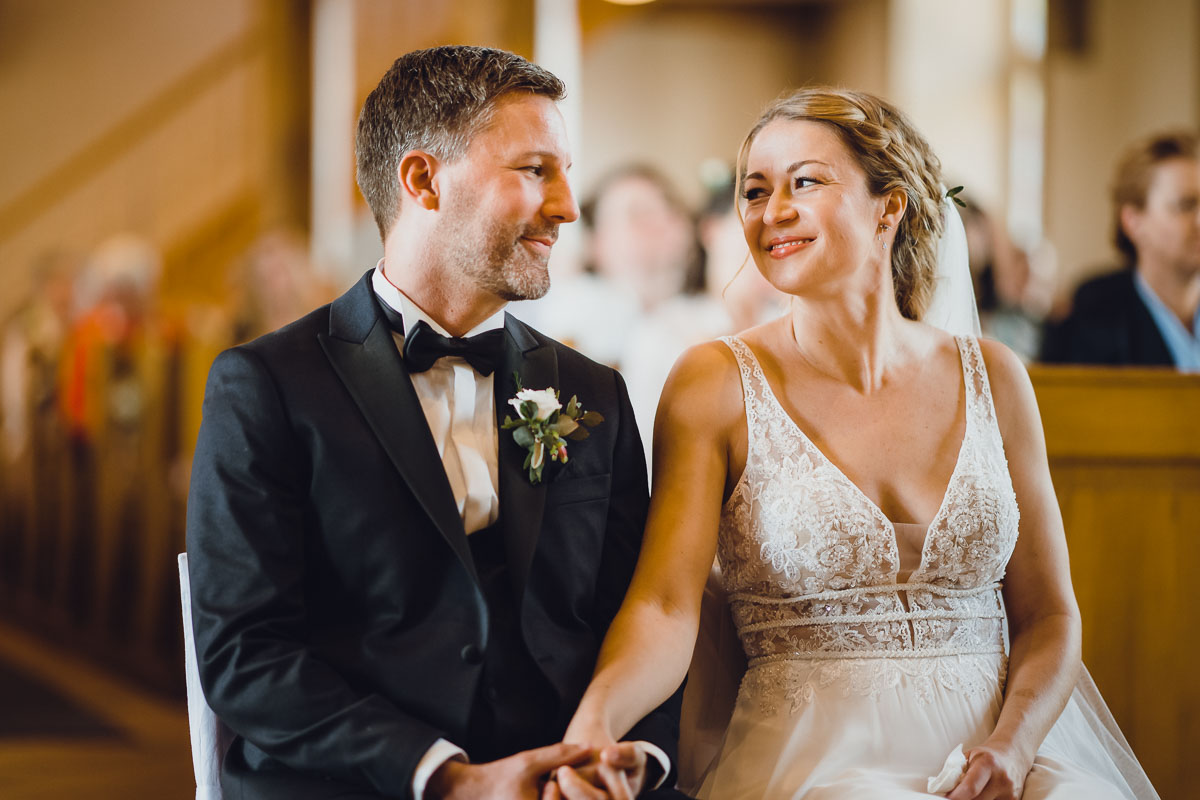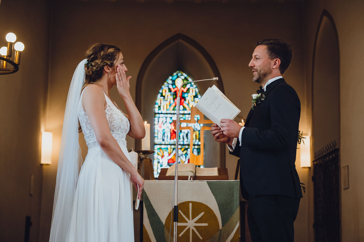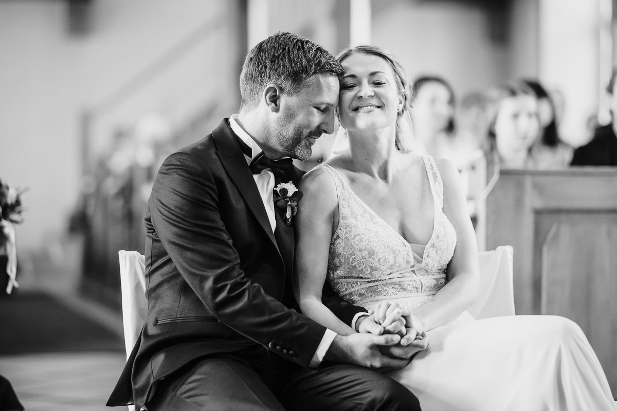 Die kirchliche Trauung fand ebenfalls in Nordheim statt, sodass der Weg nach dem Shooting des Brautpaares nicht weit war. In einer hellen Kirche versammelten sich zahlreiche Gäste, um die emotionale Zeremonie mit den bewegenden Eheversprechen zu erleben. Ein wunderbarer Auftakt für die bevorstehende Hochzeitsfeier im Landgut Steng.