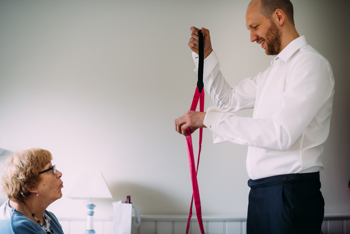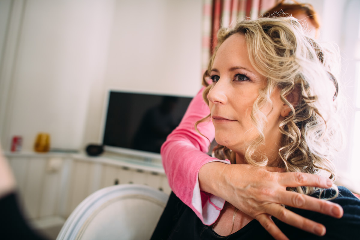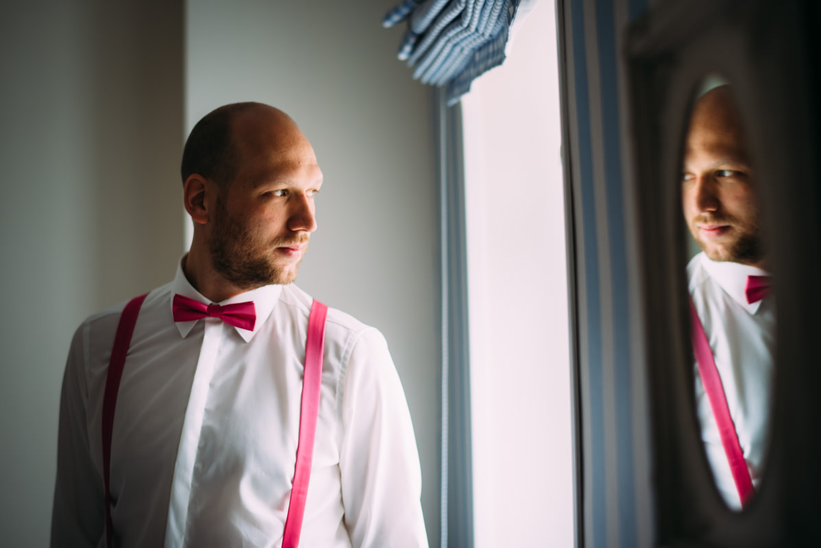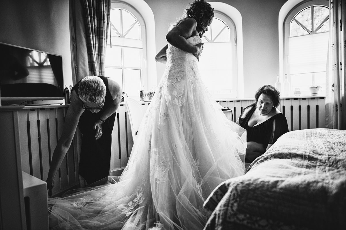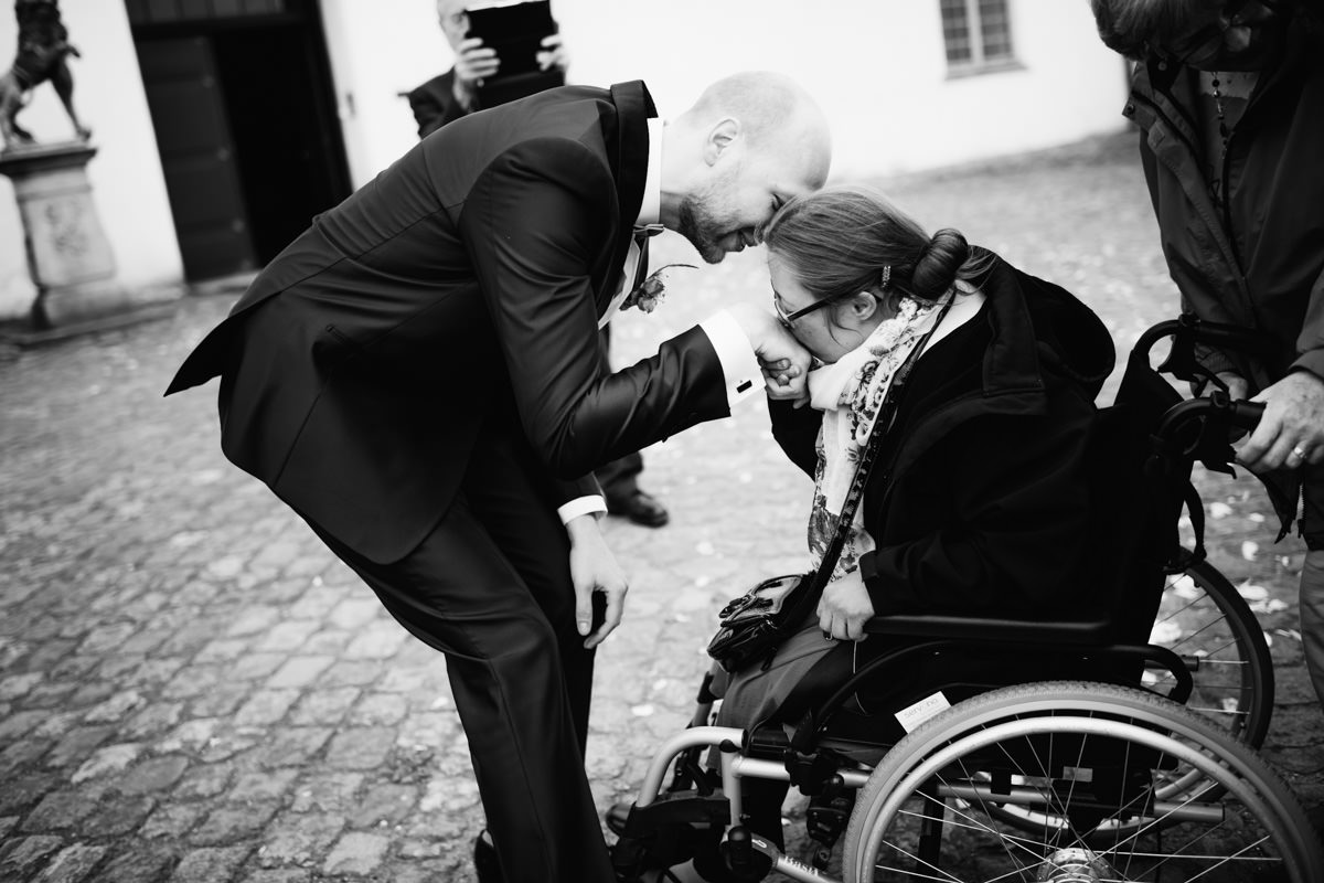 Das getting ready fand im Strandhotel Glücksburg statt. Es hatte mittlerweile aufgehört zu regnen. Die Braut, die mich im Rollstuhl erwartet hat, war extrem gut drauf. Das Bein war getapt und die Schmerzmittel machten das übrige, damit die Stimmung gut war. Von einem gebrochenen Knöchel habe ich im Laufe des Tages nicht wirklich was gemerkt.