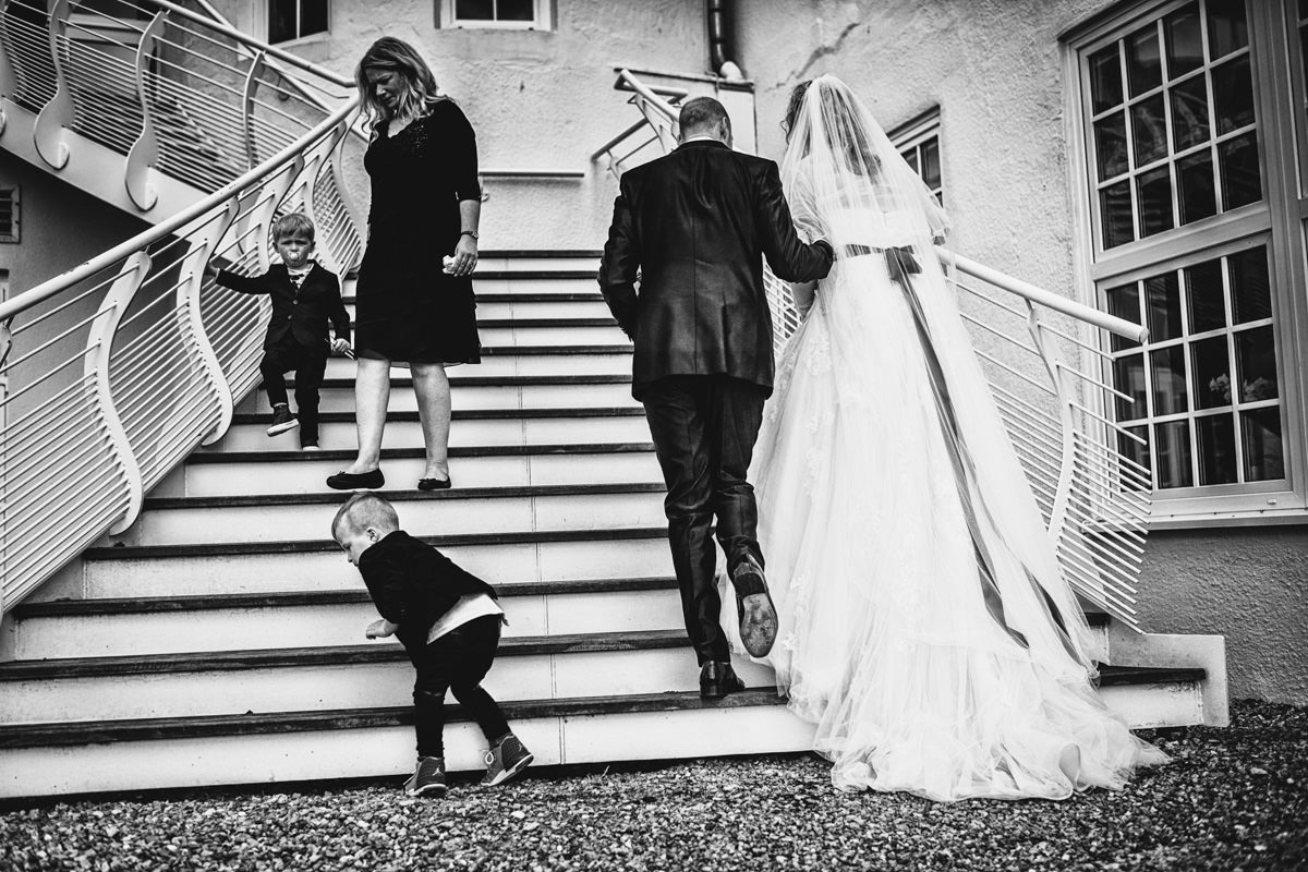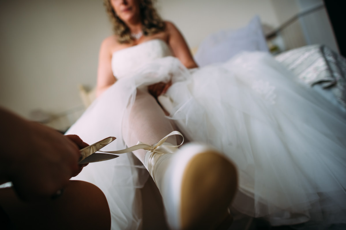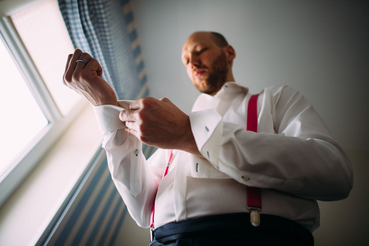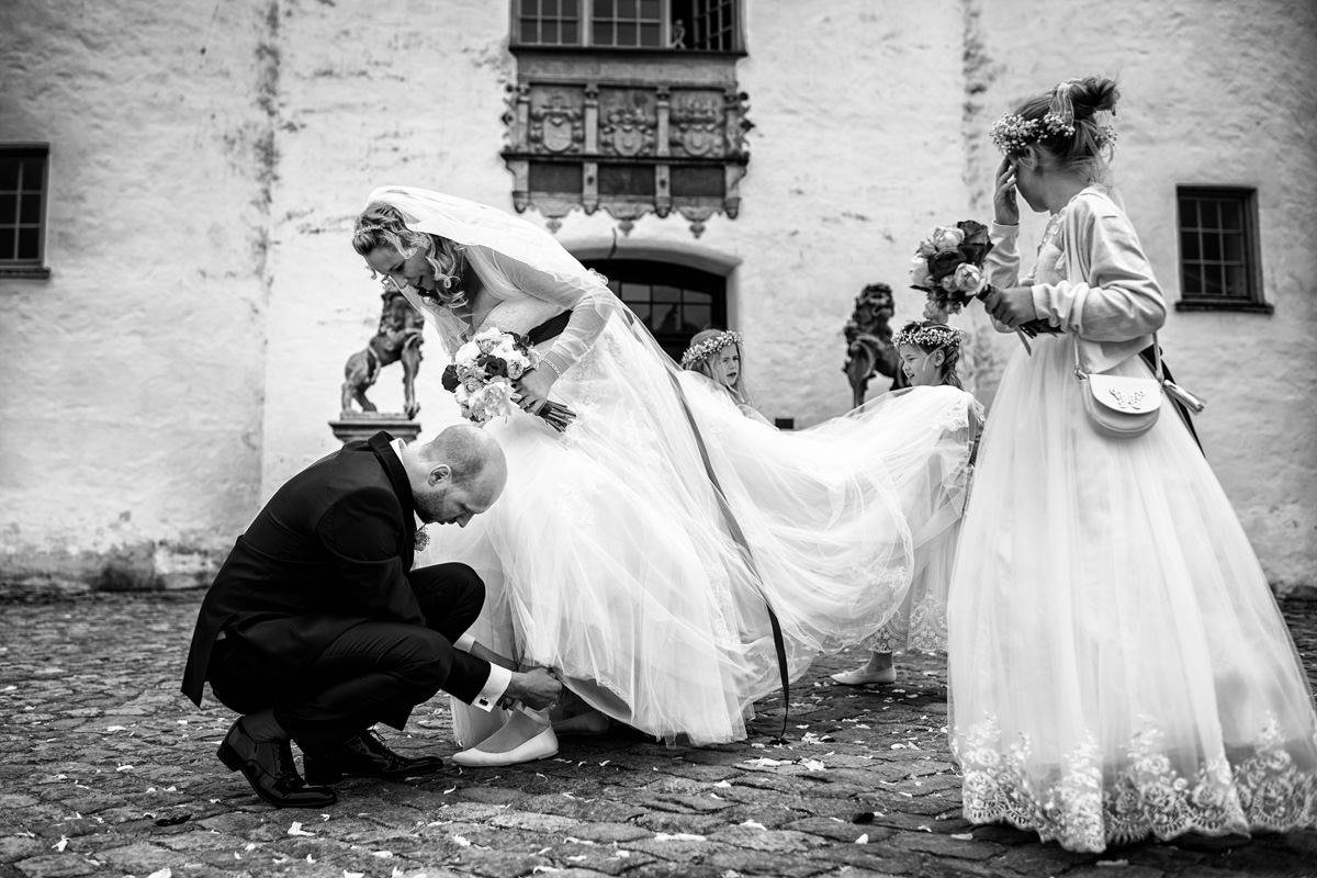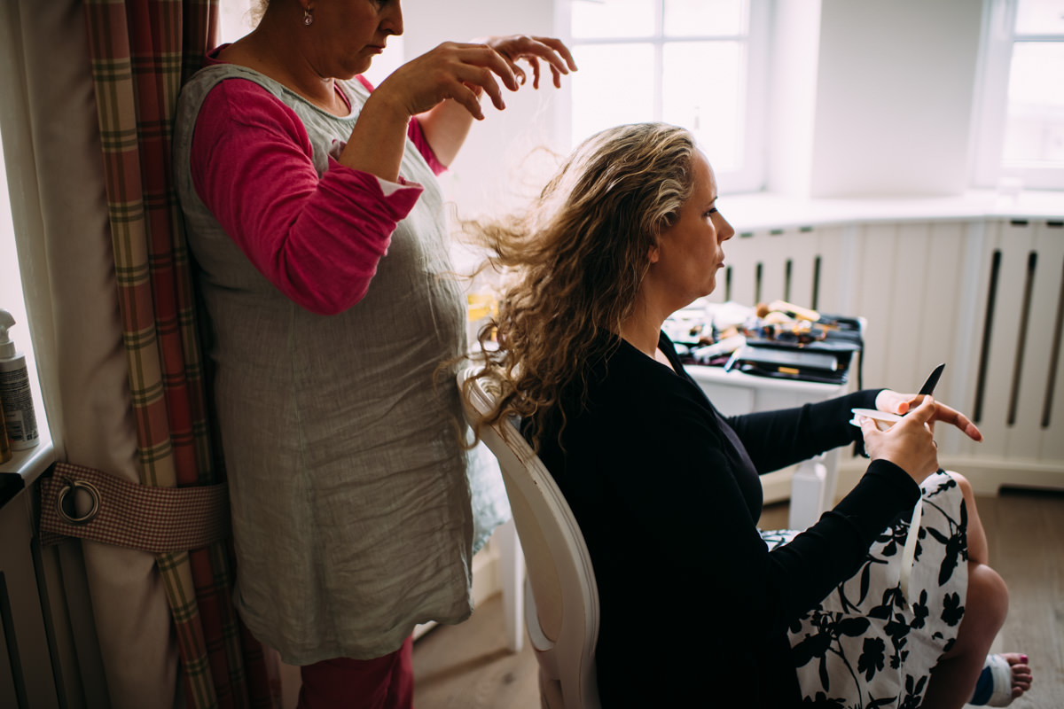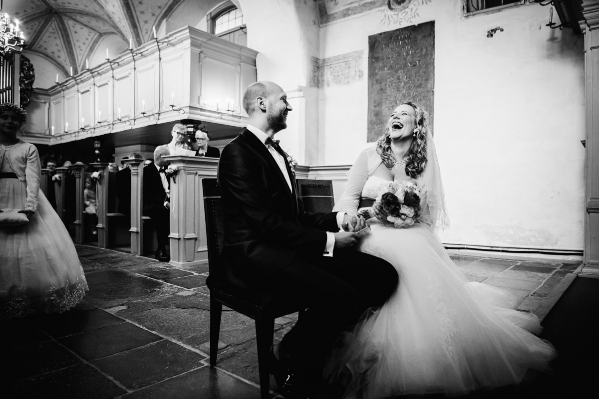 Das getting ready fand im Strandhotel Glücksburg statt. Es hatte mittlerweile aufgehört zu regnen. Die Braut, die mich im Rollstuhl erwartet hat, war extrem gut drauf. Das Bein war getapt und die Schmerzmittel machten das übrige, damit die Stimmung gut war. Von einem gebrochenen Knöchel habe ich im Laufe des Tages nicht wirklich was gemerkt.