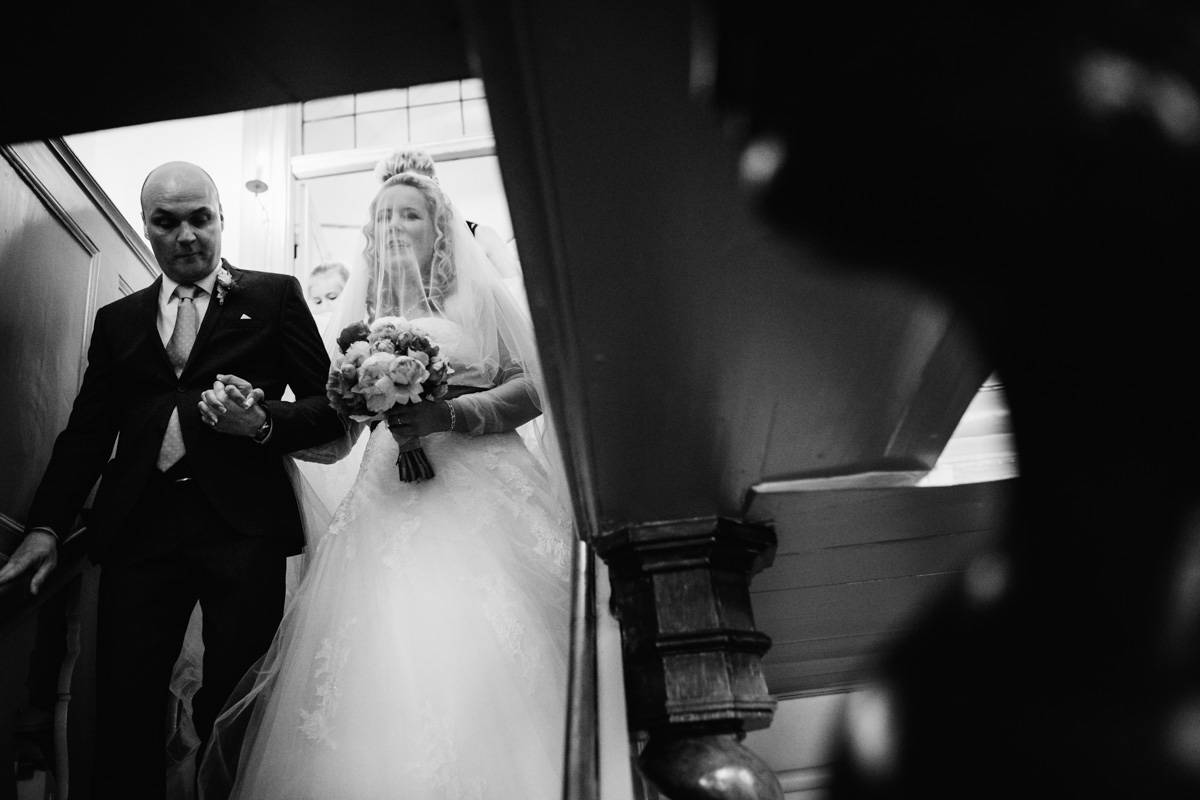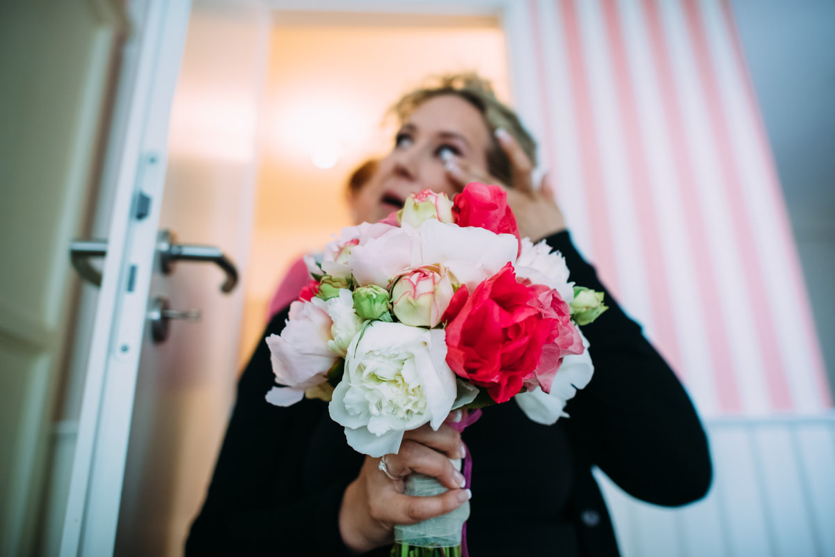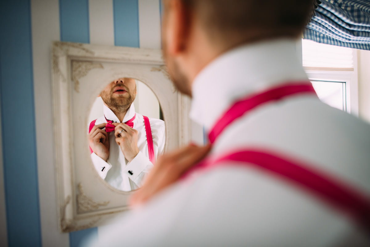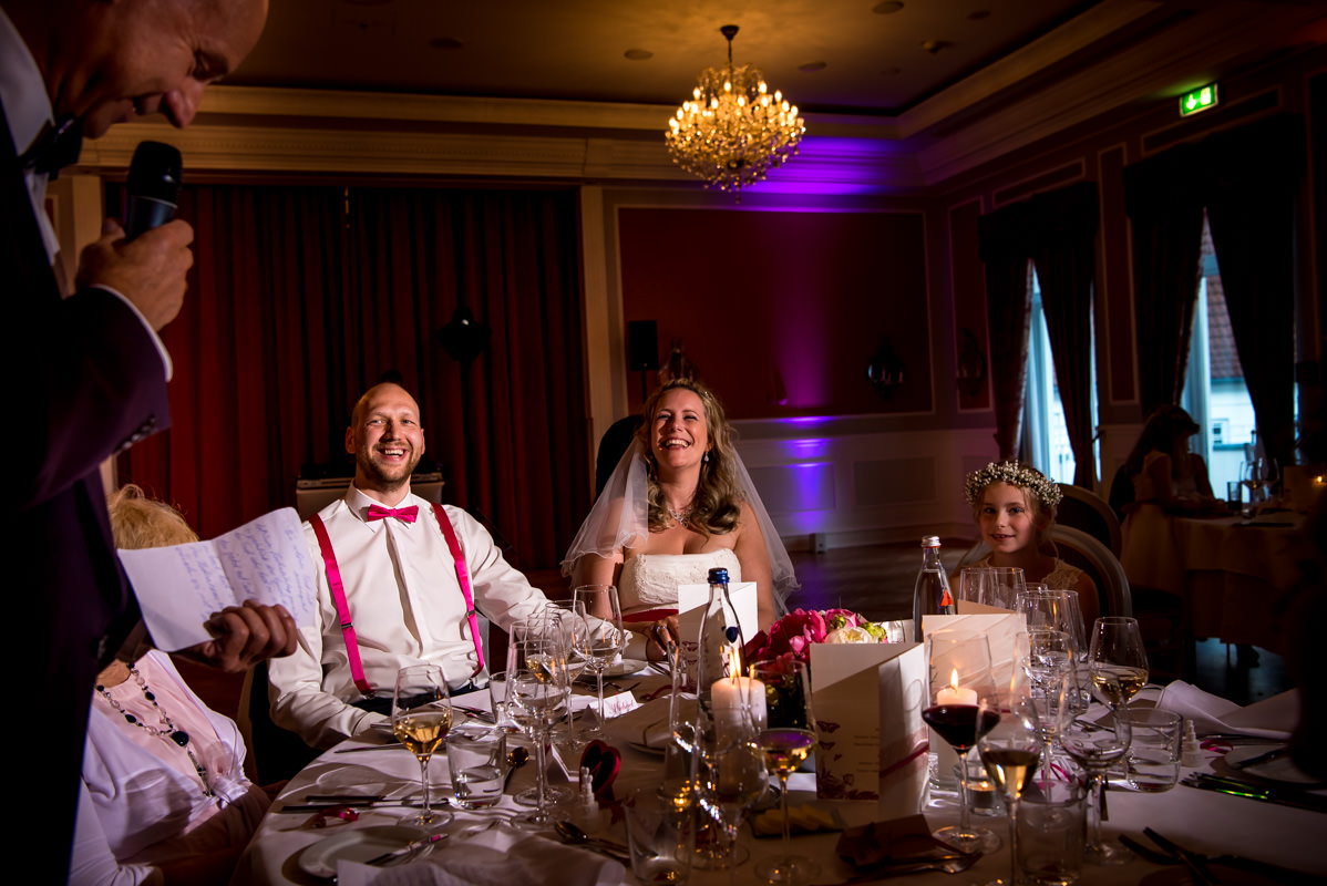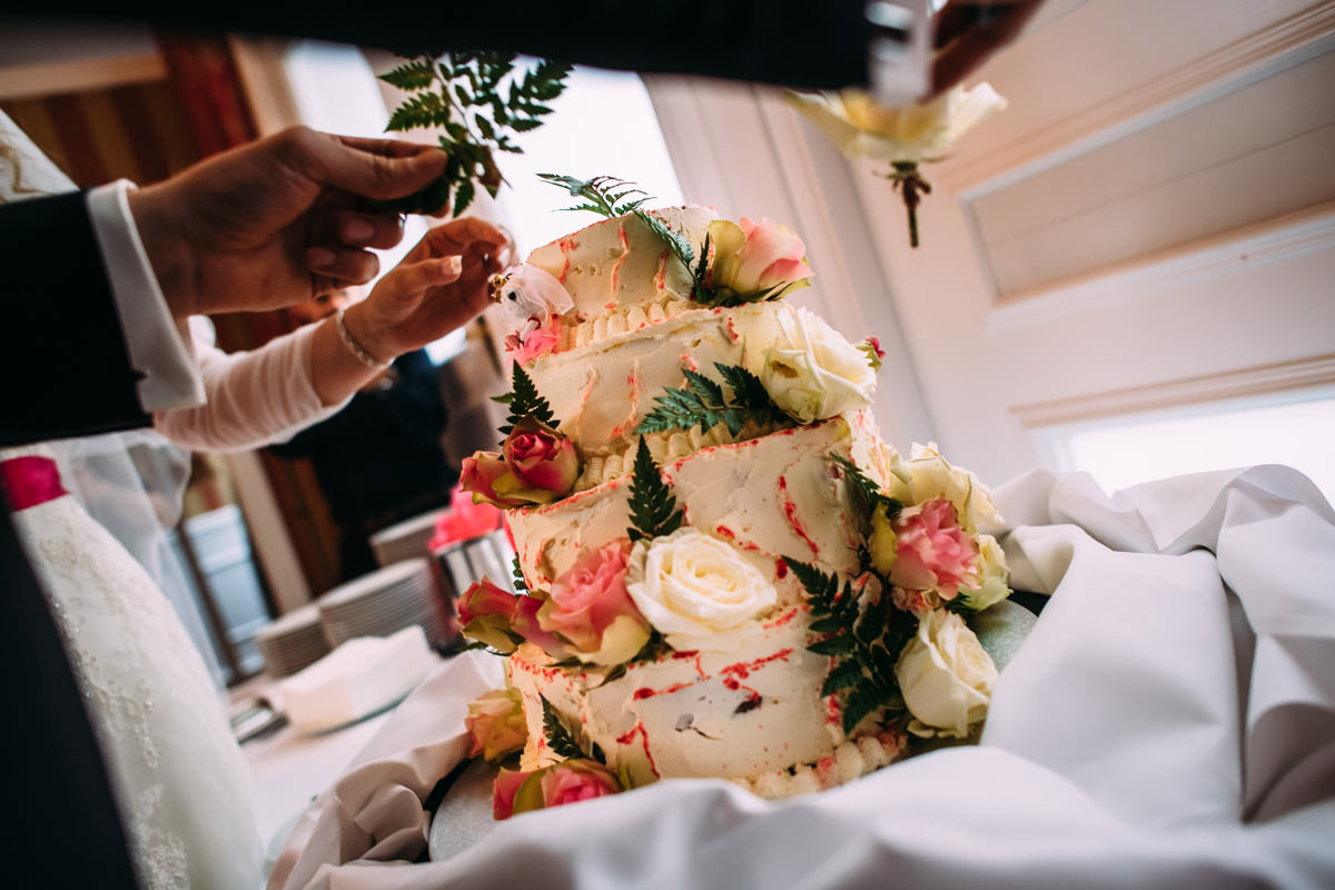 Das getting ready fand im Strandhotel Glücksburg statt. Es hatte mittlerweile aufgehört zu regnen. Die Braut, die mich im Rollstuhl erwartet hat, war extrem gut drauf. Das Bein war getapt und die Schmerzmittel machten das übrige, damit die Stimmung gut war. Von einem gebrochenen Knöchel habe ich im Laufe des Tages nicht wirklich was gemerkt.