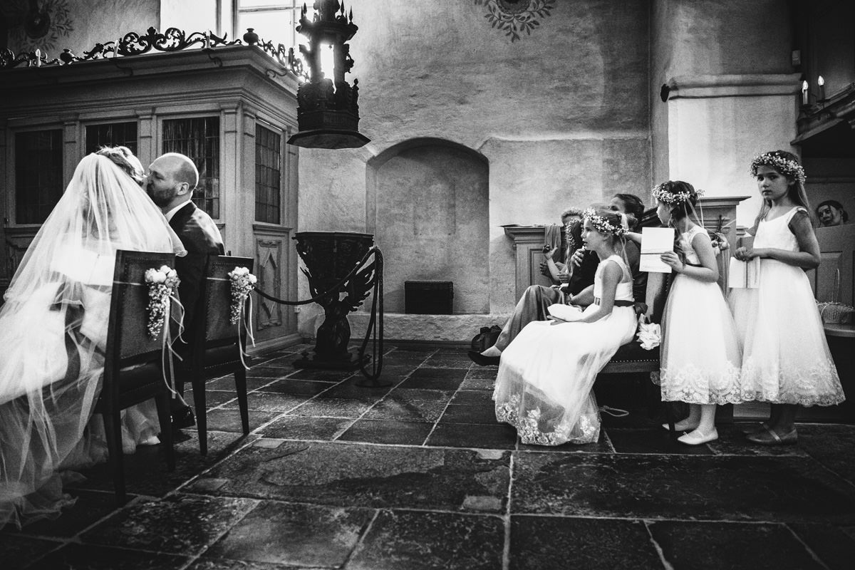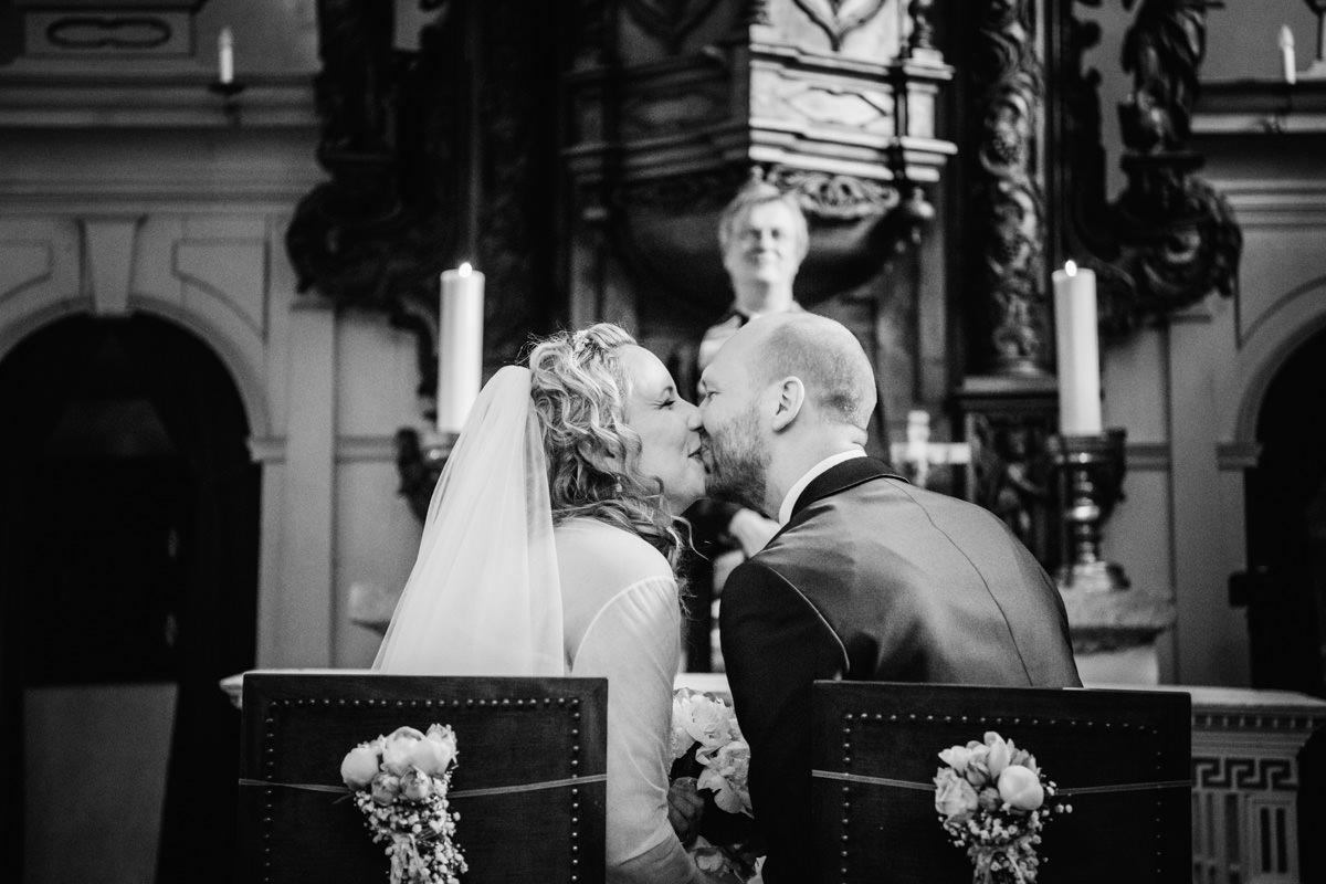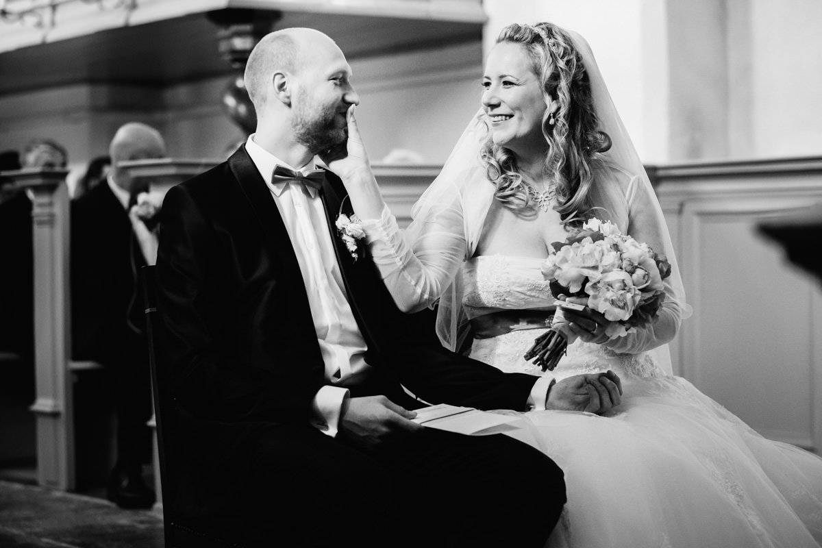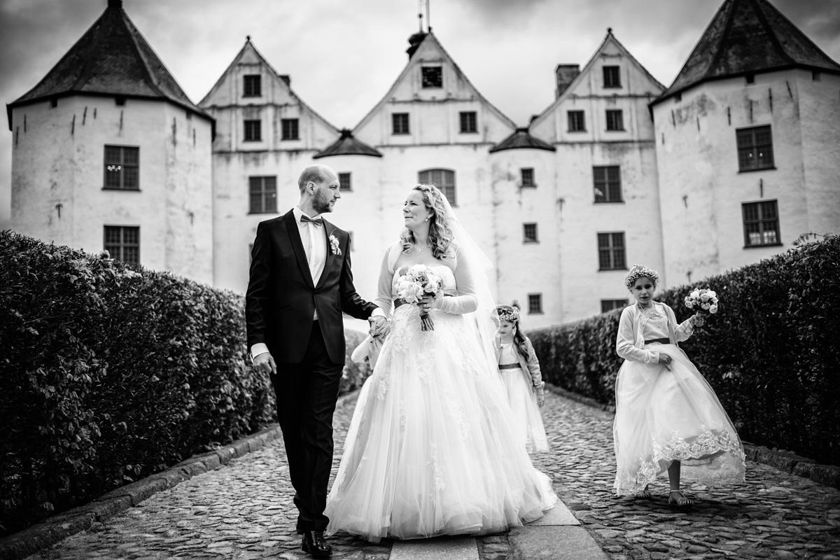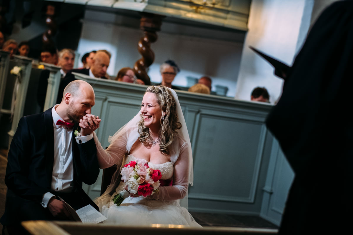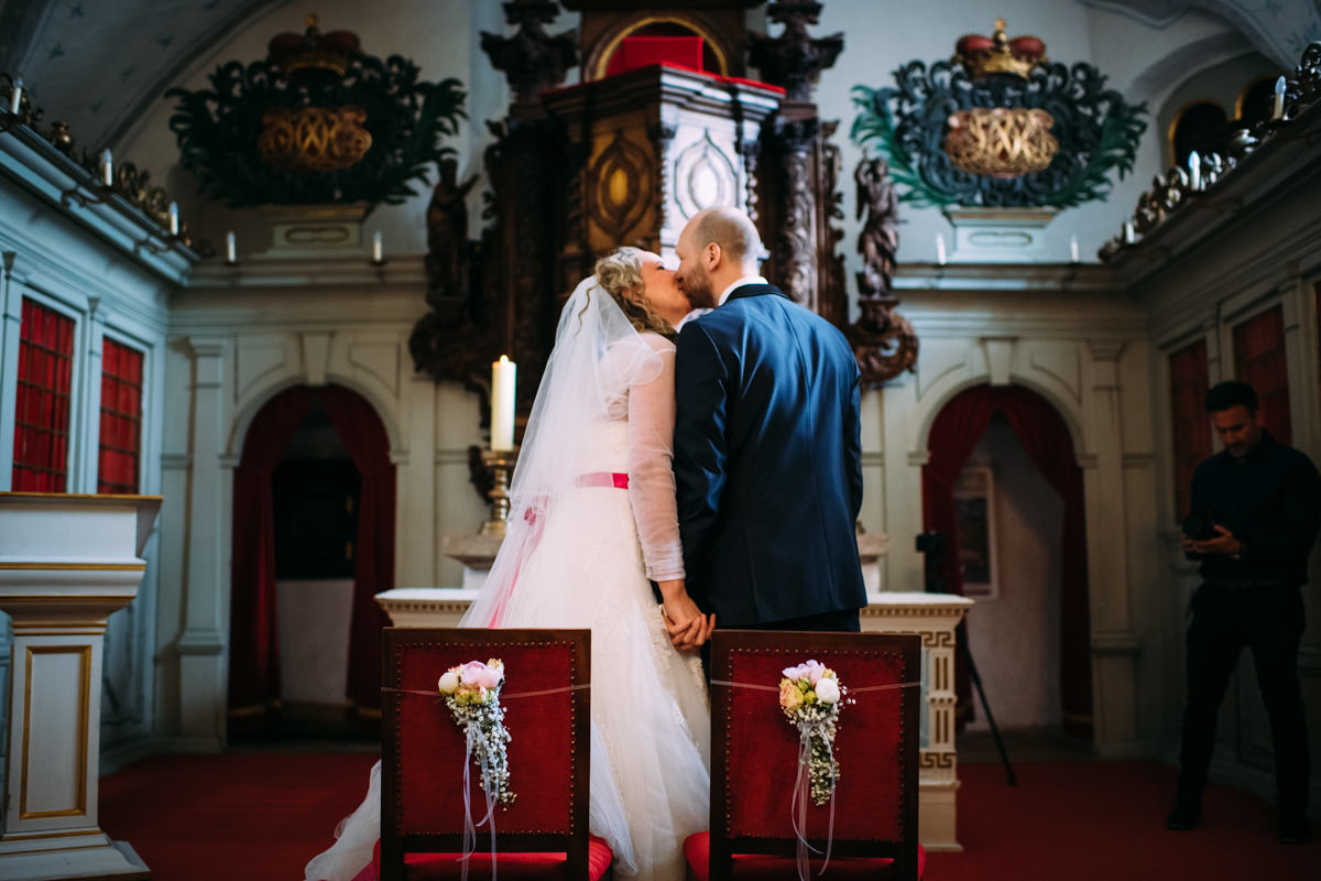 die Trauung fand im Schloss Glücksburg statt, dem Wasserschloss, das Wahrzeichen von Glücksburg. Mit der Kutsche ging es vom Strandhotel zum Wasserschloss. Dort wurden die beiden dann kirchlich ein Paar. Nach den Gratulationen ging es mit der Kutsche wieder zurück zum Strandhotel.