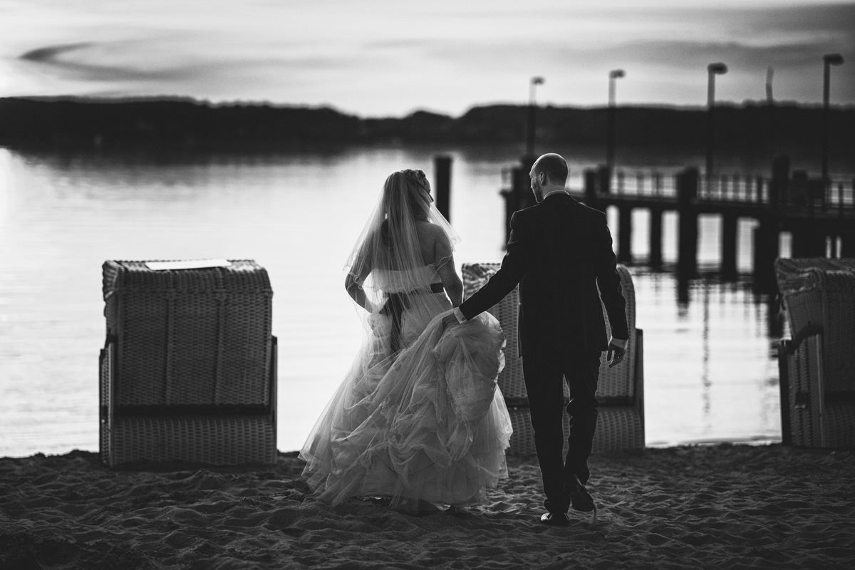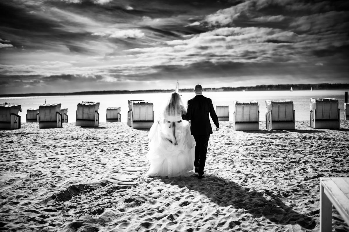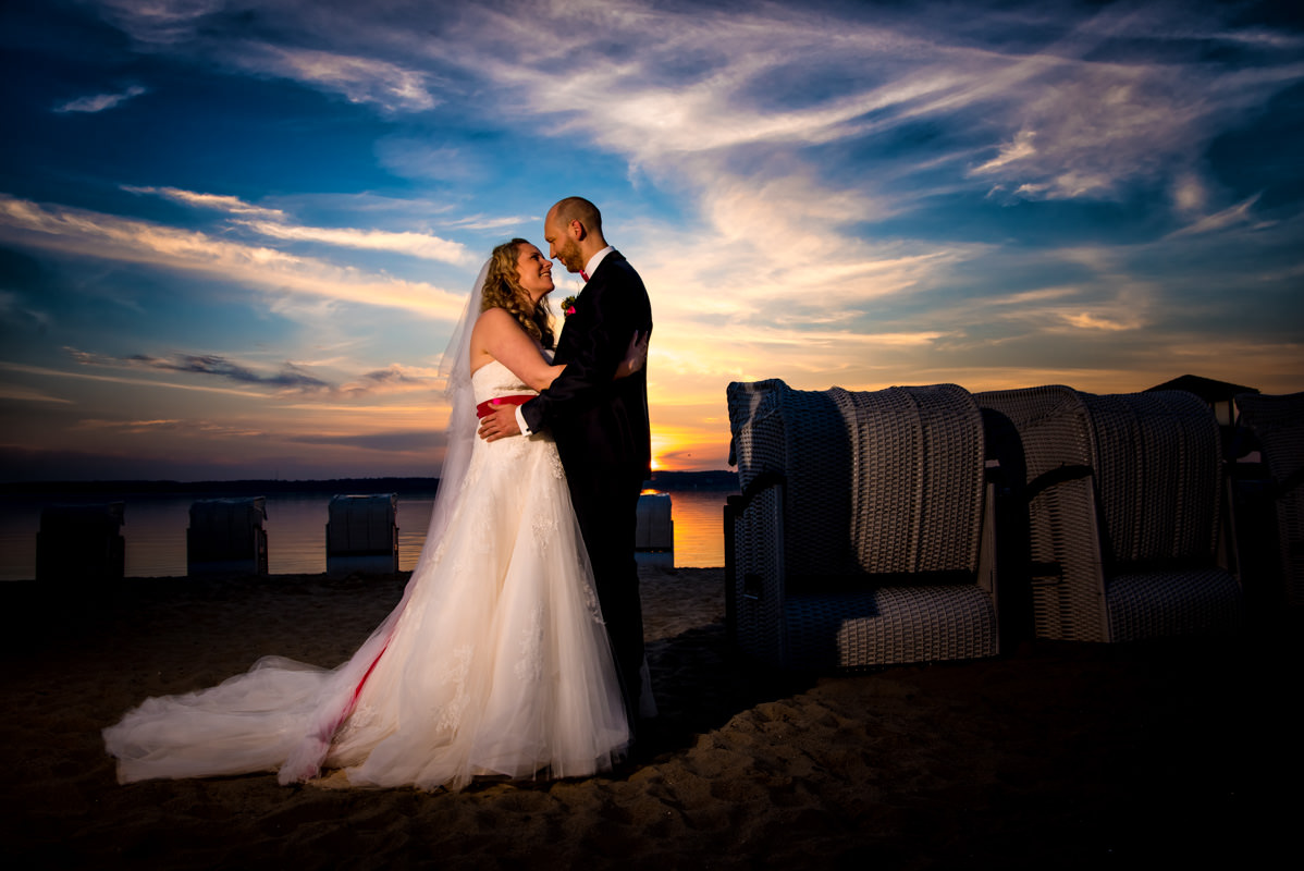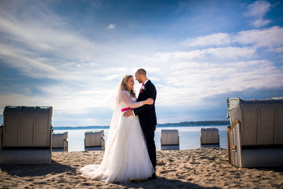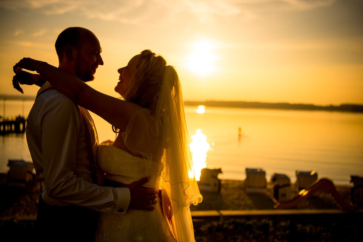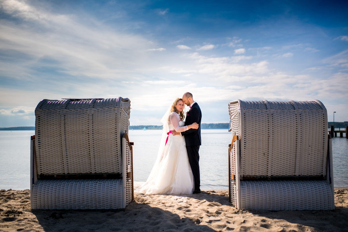 Der anschliessende Sektempfang fand im sehr schönen Strandhotel Glücksburg statt. Dort wurde im Foyer der Sekt gerichtet. Als plötzlich dann doch die Sonne rauskam, hat man sofort umdisponiert und den Sektempfang nach draussen verlegt. Zum rechten Zeitpunkt kam dann auch das Brautpaar von ihrer Kutschfahrt zurück und konnte bei Sonnenschein, den Sekt geniessen. Klar, dass wird dann auch die Zeit für ein paar Portraits am Strand genutzt haben. Die Feier fand im sehr schönen Elisabeth Saal des Strandhotels statt, natürlich mit lecker Essen, ein paar Reden und Tanz.