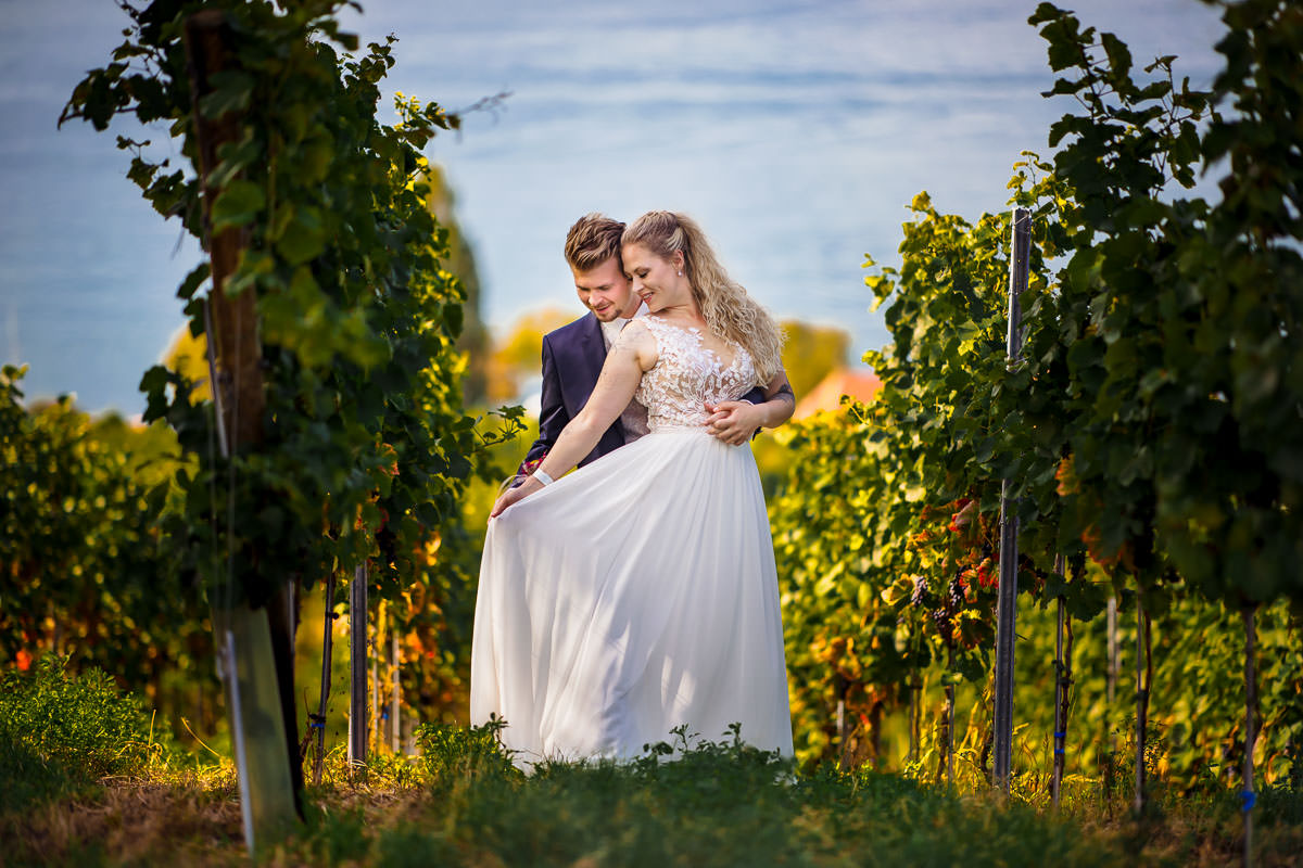 Anfang September bei bestem sonnigem Wetter fand die Hochzeit auf der Veitsburg statt. Eine Hochzeitsreportage, die ich von morgens bis zum Beginn des Abendessens begleitet habe. Der Plan war, dass wir uns bereits am Vormittag für die Hochzeitsporträts getroffen haben. Dafür hat sich das Brautpaar den Höhenweg in Meersburg ausgesucht. Und das war eine klasse Idee. Obwohl die Tageszeit für Porträtfotos nicht unbedingt die ideale Zeit ist, konnten wir viele grandiose Hochzeitsbilder machen. Und dabei vorallem auch das wundervolle Panorama auf den Bodensee genießen. Gerade für mich, der erst an diesem Morgen angereist ist, war das einfach nur wunderschön. Denn mein Herz blüht echt auf, wenn ich so einen Blick genießen kann. Da kann man der Kreativität freien Lauf lassen. Wir hatten zusammen unheimlich viel Spass bei den Aufnahmen.