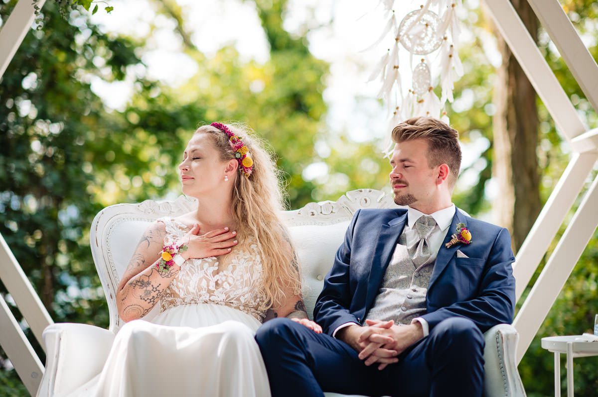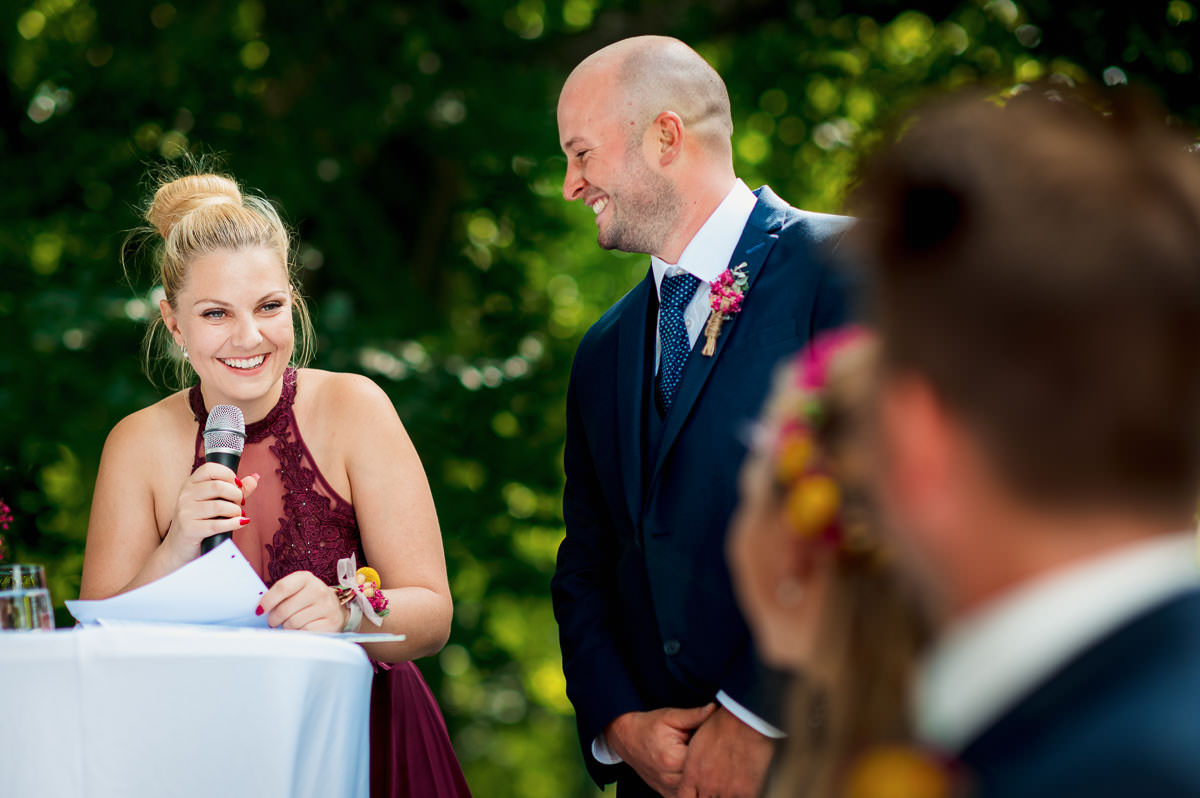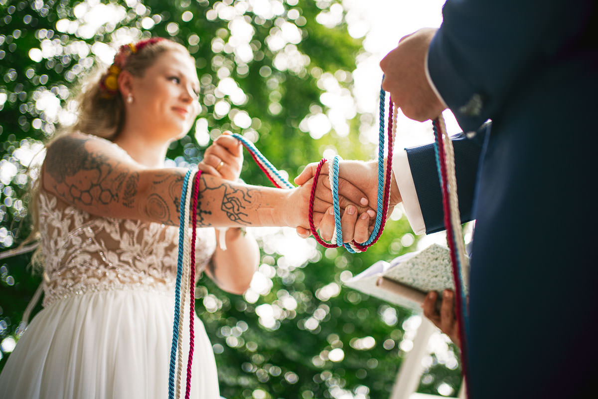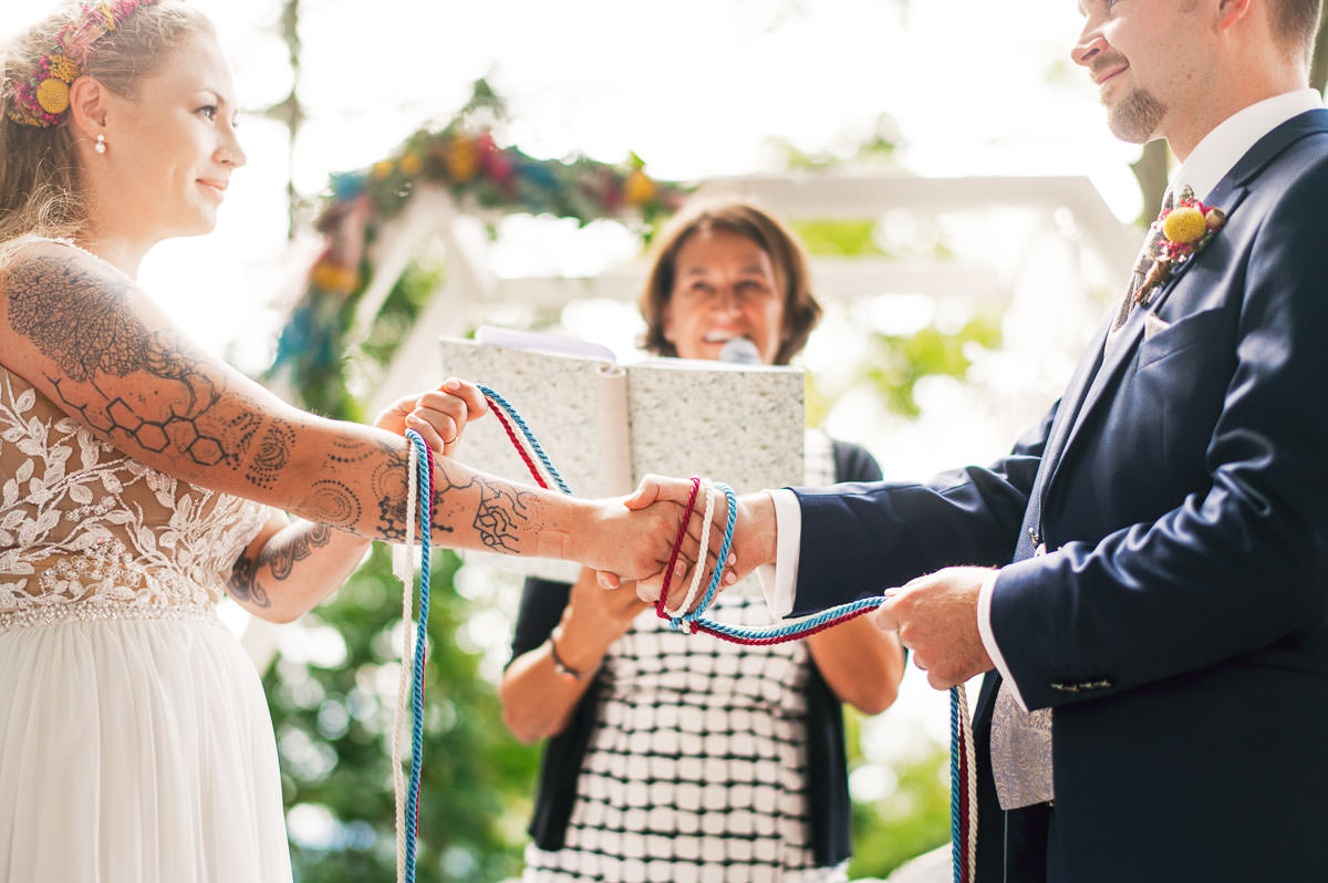 Nach den Porträtfotos in Meersburg ging es direkt für die freie Trauung auf die Veitsburg. Dort haben in der Zwischenzeit die Freunde und Trauzeugen mit vielen kleinen Details für ein tolles Ambiente im Garten gesorgt. Natürlich wurde das Brautpaar voller Neugier von der Familie und ihren beiden Kindern erwartet. Die freie Trauung wurde von der wunderbaren Annette Kessler geleitet. Der Höhepunkt war hier ein Handfasting während des bewegenden Trauversprechens. Eine wirklich wundervolle und ergreifende Trauzeremonie auf der Veitsburg. Danach durfte aber erstmal ausgiebig gratuliert werden. Der Sektempfang fand wie die Trauung im Garten statt. Dort durften die Gäste die Zeit mit dem Brautpaar bei bestem sonnigem Wetter und angenehmen Temperaturen geniessen.
