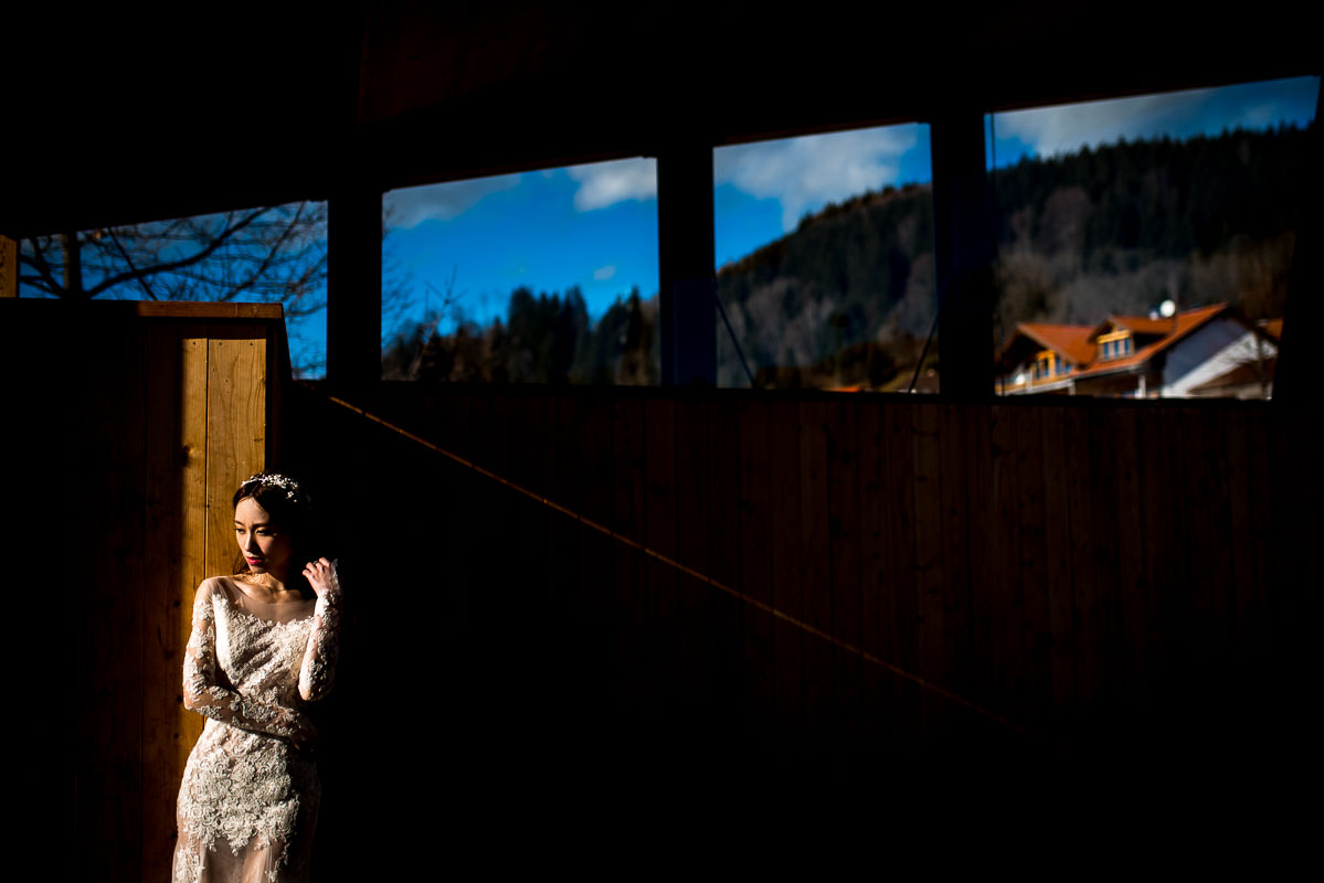 Mein Brautpaar kommt aus China und hat sich den Traum einer Europareise verwirklicht. Dabei durfte natürlich ein Besuch des Allgäus und der Königsschlösser nicht fehlen. Aber die Beiden haben sich noch ganz was besonderes ausgesucht. Denn es waren ihre Flitterwochen. Und die Zwei haben ihre Hochzeitskleidung eingepackt. Um wunderschöne Hochzeitsfotos im Allgäu machen zu lassen. Dabei haben Sie mich als Hochzeitsfotograf Allgäu ausgesucht. Ein Internetsuche hat die Beiden auf meine Homepage gebracht, und sie haben sich in meine Bilder verliebt. Was ein Riesenkompliment für mich ist. Wenn jemand von so weit weg mich für solch persönliche Hochzeitsfotos aussucht. Termine wurden ausgemacht, und die Reise nach Europa konnte kommen. Die Jahreszeit war etwas ungewöhnlich denn es war Februar, also quasi eine Winterhochzeit. Also nicht unbedingt die beste Jahreszeit für schönes Wetter. Aber wir hatten verdammt viel Glück, an dem besagten Tag schien großteils die Sonne. Es war zwar knackig kalt, aber wen stört das schon. Wenn man sich zu zweit wunderbar aneinander kuscheln kann. Im Laufe des späteren Tages sollte noch Regen kommen, aber der blieb zum Glück aus.
