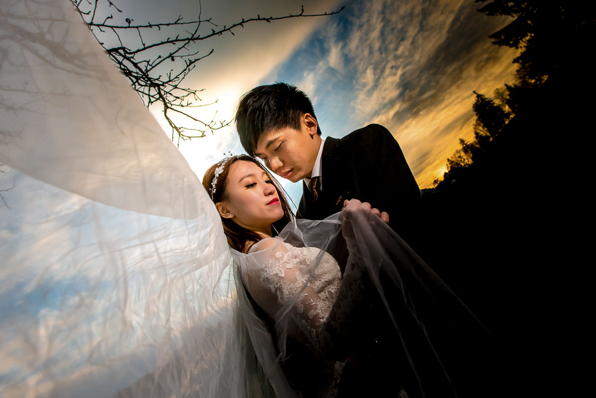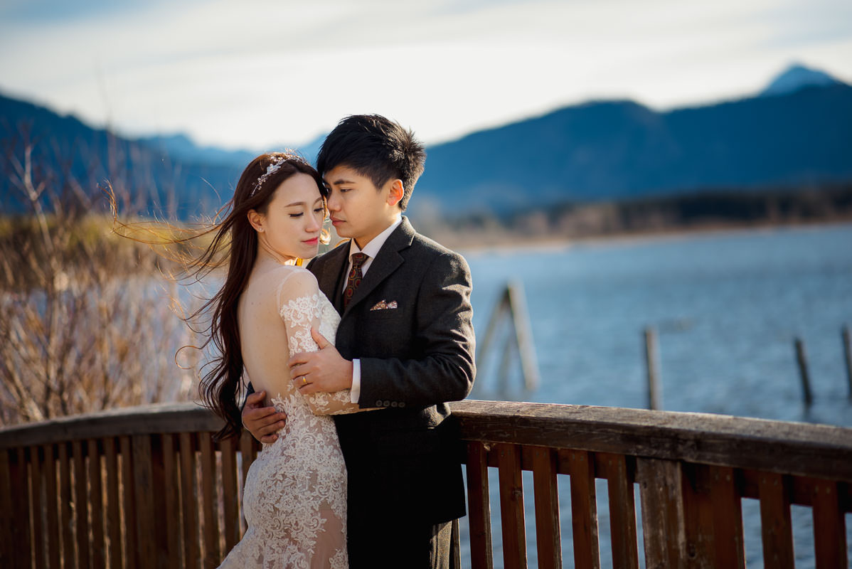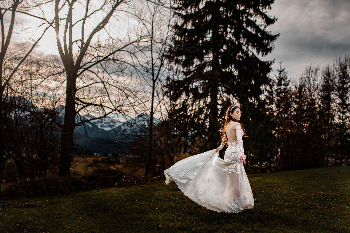 Unser Hochzeitsshooting war für den halben Tag ausgelegt, da die Zwei sowohl Bilder tagsüber von der Gegend, als auch bei Sonnenuntergang haben wollten. Gestartet haben wir unser Shooting in der Nähe des Hotels, in dem das Brautpaar übernachtet hat. Das Hotel Geiger liegt direkt neben dem Hopfensee, so dass wir direkt unser Shooting dort starten konnten. Und es war ganz schön windig. Und ich liebe es. Da die Braut offene lange Haare hatte, hat der Wind ihre Haare sehr schön in Szene gesetzt. Chinesische Bräute sind unglaublich toll zu fotografieren, da sie eine ganz natürliche Eleganz ausstrahlen. Das Brautkleid hat ihre Eleganz umso mehr unterstrichen.