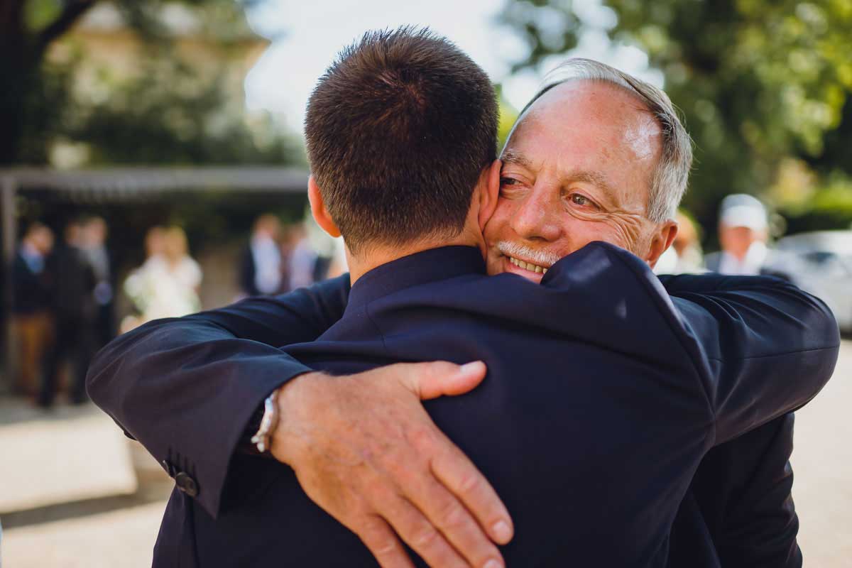 Nach der Trauung ging es zurück in den Innenhof des Schlosses, wo die Gäste bereits zum Sektempfang zusammenkamen. Bei strahlender Stimmung, persönlichen Glückwünschen und einem lockeren Miteinander entstanden lebendige und emotionale Reportagebilder.