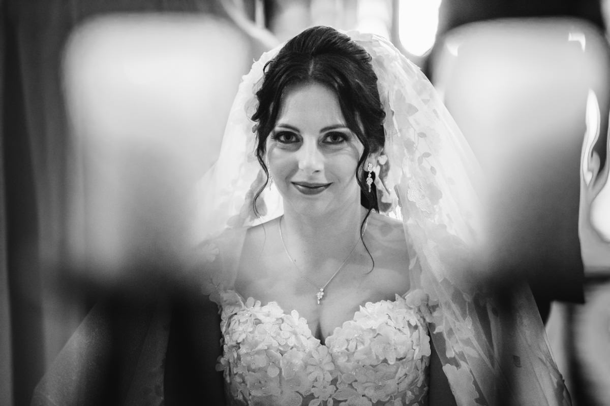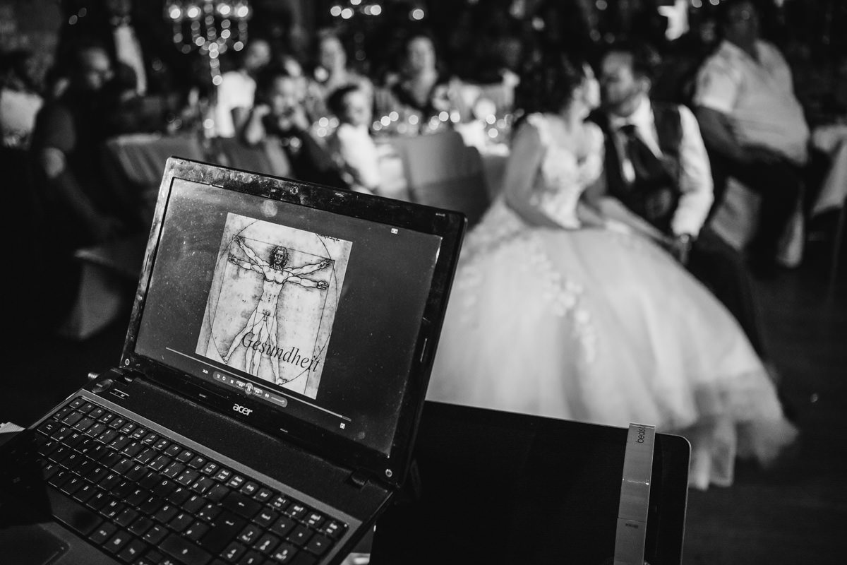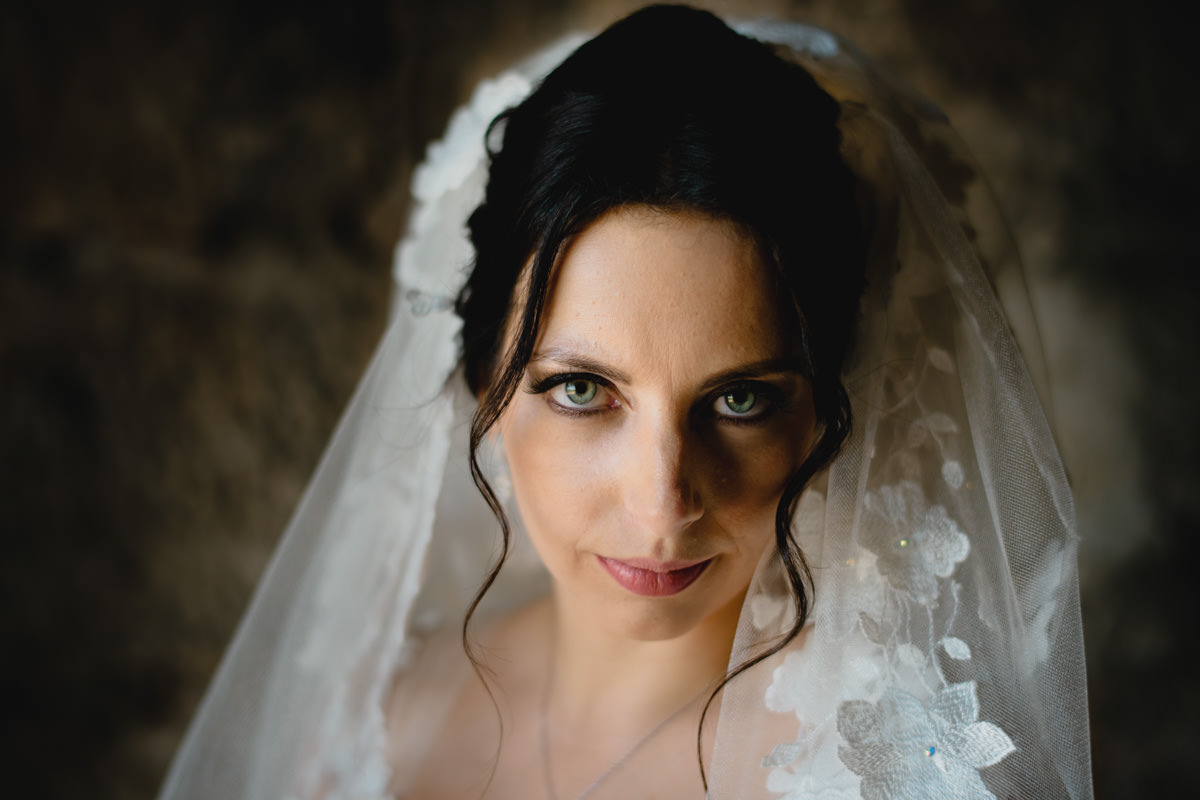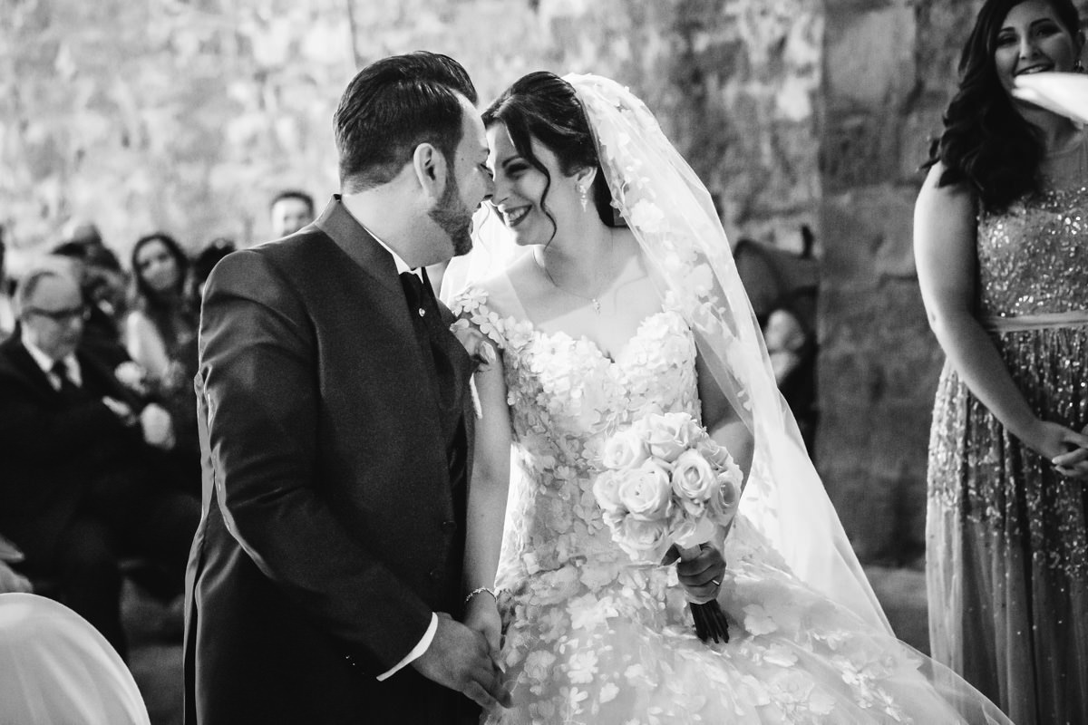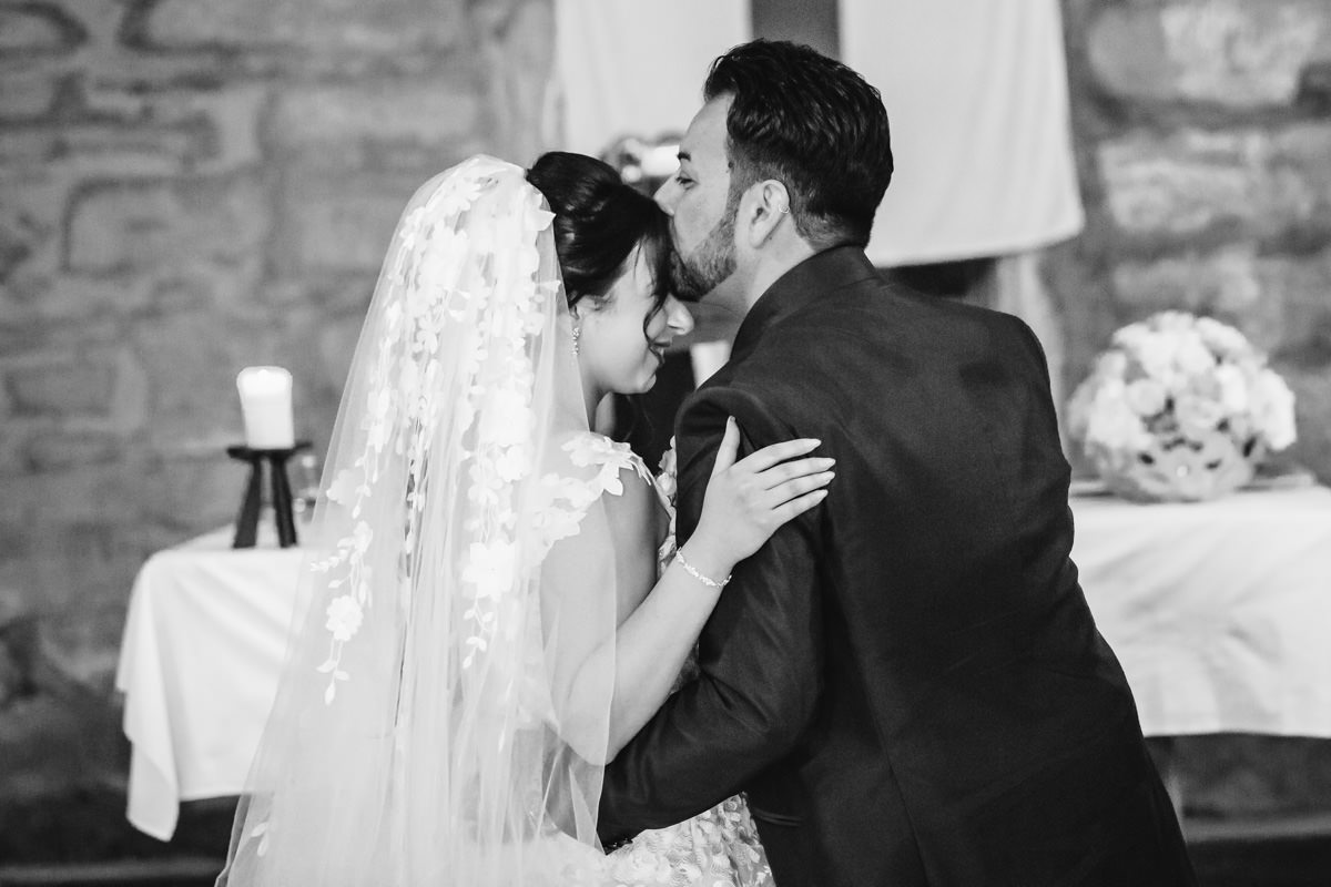 Von Pforzheim ging es dann nach Sulzfeld in die Hochzeitslocation Burg Ravensburg. Hier wurde die Braut schon sehnlichst erwartet, da wir ein wenig zu spät dran waren. In der Traukapelle, ein grosser Saal im Gewölbekeller der Burg, wurde die feierliche italienische Trauung zelebriert. Der Gewölbekeller ist fototechnisch nicht einfach, da der Raum sehr dunkel ist und nur spärlich beleuchtet, und von hinten durch den Eingang die Sonne stark reinstahlt, aber halt leider dort, wo man das Licht nicht braucht. Aber als Hochzeitsfotograf hat man eben nicht den ganzen Tag die ideale Bedingungen zum fotografieren.