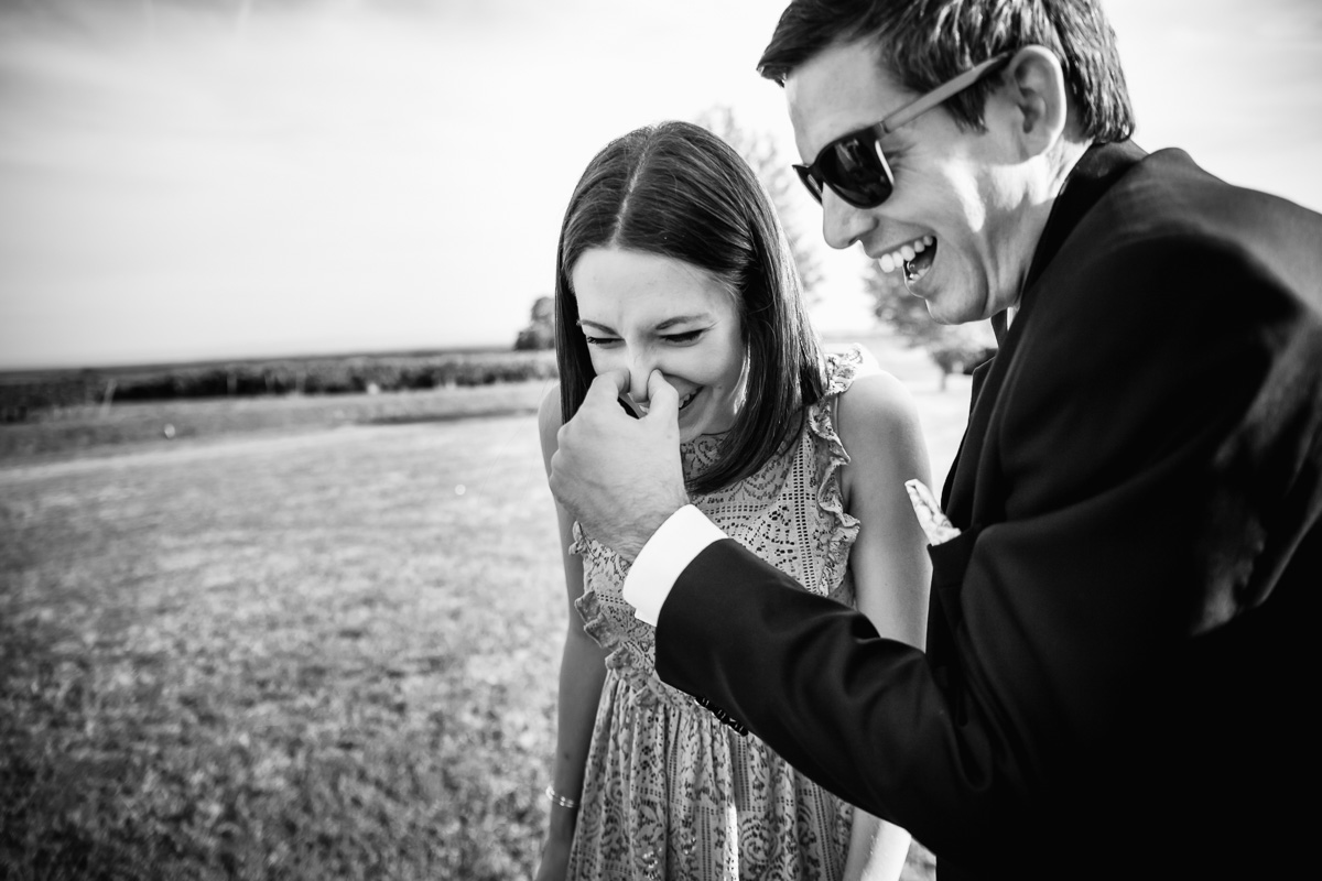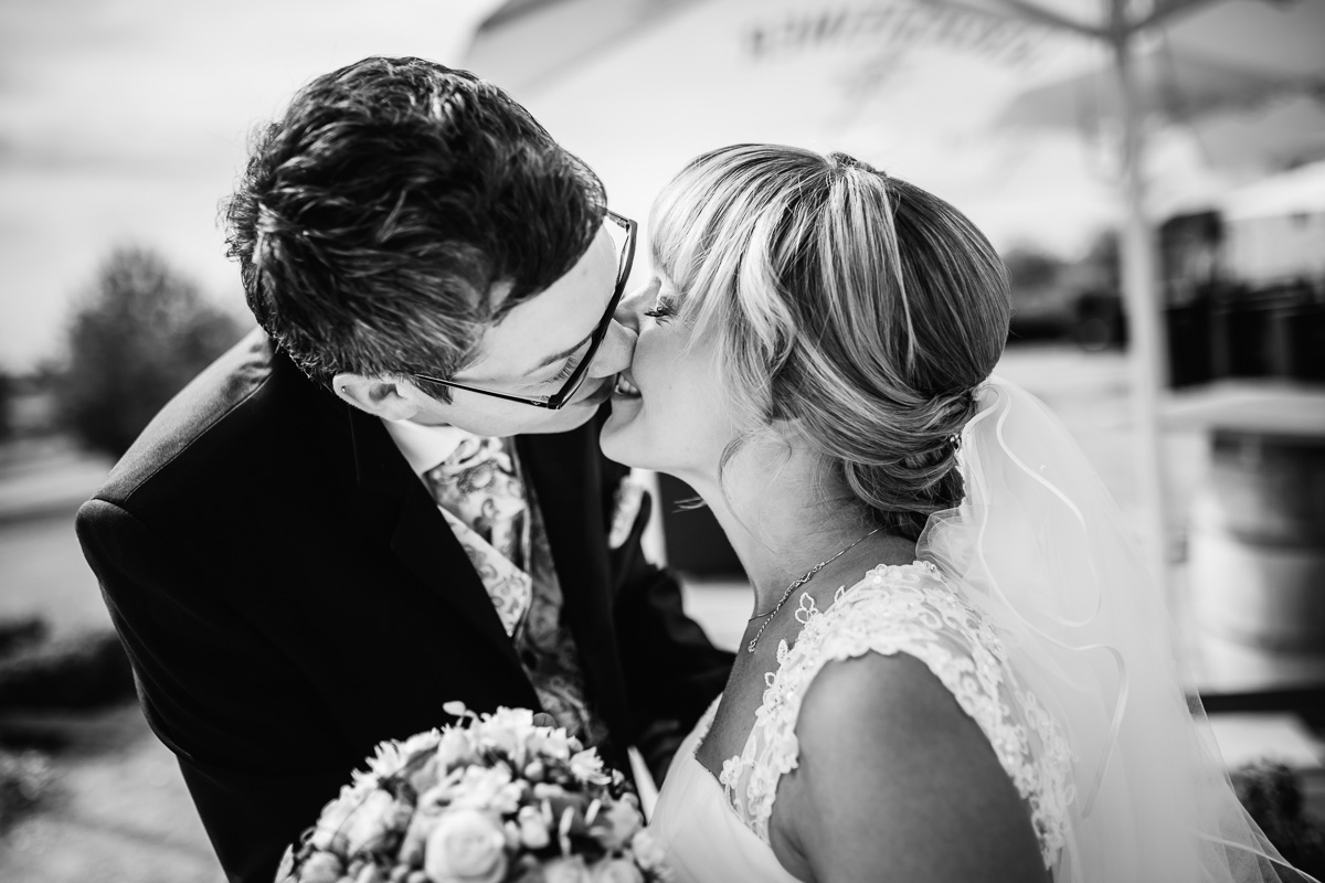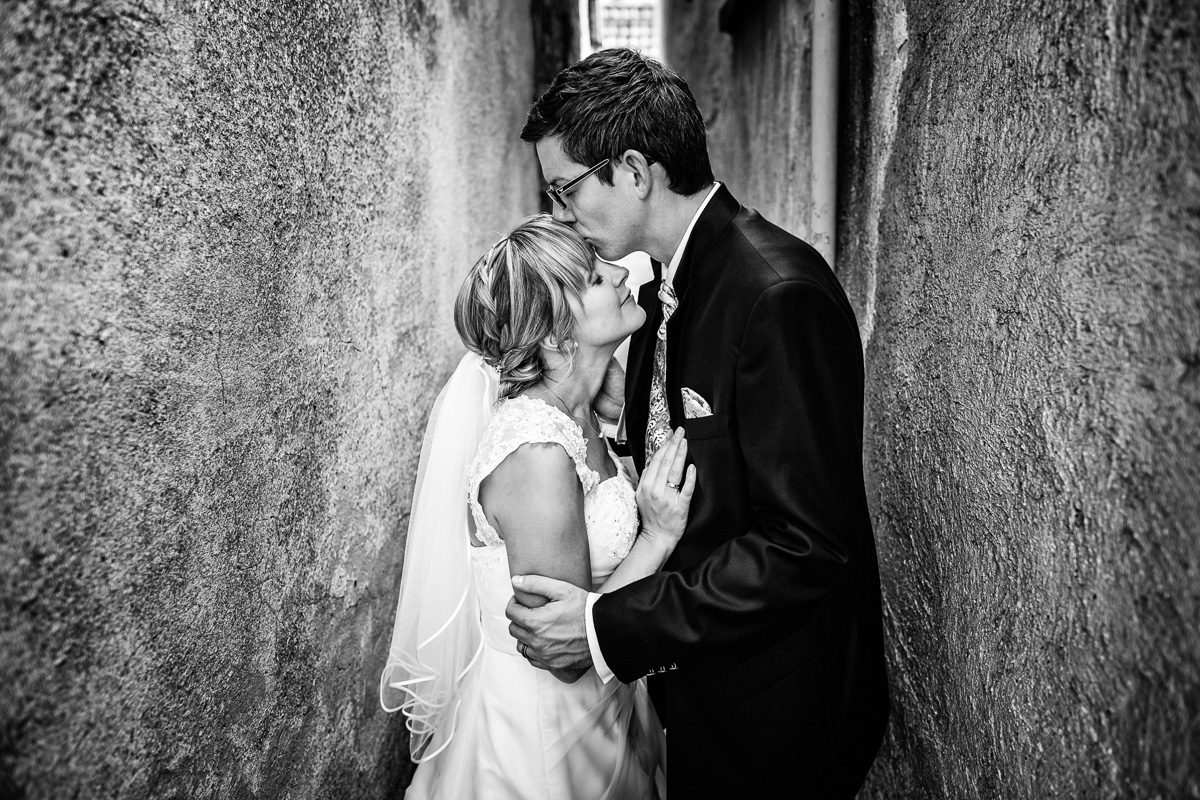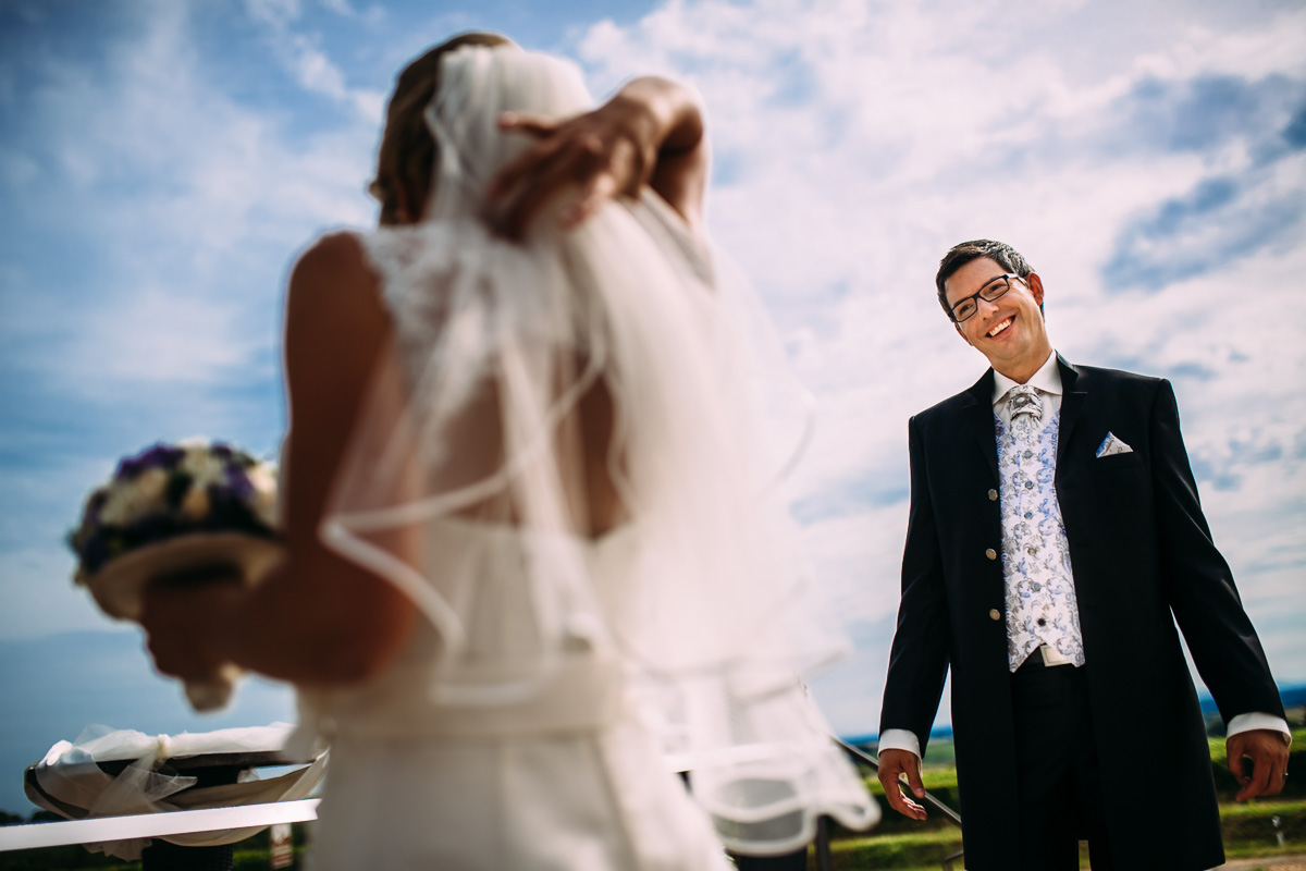 Begonnen hat der Tag in Schweigen-Rechtenbach direkt im Deutschen Weintor, wo sich die beiden zurecht gemacht haben. Dort gibt es ein paar nette Zimmer, die gut für das Brautstyling genutzt werden können. Auch der Bräutigam war bereits vor Ort. Danach ging es für den First Look auf die Sonnen-Terrasse des Restaurant. Anschliessend hatten wir genügend Zeit für einige Portraitfotos rund um das Weintor. Was hat das für eine Riesenspass mit den Zwei gemacht. Die Beiden konnten auch die Zeit sichtlich genießen, die sie bei dem Shooting für sich hatten.
