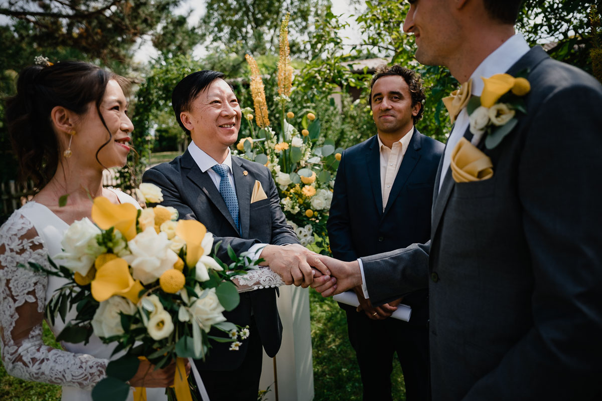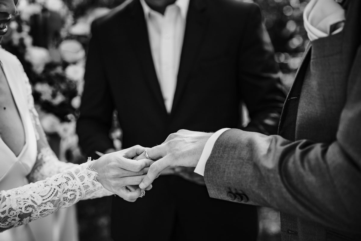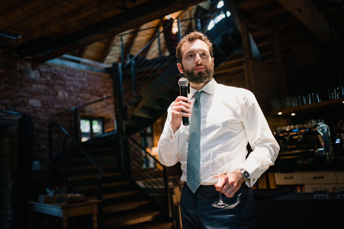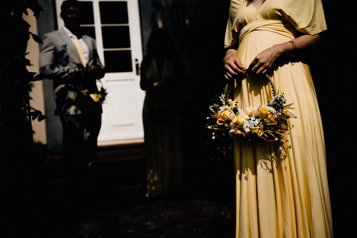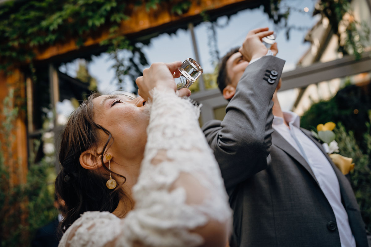 Die eigentliche Hochzeitsfeier fand im Grenzhof statt, wo sich das Paar gemeinsam mit ihren Freunden für den großen Moment vorbereitete. Die freie Trauung im Garten der Location wurde von einem engen Freund des Paares geleitet und war von tiefer Verbundenheit und Freude geprägt. Anschließend wurden Glückwünsche ausgetauscht und beim Sektempfang im Hof auf das Glück des Paares angestoßen.