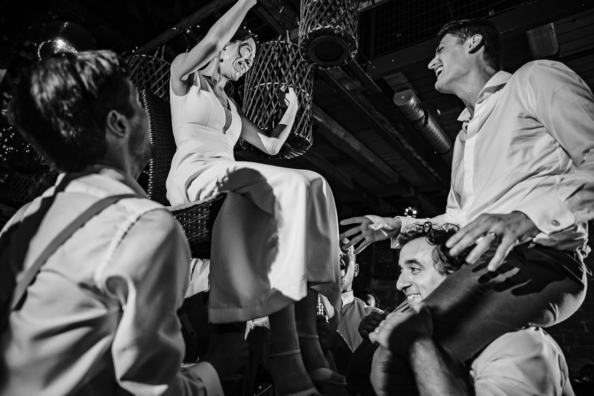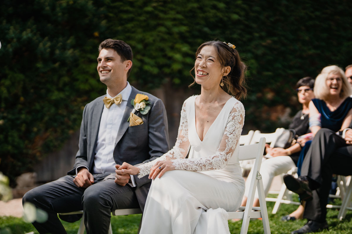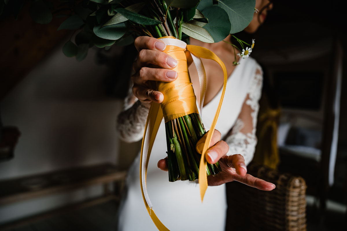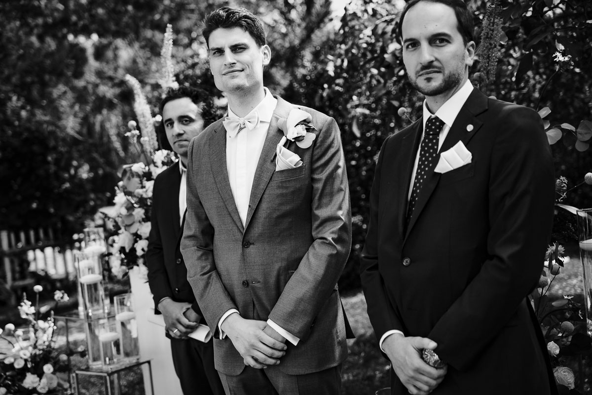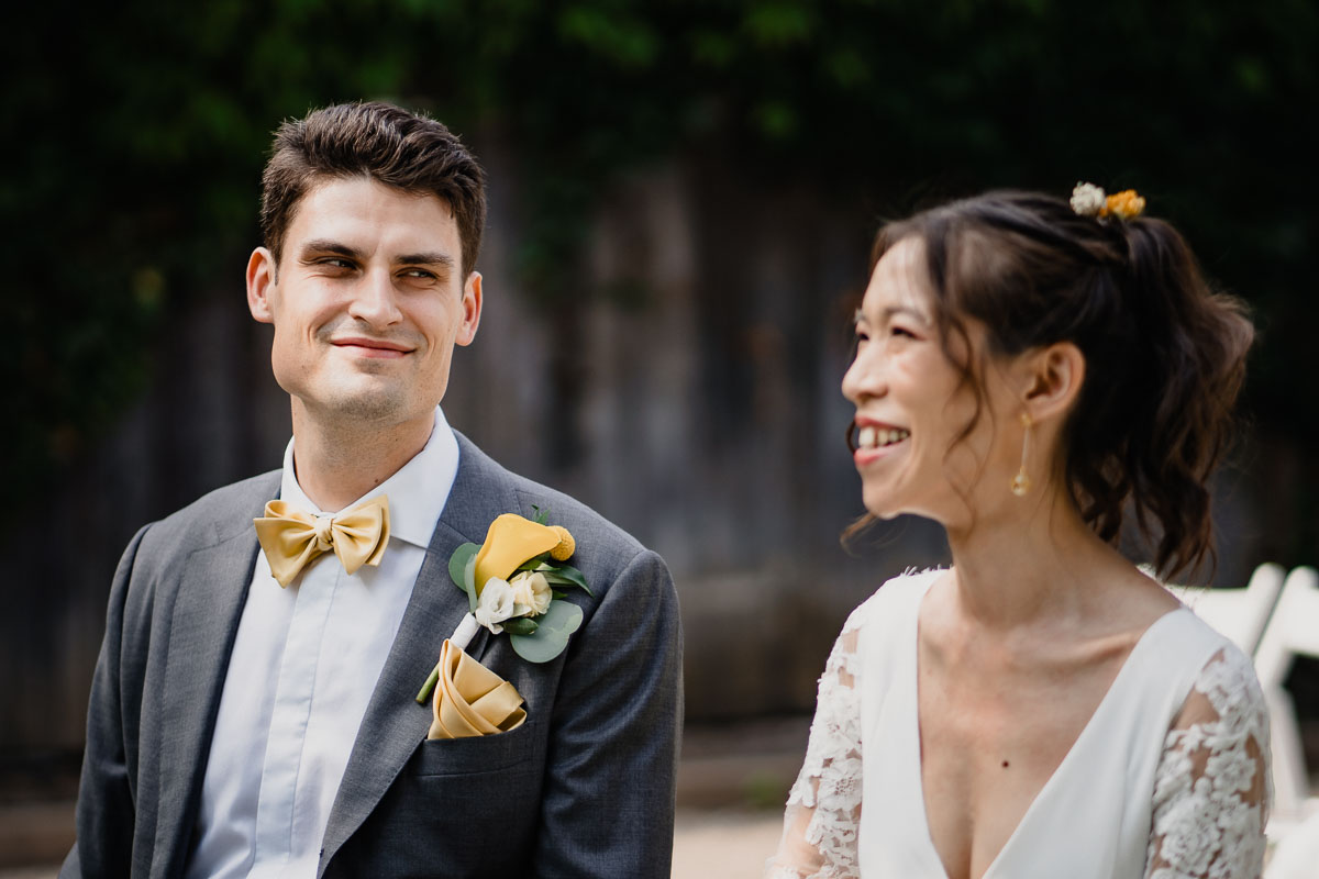Die eigentliche Hochzeitsfeier fand im Grenzhof statt, wo sich das Paar gemeinsam mit ihren Freunden für den großen Moment vorbereitete. Die freie Trauung im Garten der Location wurde von einem engen Freund des Paares geleitet und war von tiefer Verbundenheit und Freude geprägt. Anschließend wurden Glückwünsche ausgetauscht und beim Sektempfang im Hof auf das Glück des Paares angestoßen.